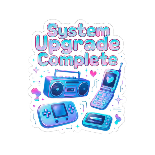 Retro Tech Kiss-Cut Sticker – "System Upgrade Complete" Vaporwave Gaming Laptop Decal