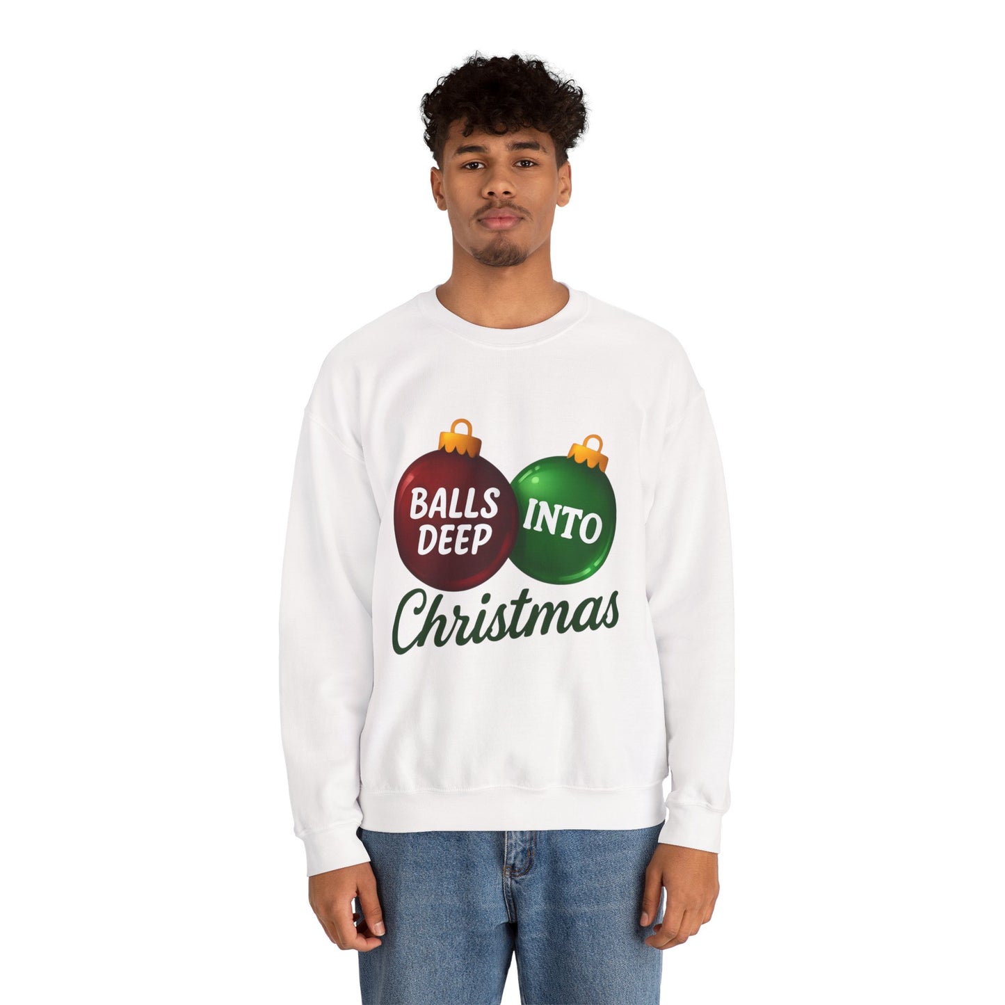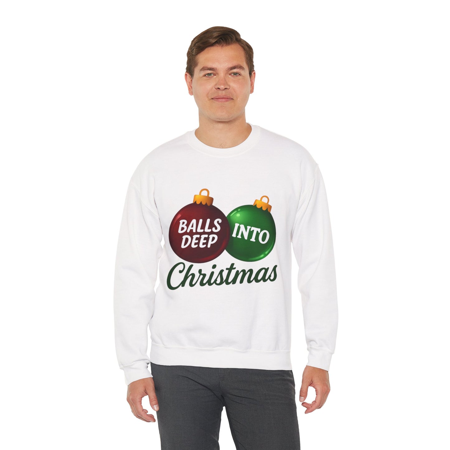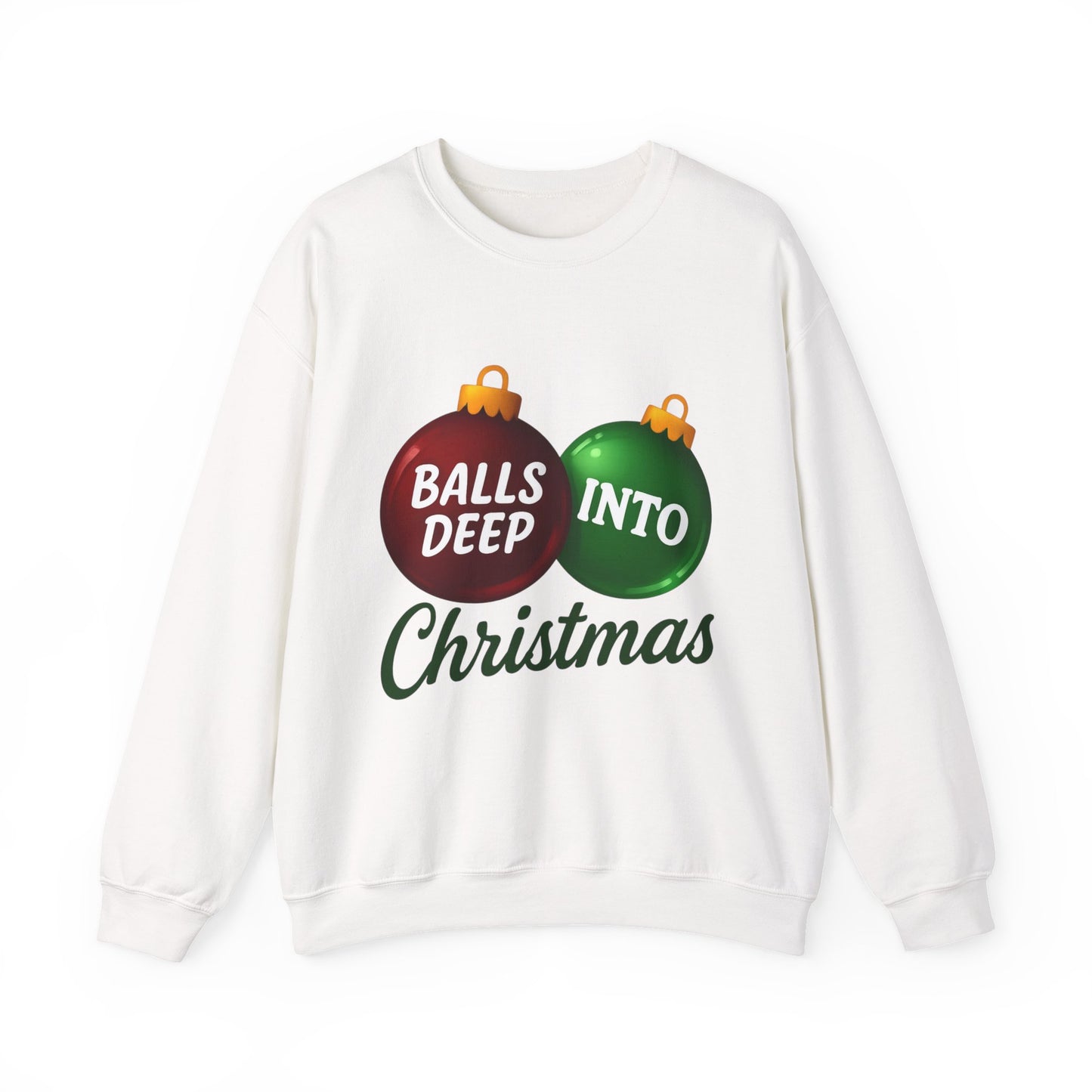 Embrace the edgy humor of the holidays with this unique sweatshirt! This design features two glossy Christmas ornament baubles, with 'BALLS DEEP' and 'INTO' playfully written inside, and a stylish 'Christmas' underneath. It's the perfect funny gift for those who love a little irreverence during the festive season. Made with comfortable, high-quality materials, this sweatshirt is sure to be a conversation starter.