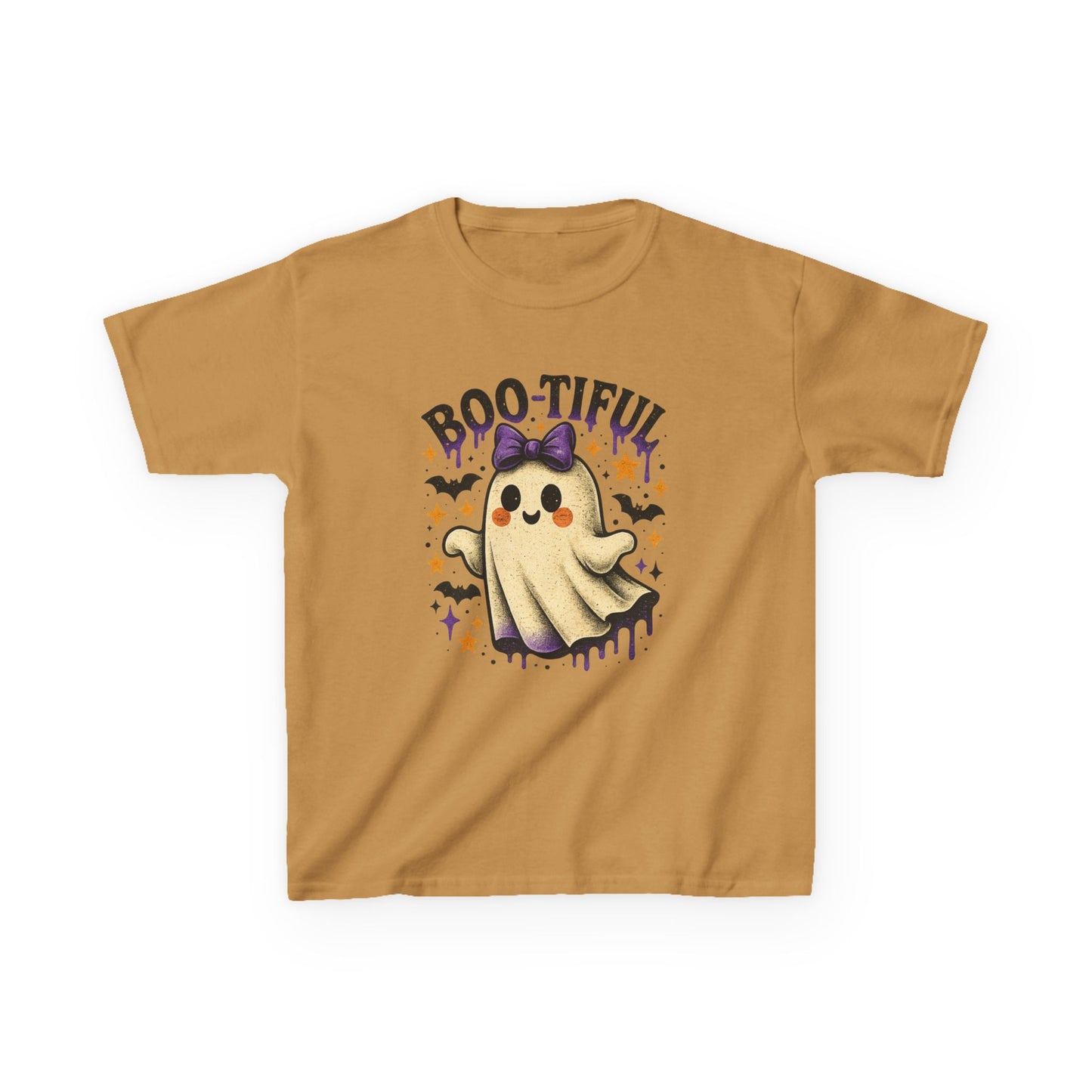 Get ready for Halloween with this adorable "BOO-TIFUL" ghost tee! Featuring a friendly ghost with a vintage aesthetic, complete with a purple bow, rosy cheeks, and playful bats and stars. Made from soft, comfortable fabric, this tee is perfect for parties, trick-or-treating, or everyday wear. The unique design combines spooky fun with a touch of sweetness, making it a great gift for kids!