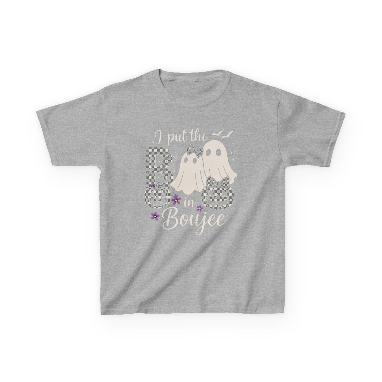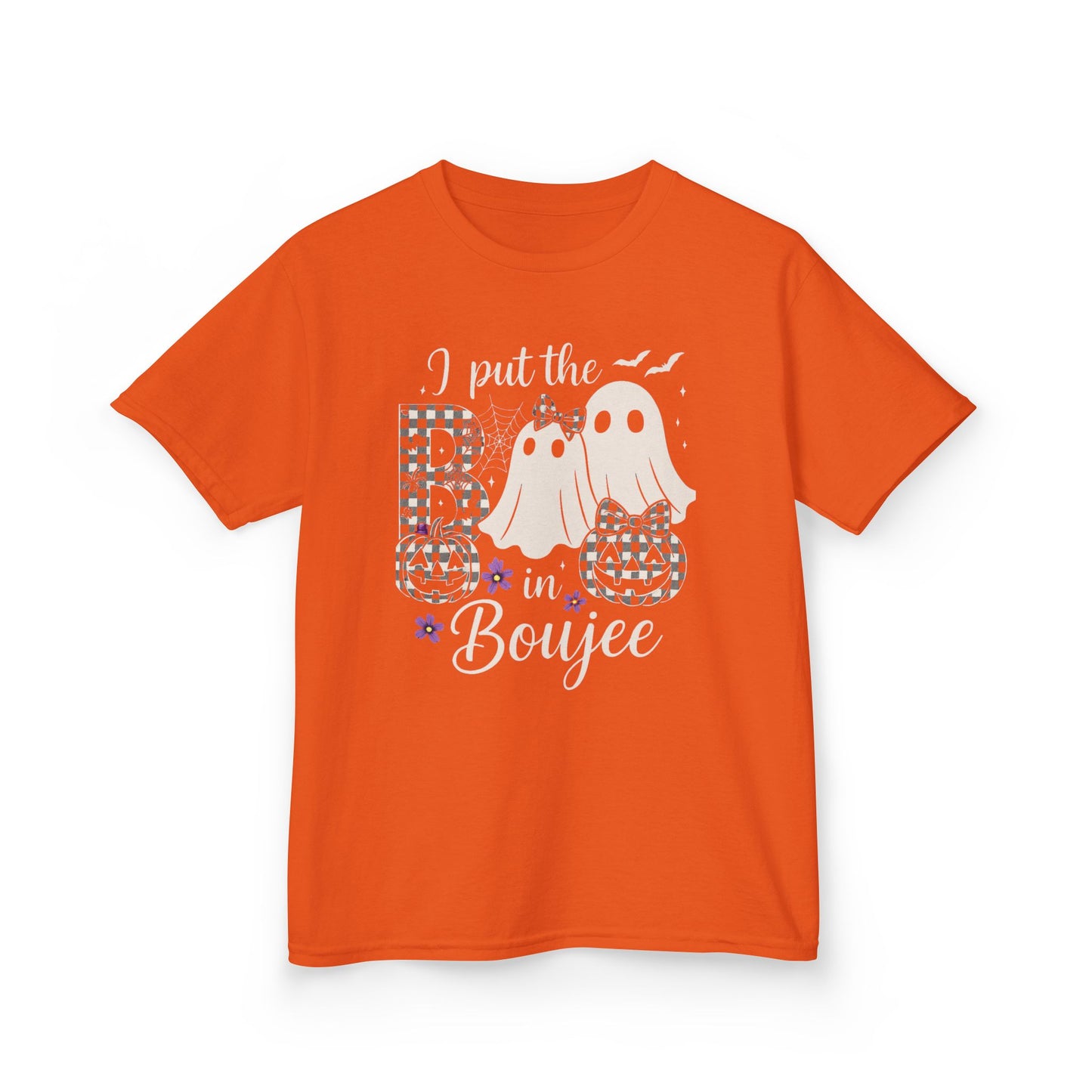 Get ready for a spooktacular Halloween with this adorable tee! Featuring a whimsical design with checkerboard ghosts, jack-o'-lanterns, and bats. The playful "I put the B in Boujee" message adds a touch of fun and flair. Made with soft, comfortable fabric, this tee is perfect for Halloween parties, trick-or-treating, or everyday wear. A cute and stylish gift for any dino-loving kid!
