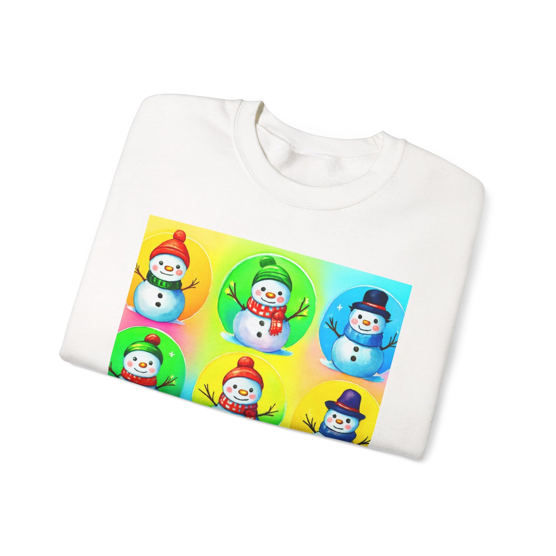 A cozy Unisex Heavy Blend Crewneck Sweatshirt featuring a playful grid of cartoon-style snowmen with holiday-themed accessories. Perfect for those who love snowmen and simple, cartoonish designs. Ideal for adults during the holiday season.