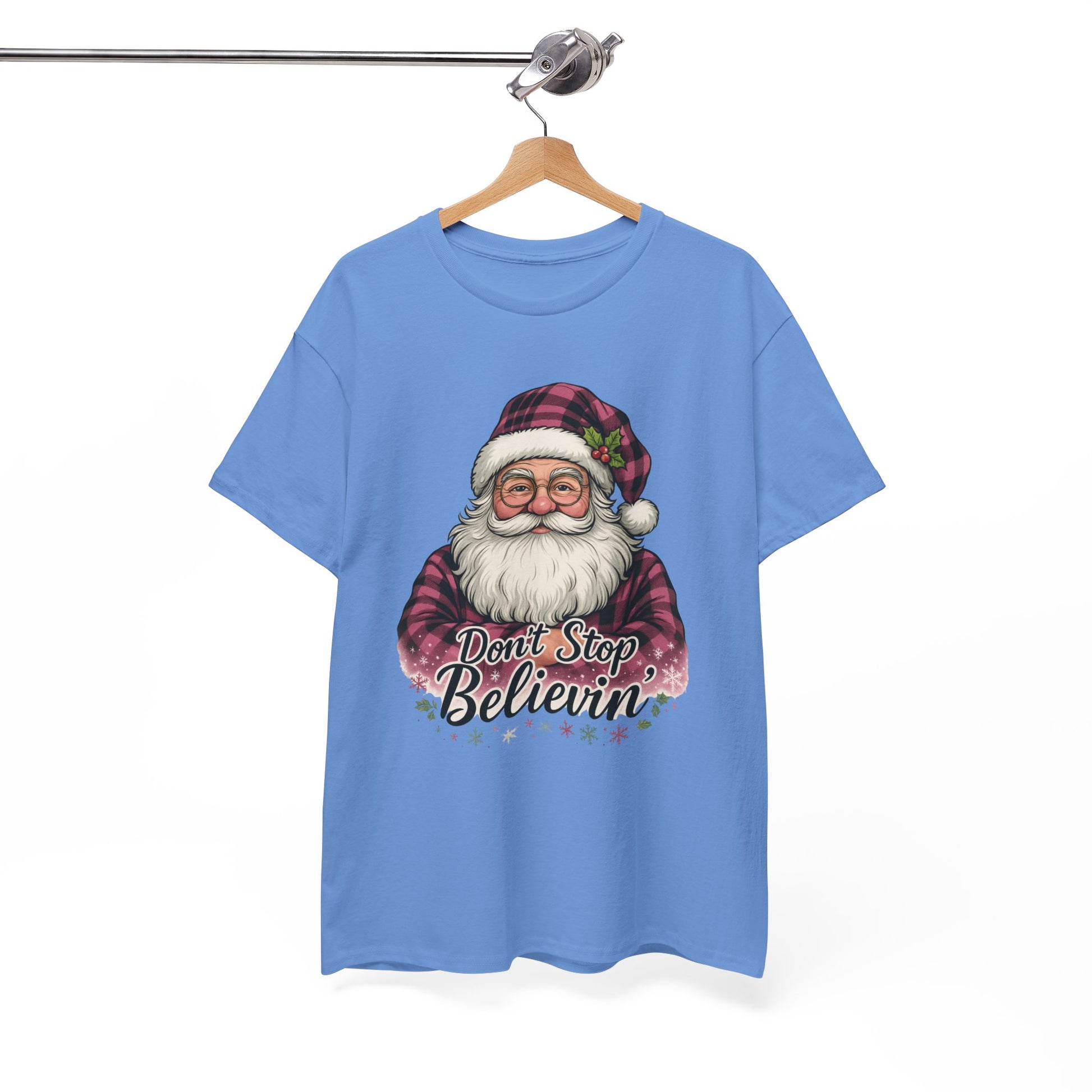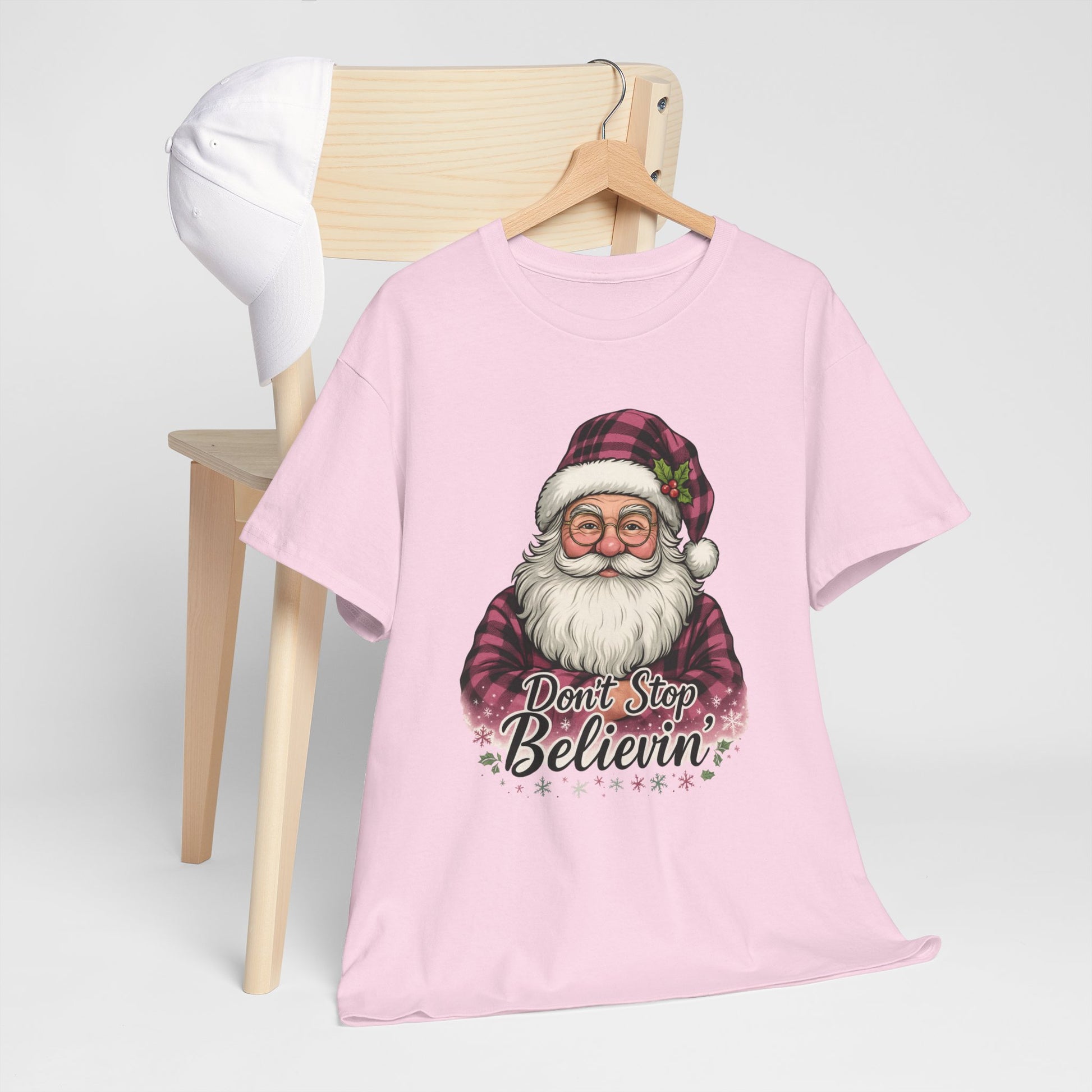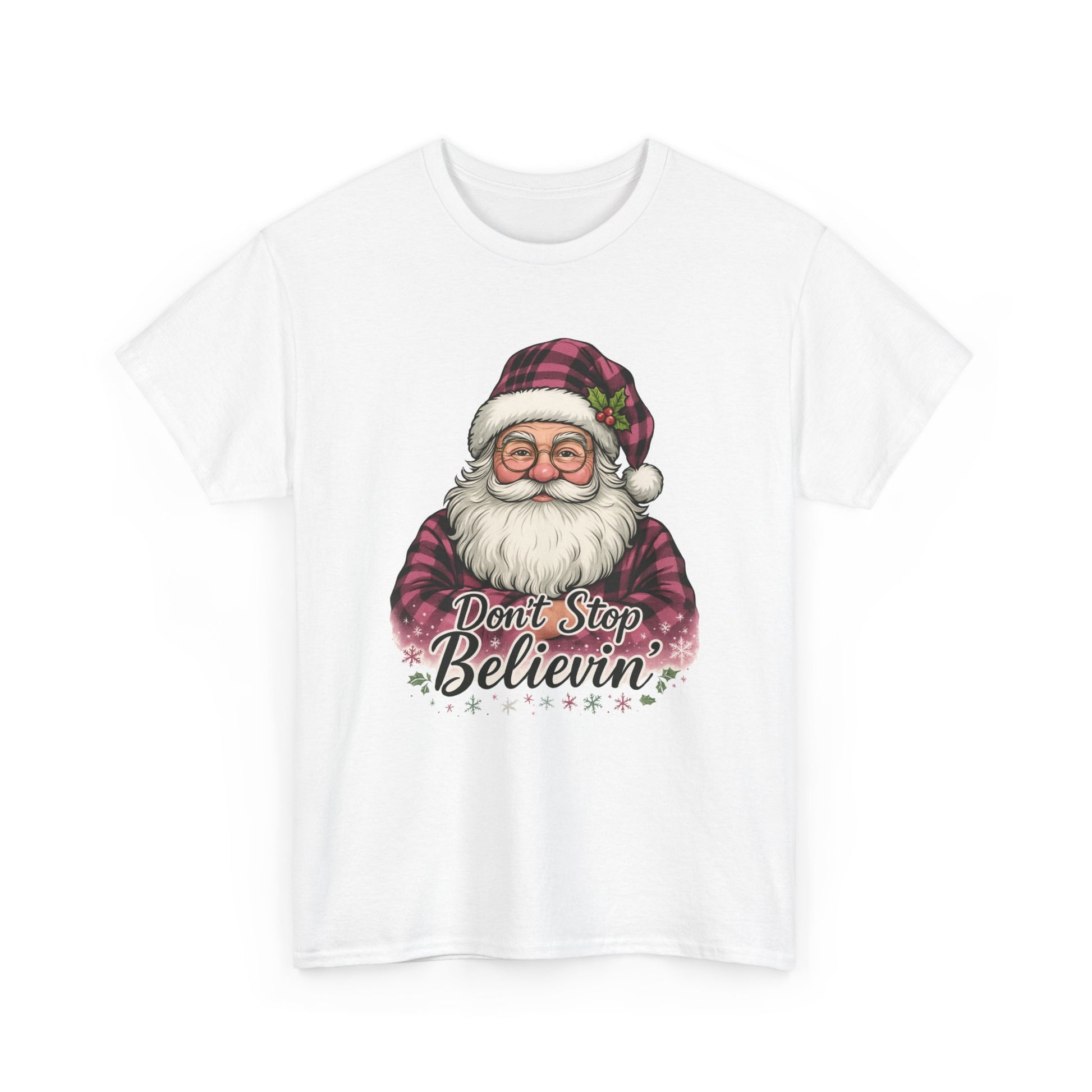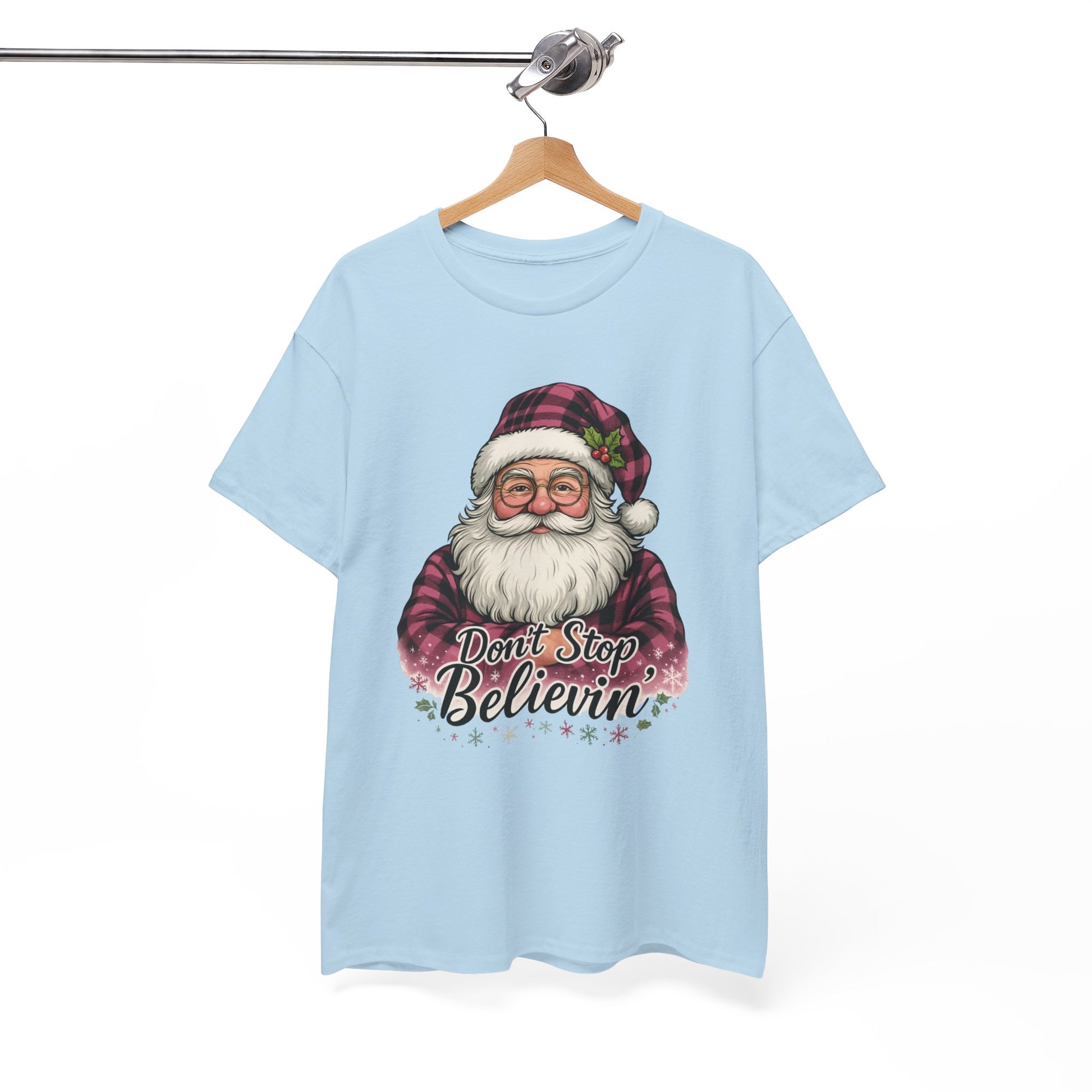 Spread hope and inspiration this holiday season with our unique Santa Claus tee! This digital illustration features a modern Santa in a plaid shirt, proclaiming 'Don't Stop Believin'' across his chest. A warm, inviting tee that makes a thoughtful gift.