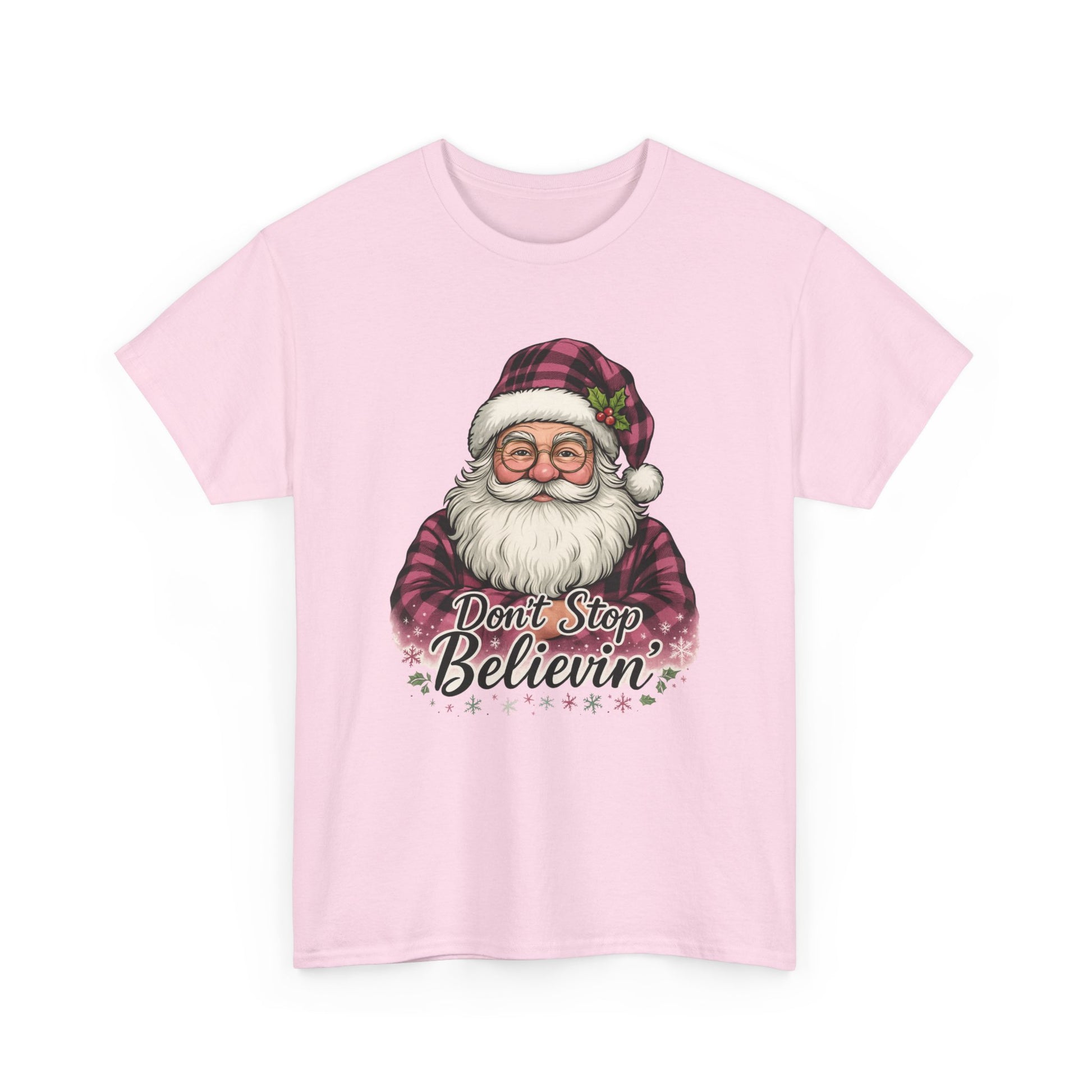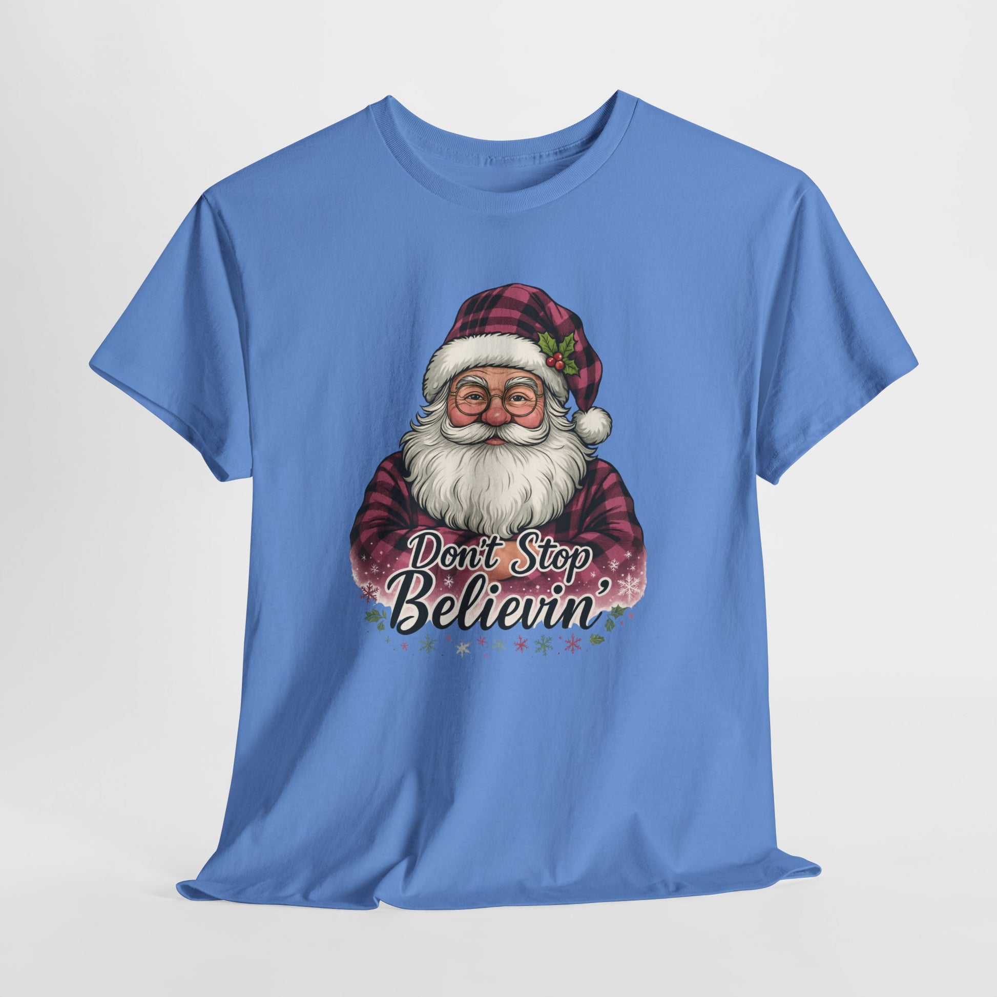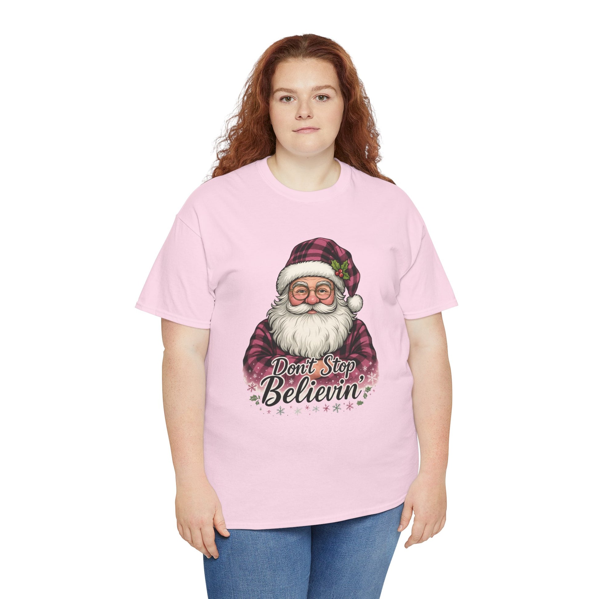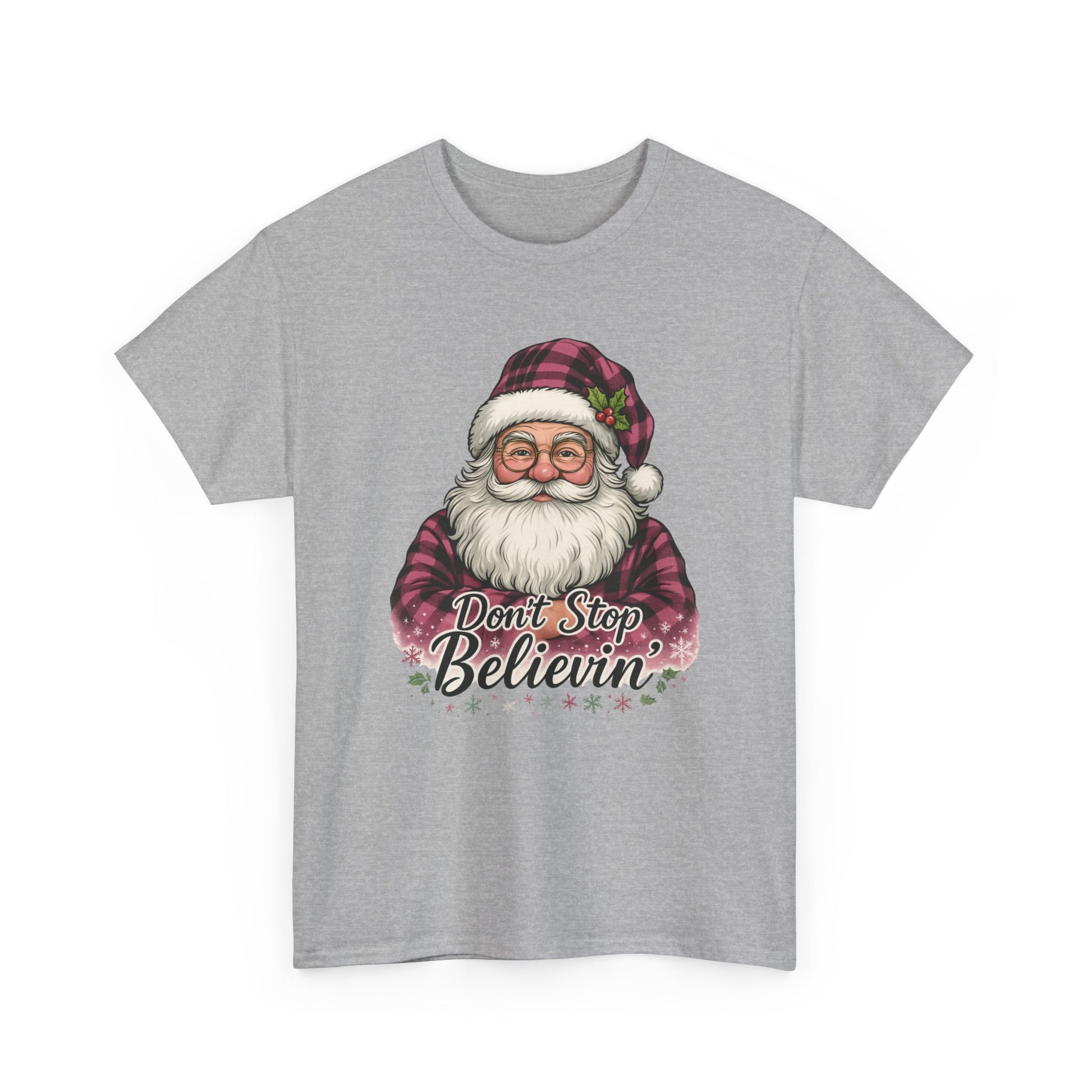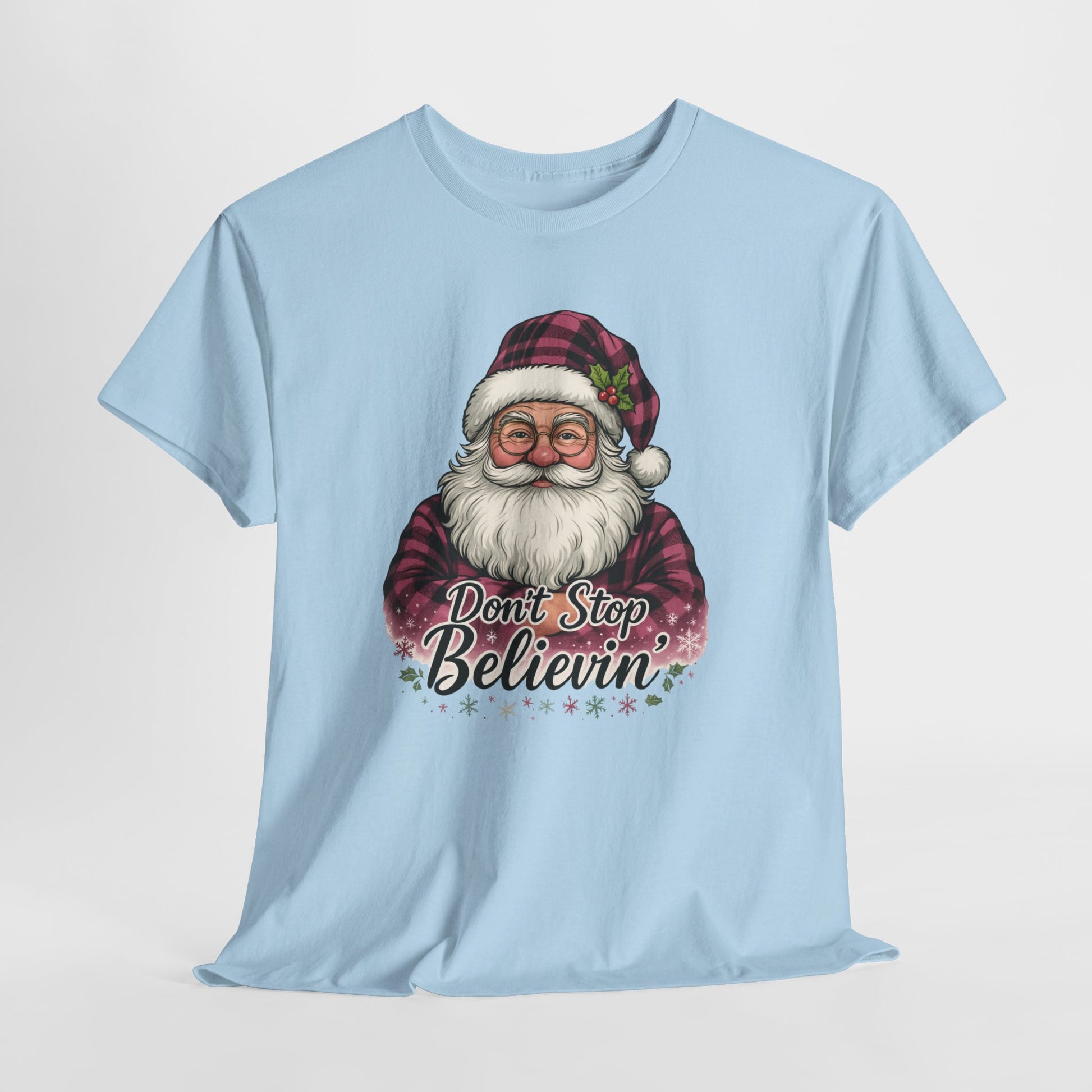 Spread hope and inspiration this holiday season with our unique Santa Claus tee! This digital illustration features a modern Santa in a plaid shirt, proclaiming 'Don't Stop Believin'' across his chest. A warm, inviting tee that makes a thoughtful gift.