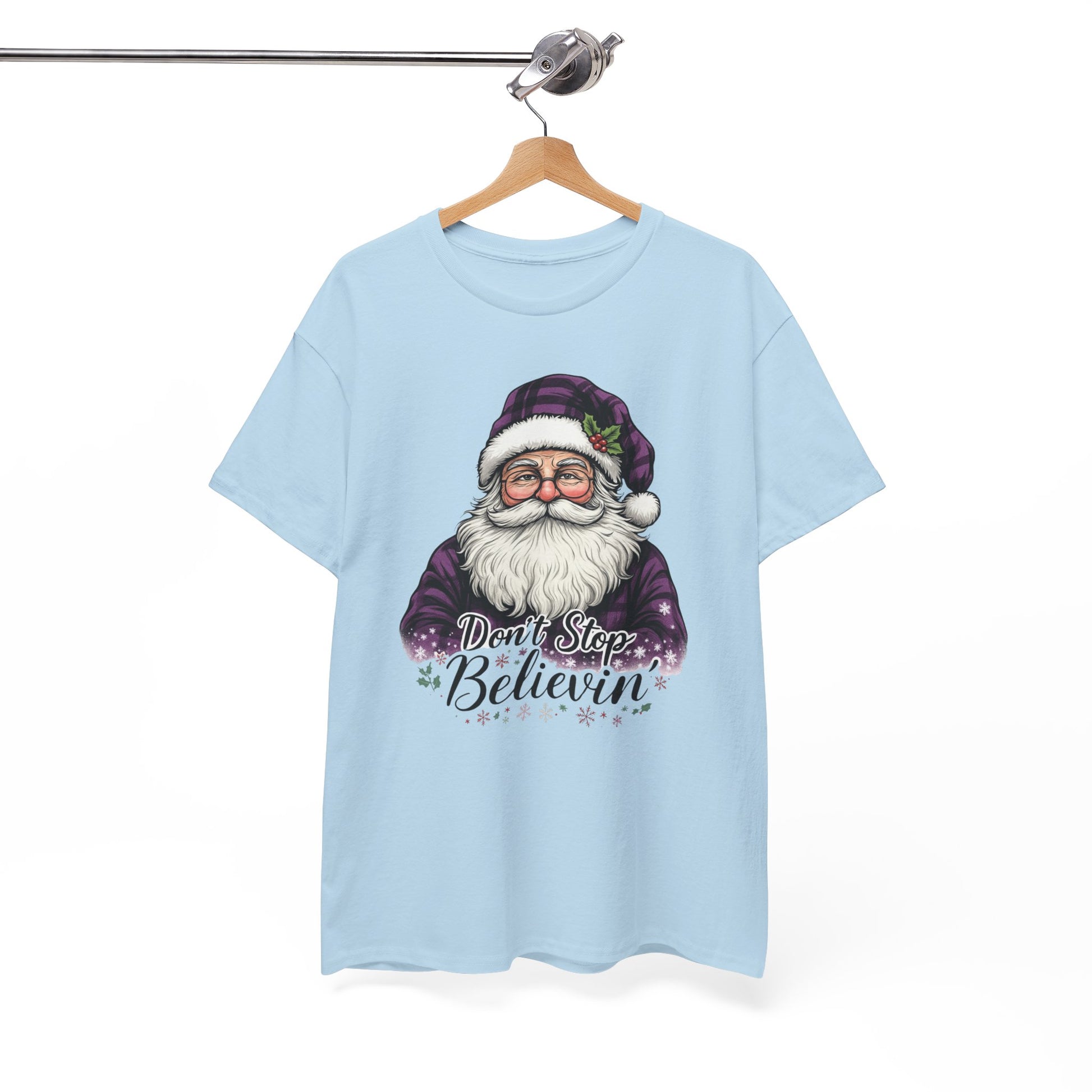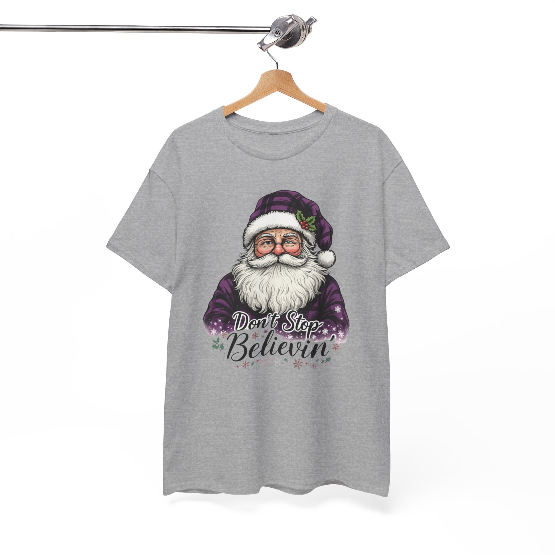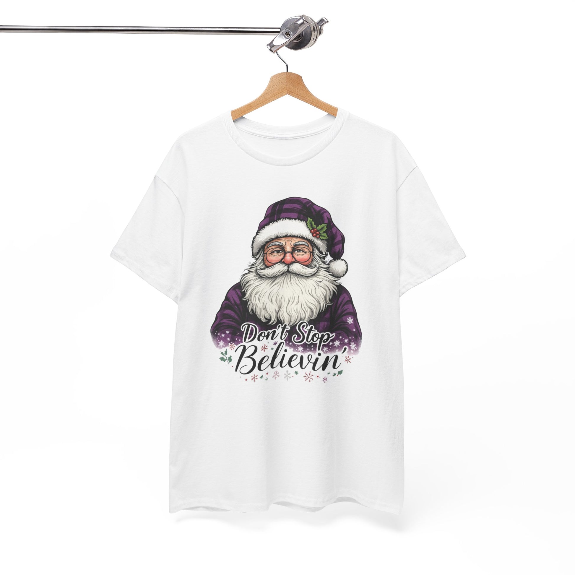 Spread joy this holiday season with our unique "Don't Stop Believin'" Santa tee! Featuring a jolly Santa in festive plaid, this shirt is a perfect gift.
