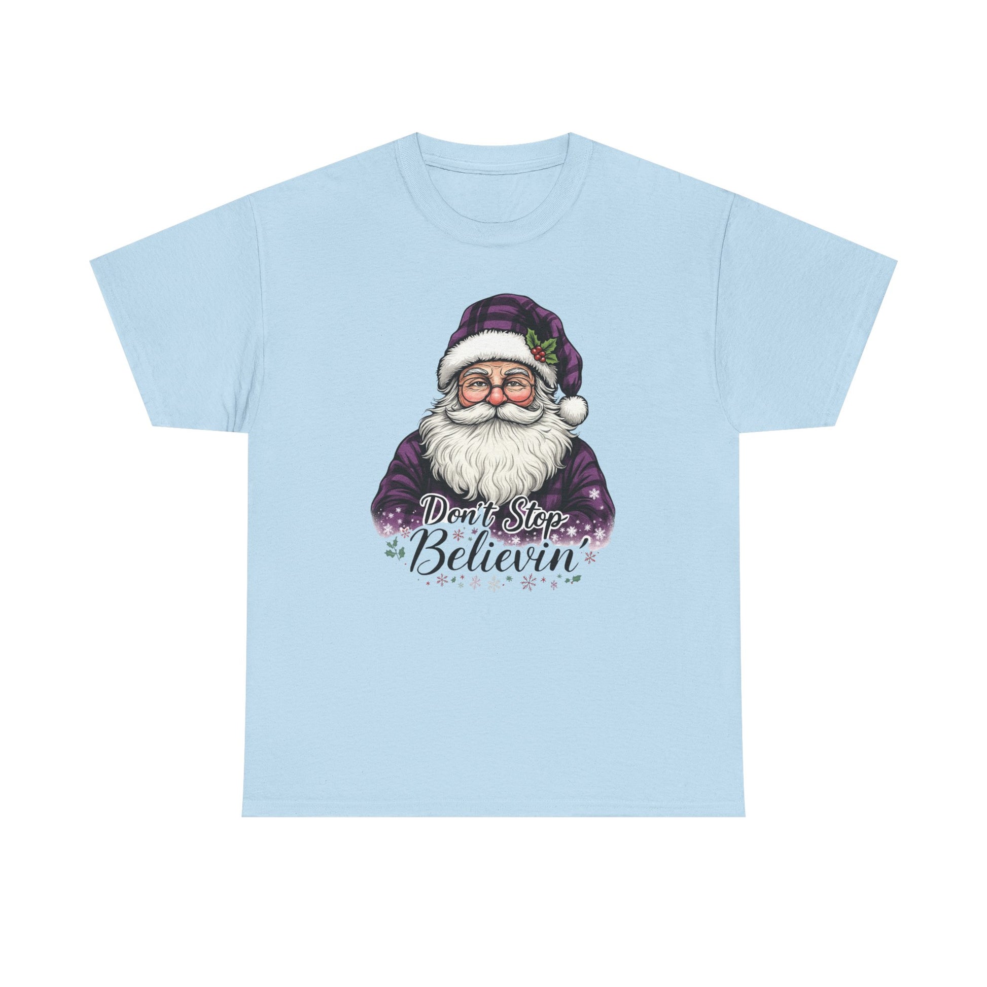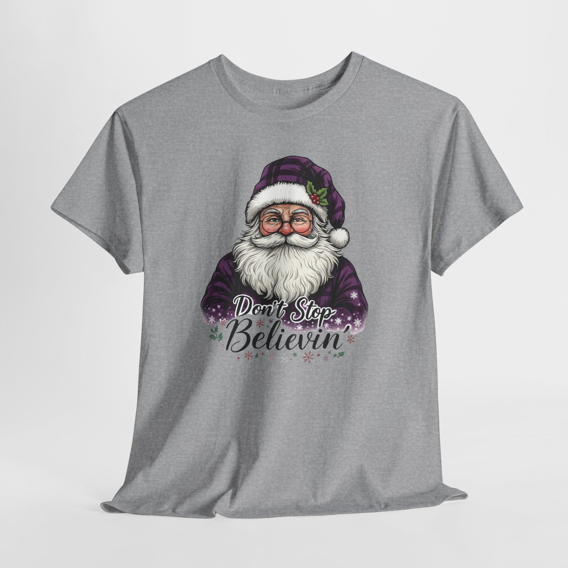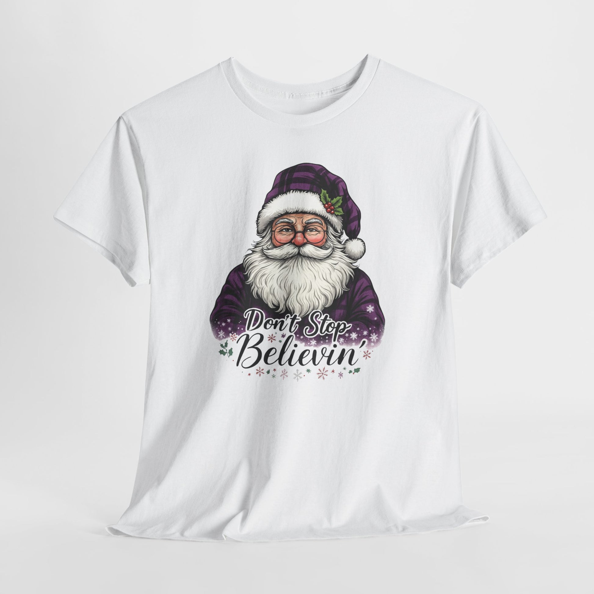 Spread joy this holiday season with our unique "Don't Stop Believin'" Santa tee! Featuring a jolly Santa in festive plaid, this shirt is a perfect gift.