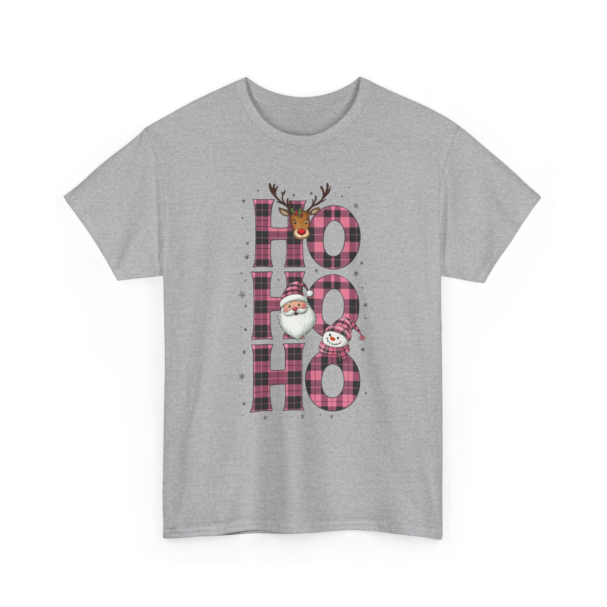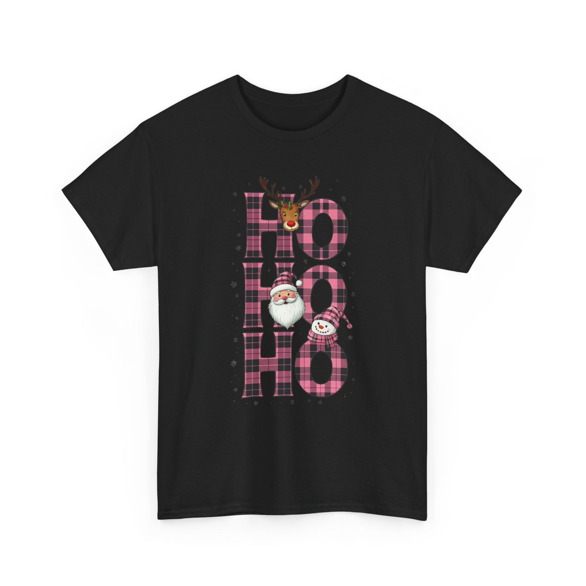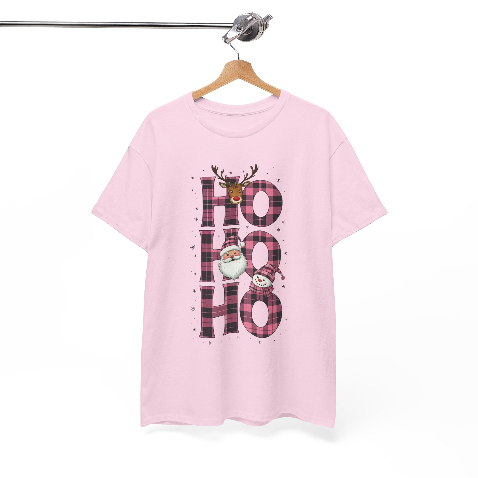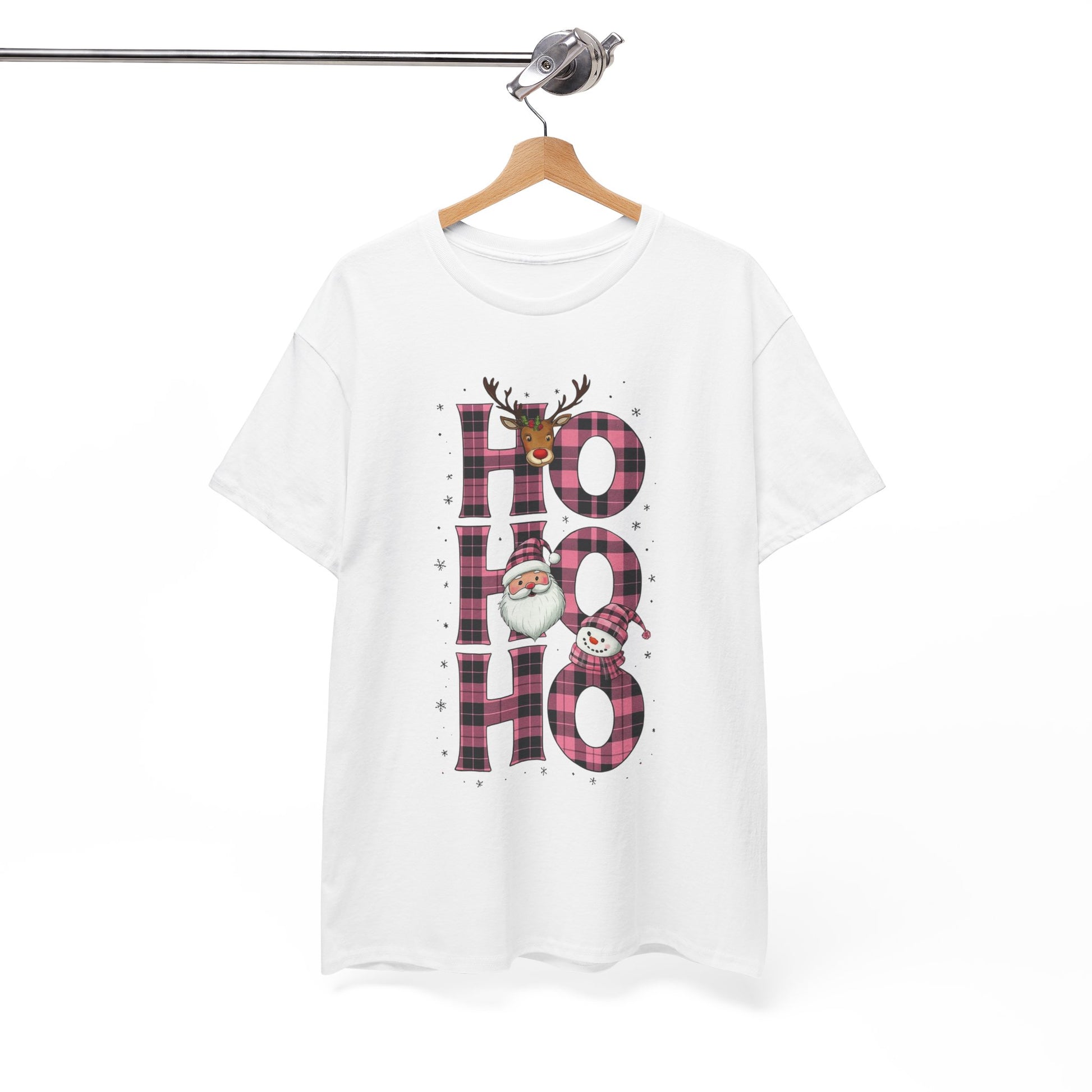 Get into the holiday spirit with this festive tee featuring the iconic 'HO HO HO' in a playful plaid design adorned with Christmas characters like a reindeer, Santa, and a snowman. Perfect for adults looking to add some fun to their holiday wardrobe or spread some festive cheer.
