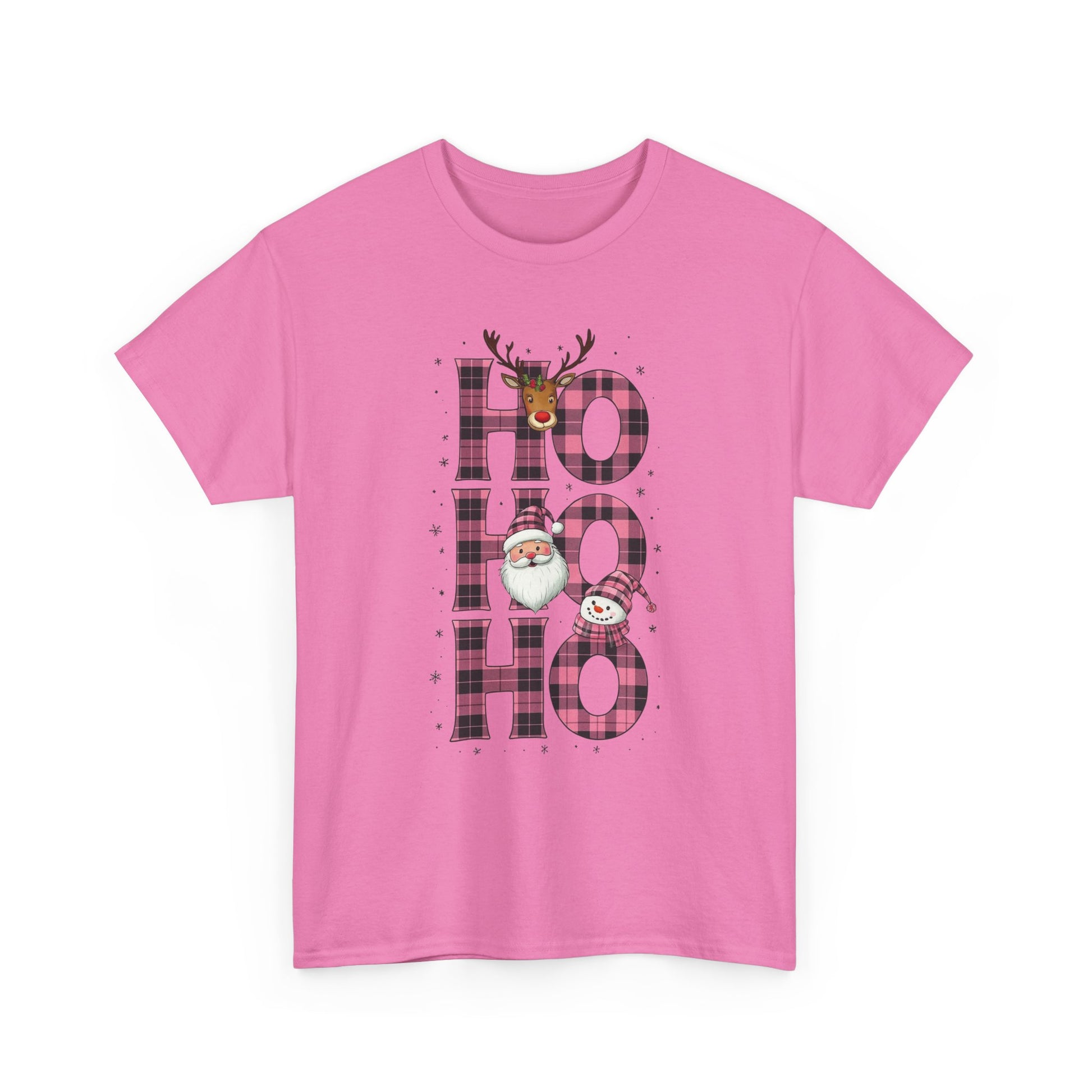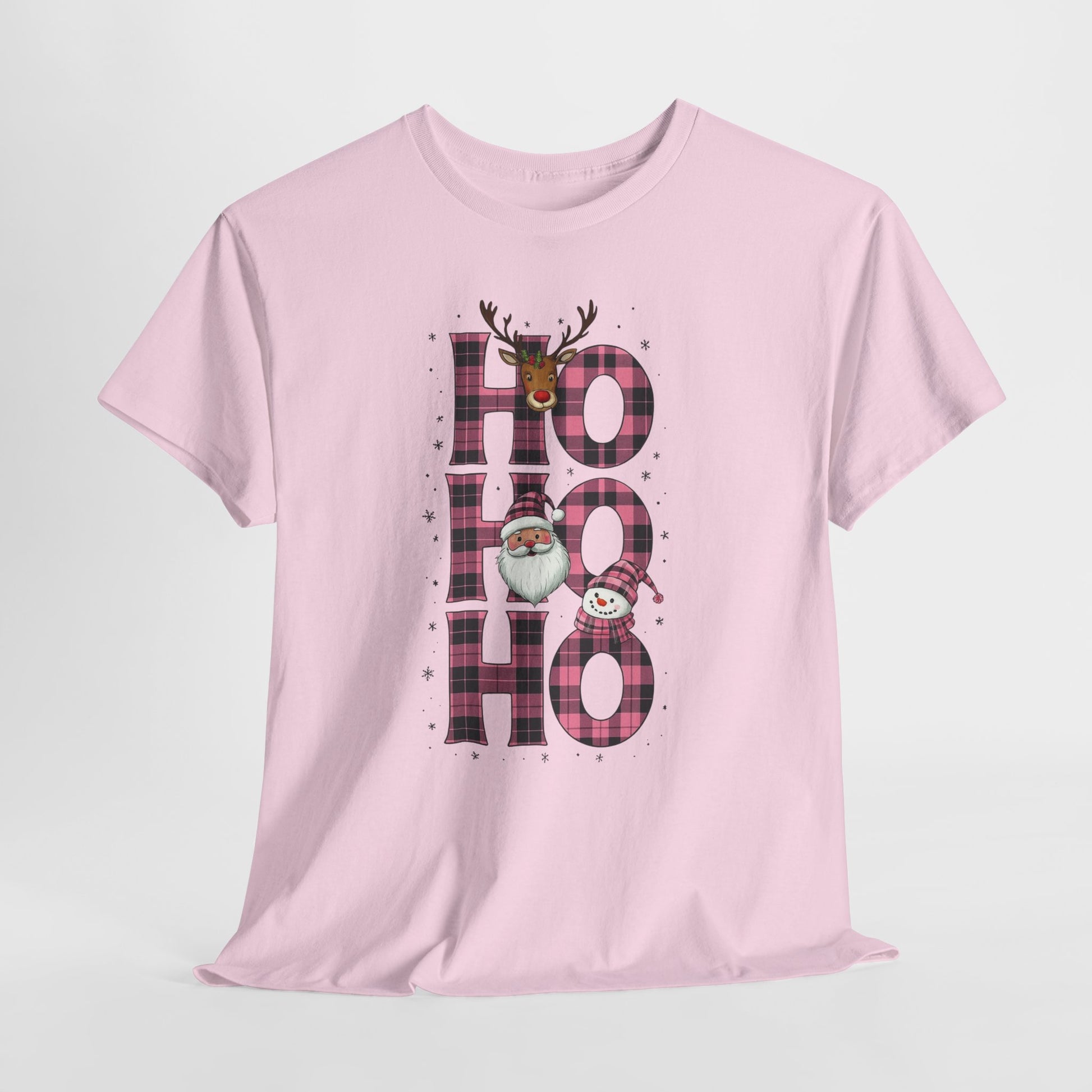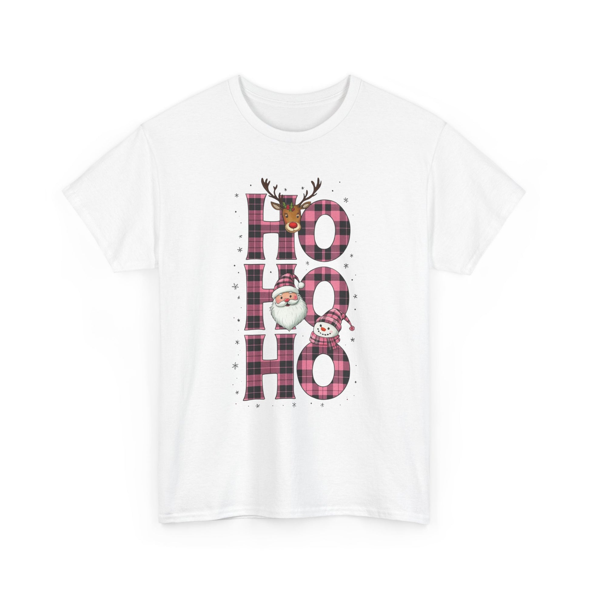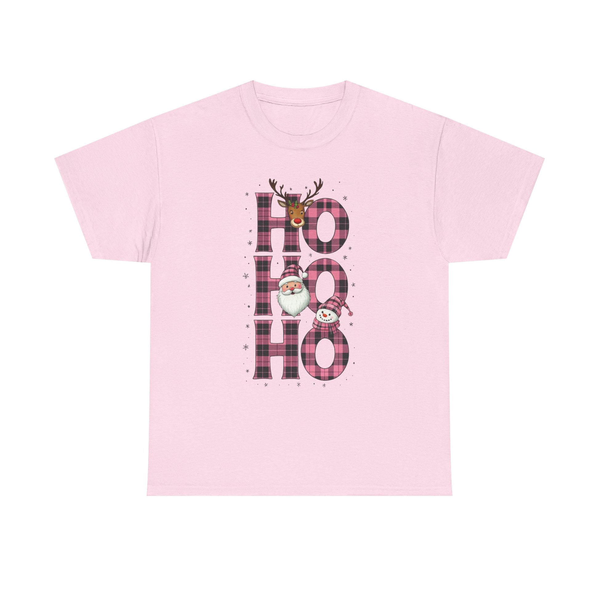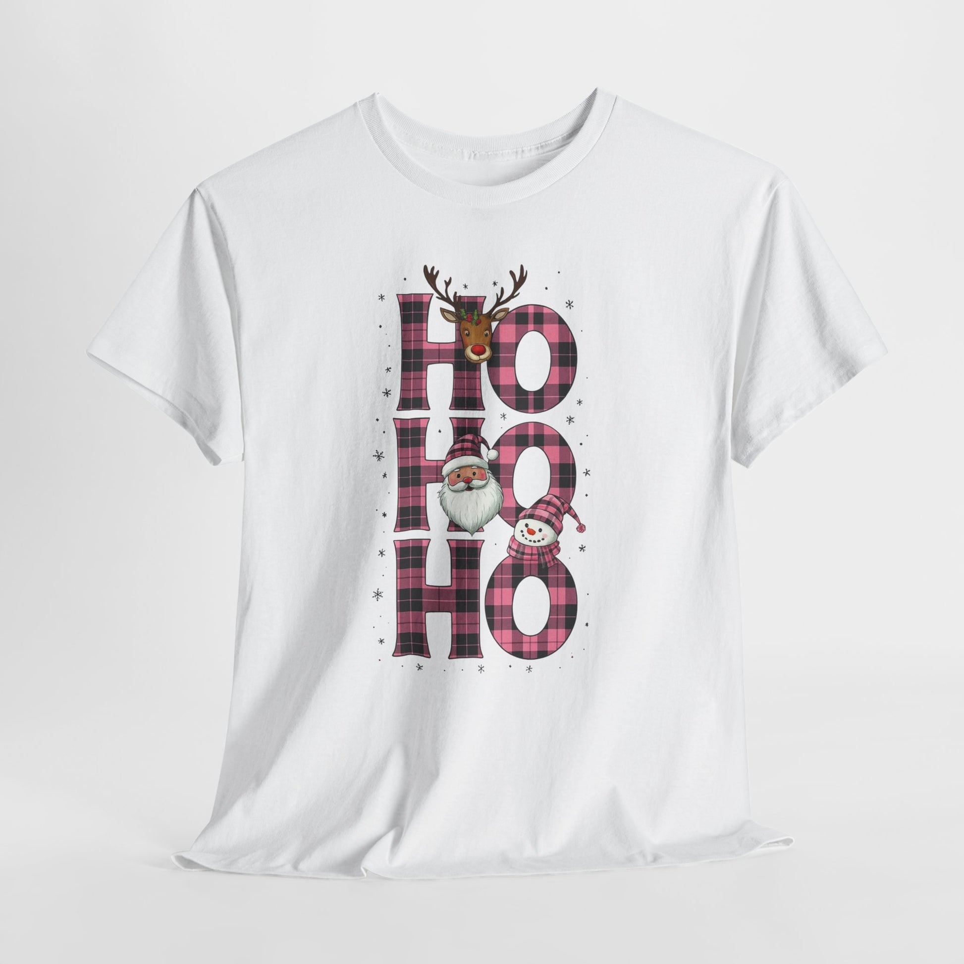 Get into the holiday spirit with this festive tee featuring the iconic 'HO HO HO' in a playful plaid design adorned with Christmas characters like a reindeer, Santa, and a snowman. Perfect for adults looking to add some fun to their holiday wardrobe or spread some festive cheer.