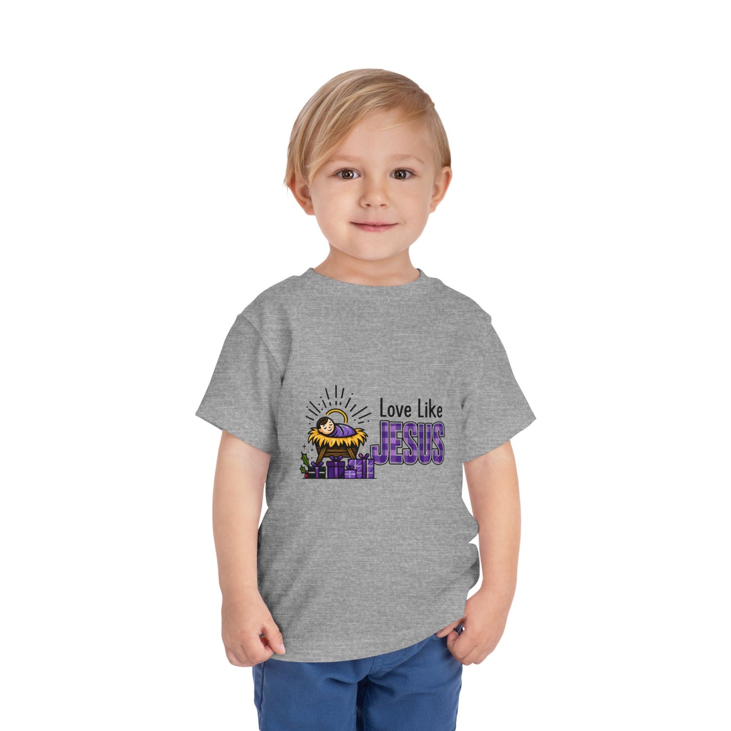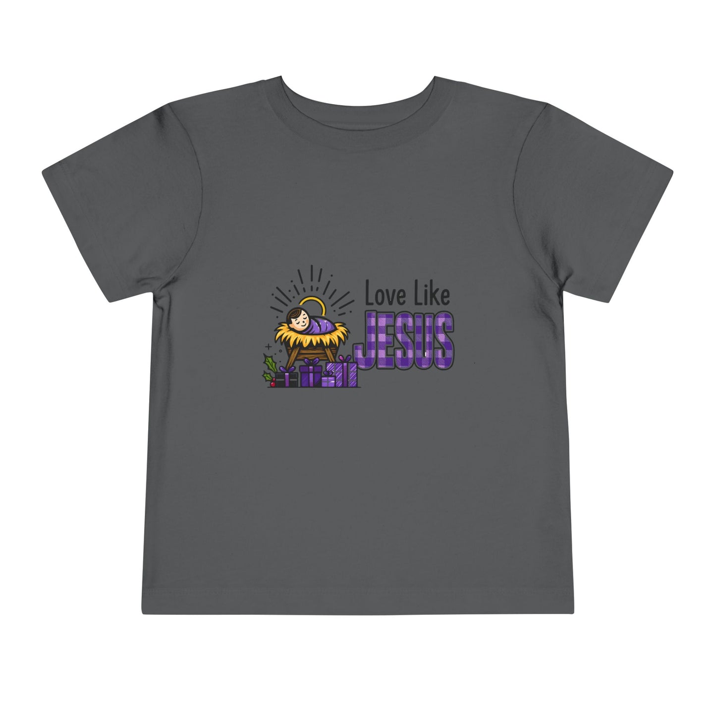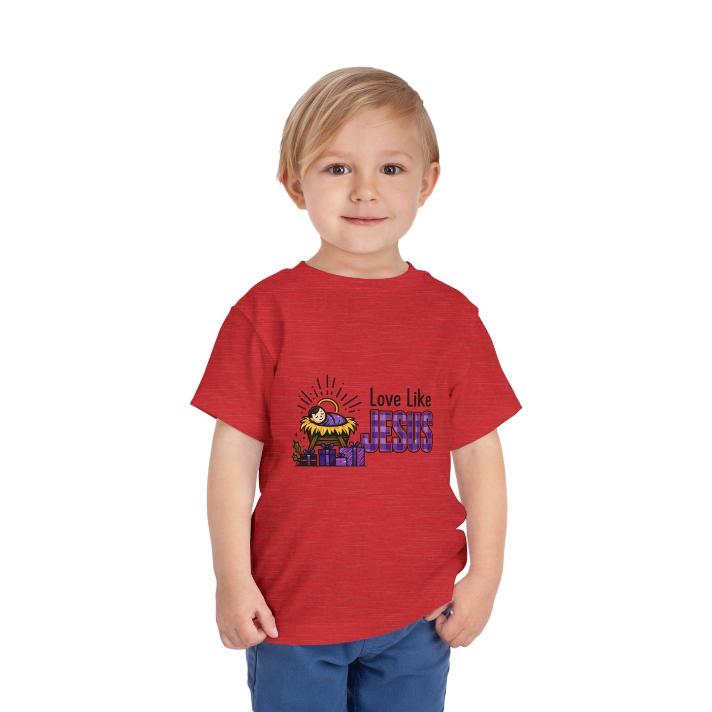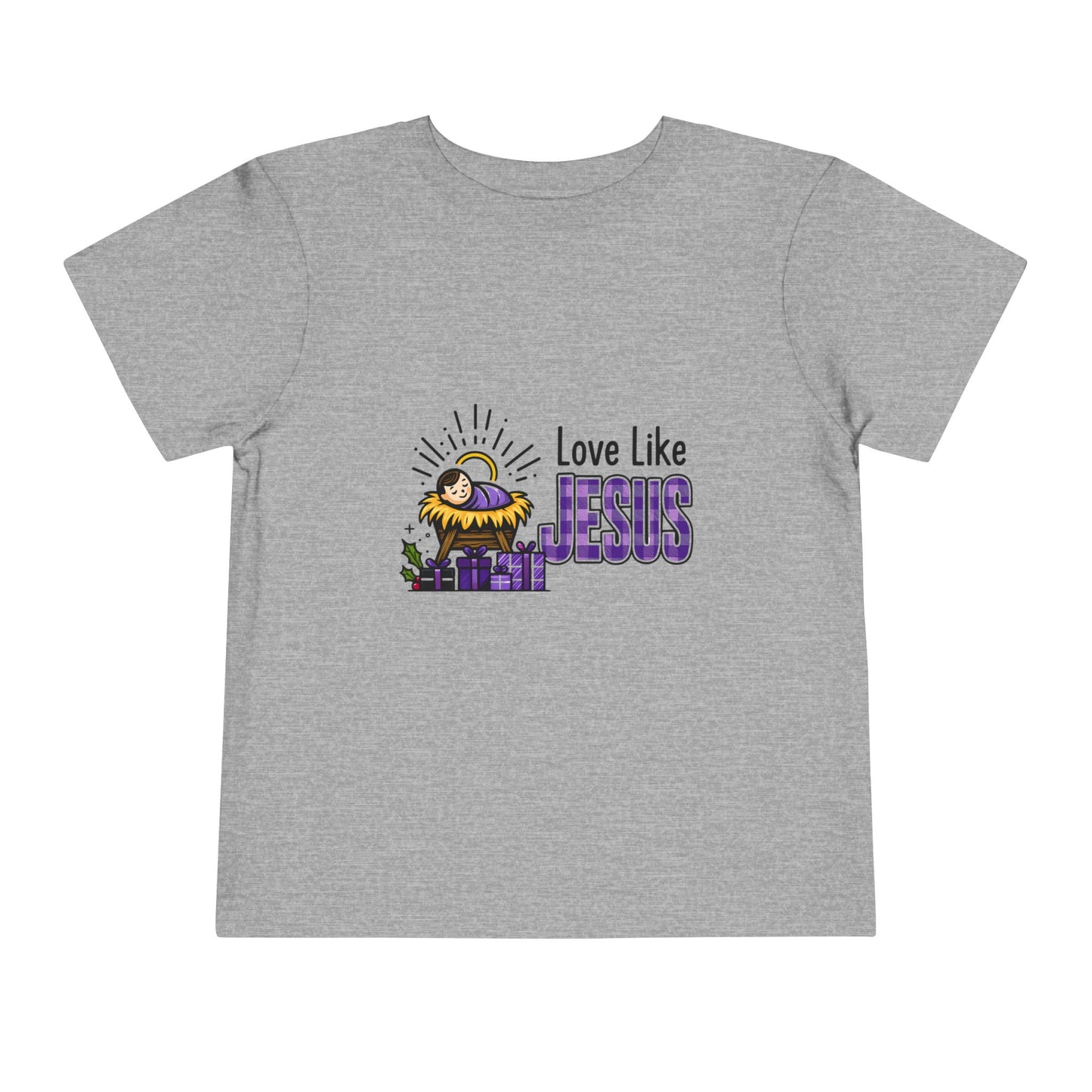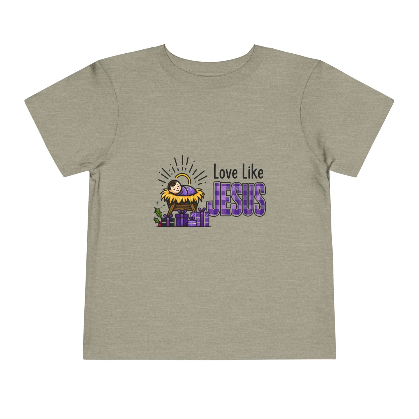 Spread holiday cheer with this adorable toddler Christmas tee! Featuring a festive design with baby Jesus in a manger, gifts and bold "Love Like JESUS" text. This soft, comfortable shirt is perfect for your little one's Christmas outfit and spreading a message of love.