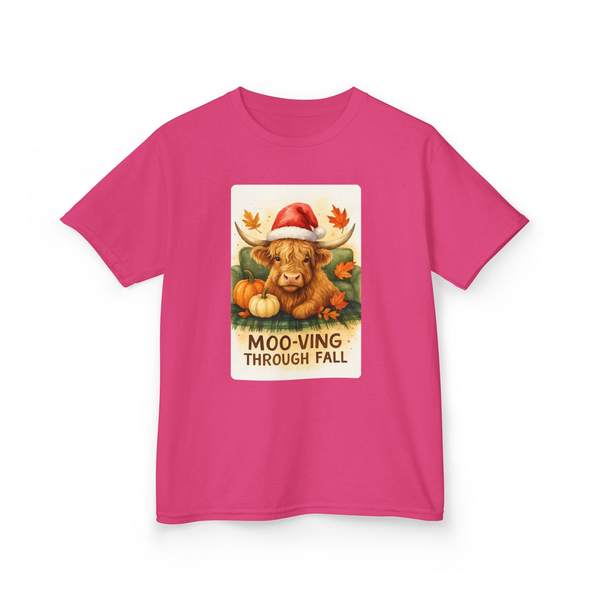 Celebrate the season with this adorable Highland cow t-shirt! Featuring a charming watercolor illustration of a Highland cow in a Santa hat, relaxing in an armchair amidst fall leaves and pumpkins. The shirt is perfect for kids who love cute and festive designs, ideal for autumn and holiday celebrations, or as a fun gift. Made from soft, comfortable material, this tee is sure to become a favorite this fall and winter. The "MOO-VING THROUGH FALL" text adds a playful touch.