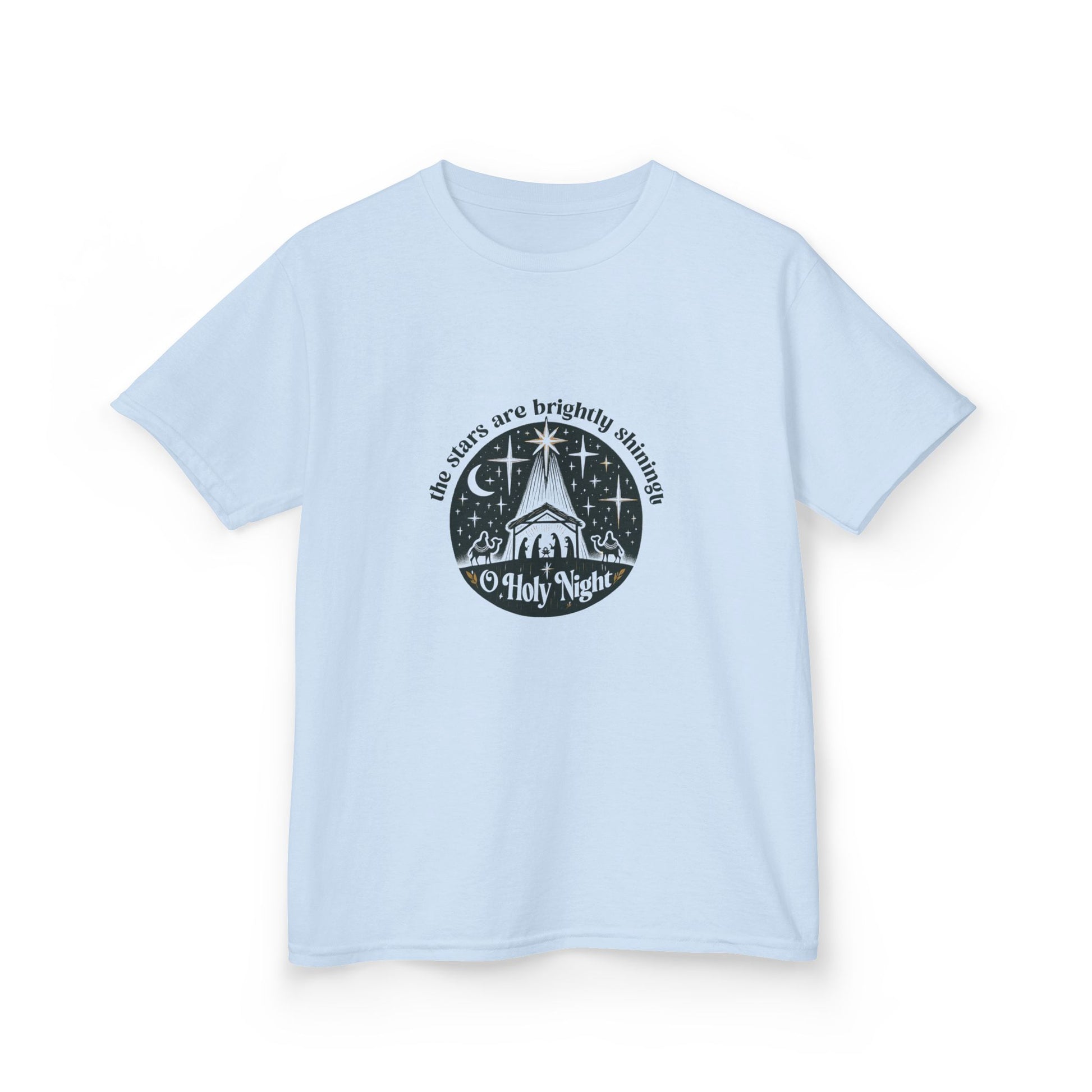 Celebrate the season with our festive 'O Holy Night' t-shirt! Featuring a charming silhouette Nativity scene with a dinosaur twist, it's perfect for kids. This soft and comfortable tee showcases a vintage-inspired design with a dark teal night sky, stars, and a beautiful crescent moon. The circular artwork includes elegant lettering, making it a unique and heartwarming addition to your child's Christmas wardrobe. A perfect gift for little ones who love dinosaurs and Christmas!