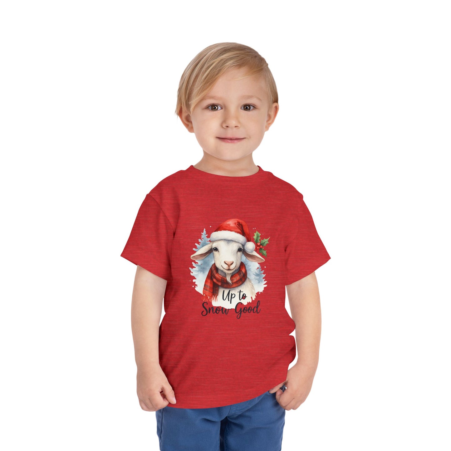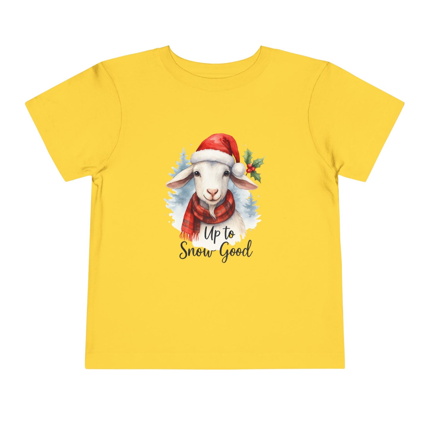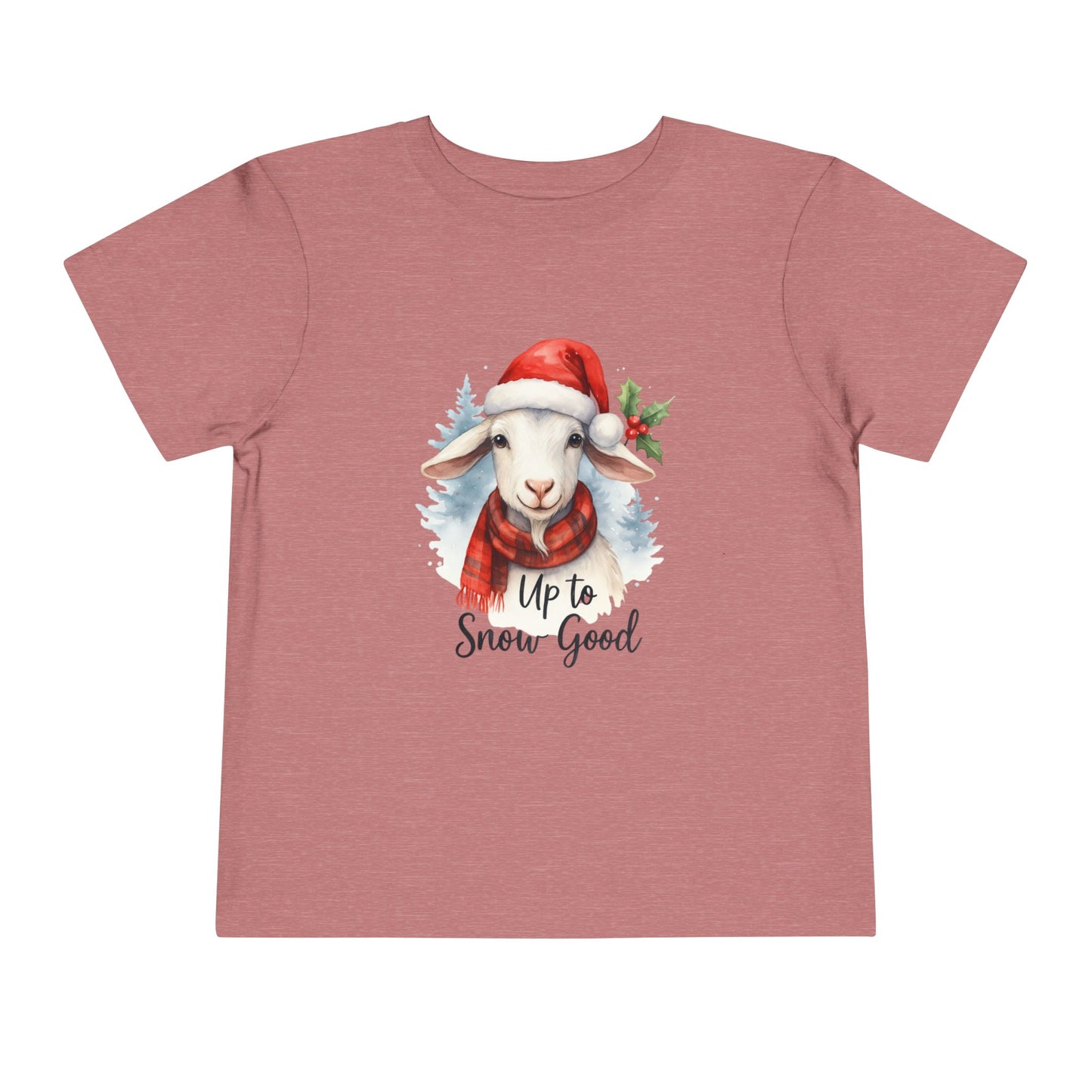 Spread holiday cheer with this adorable watercolor-style Christmas tee! Featuring a festive goat in a Santa hat and scarf, it's perfect for your little one. The 'Up to Snow Good' pun adds a touch of fun. Made from soft, comfortable material.