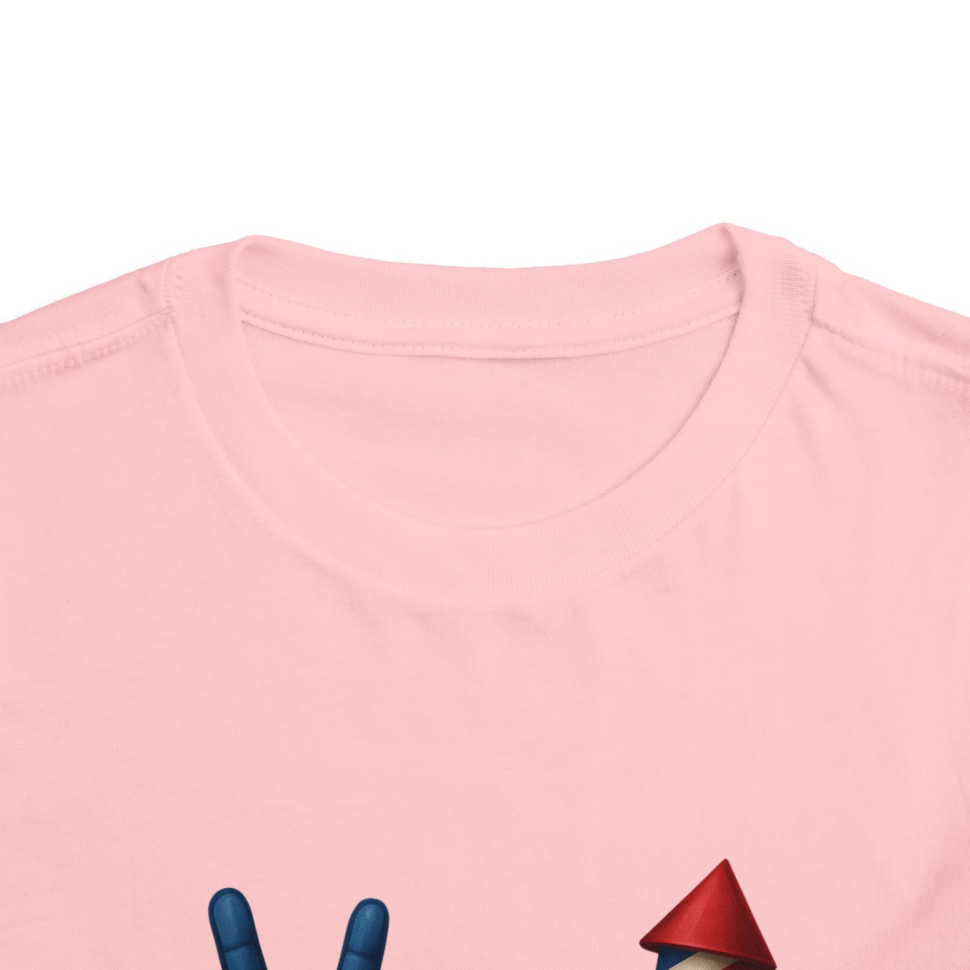 Celebrate the 4th of July in style with this adorable toddler tee! Featuring a patriotic peace sign hand, a heart-shaped American flag, and a festive firework design, this shirt is perfect for your little one. Made with soft, comfortable fabric, it's a cheerful way to show their American pride.