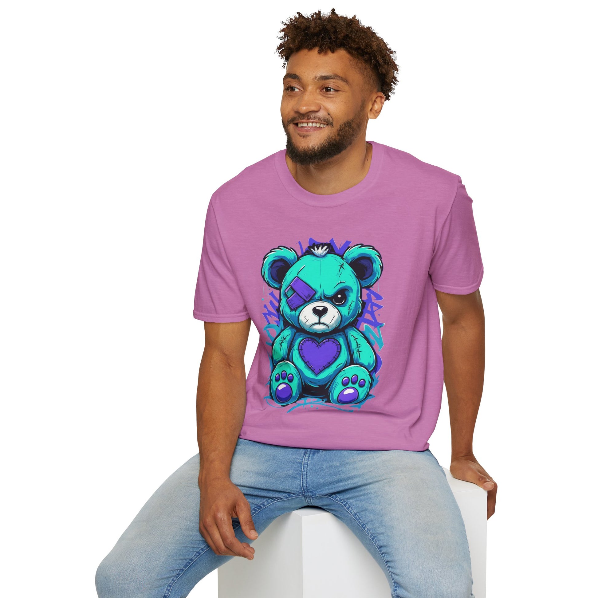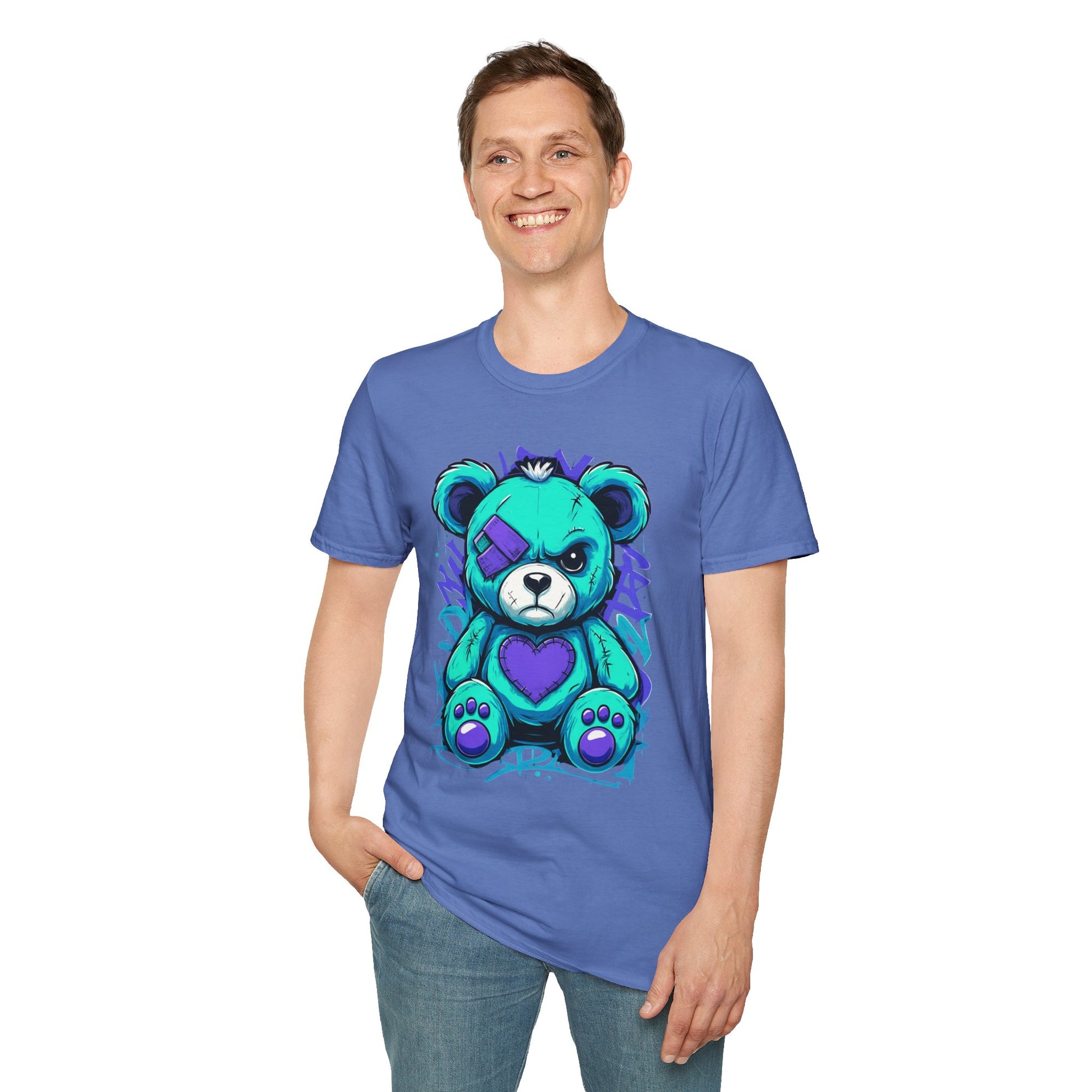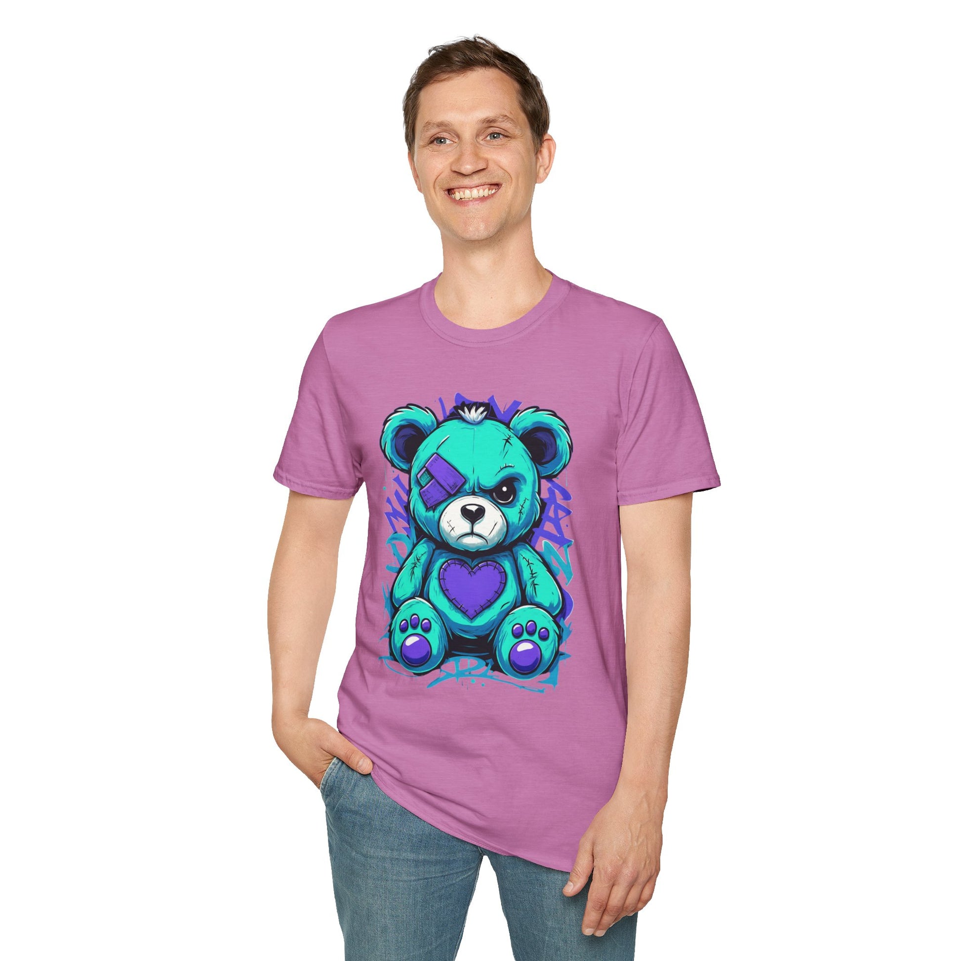 Elevate your wardrobe with this unique Unisex Softstyle T-Shirt, featuring an eye-catching, colorful design of a playful yet bold teddy bear. Perfectly combining style and comfort, this t-shirt offers a relaxed fit that flatters all body types and provides all-day comfort. Ideal for casual outings, gatherings with friends, or weekend adventures, it’s a versatile addition to any closet. This t-shirt is perfect for anyone aged 18 and up who cherishes creativity and wants to express their individuality through fashion. Gift it to loved ones on special occasions such as birthdays, holidays, or just because — it's a delightful surprise that brings a smile!