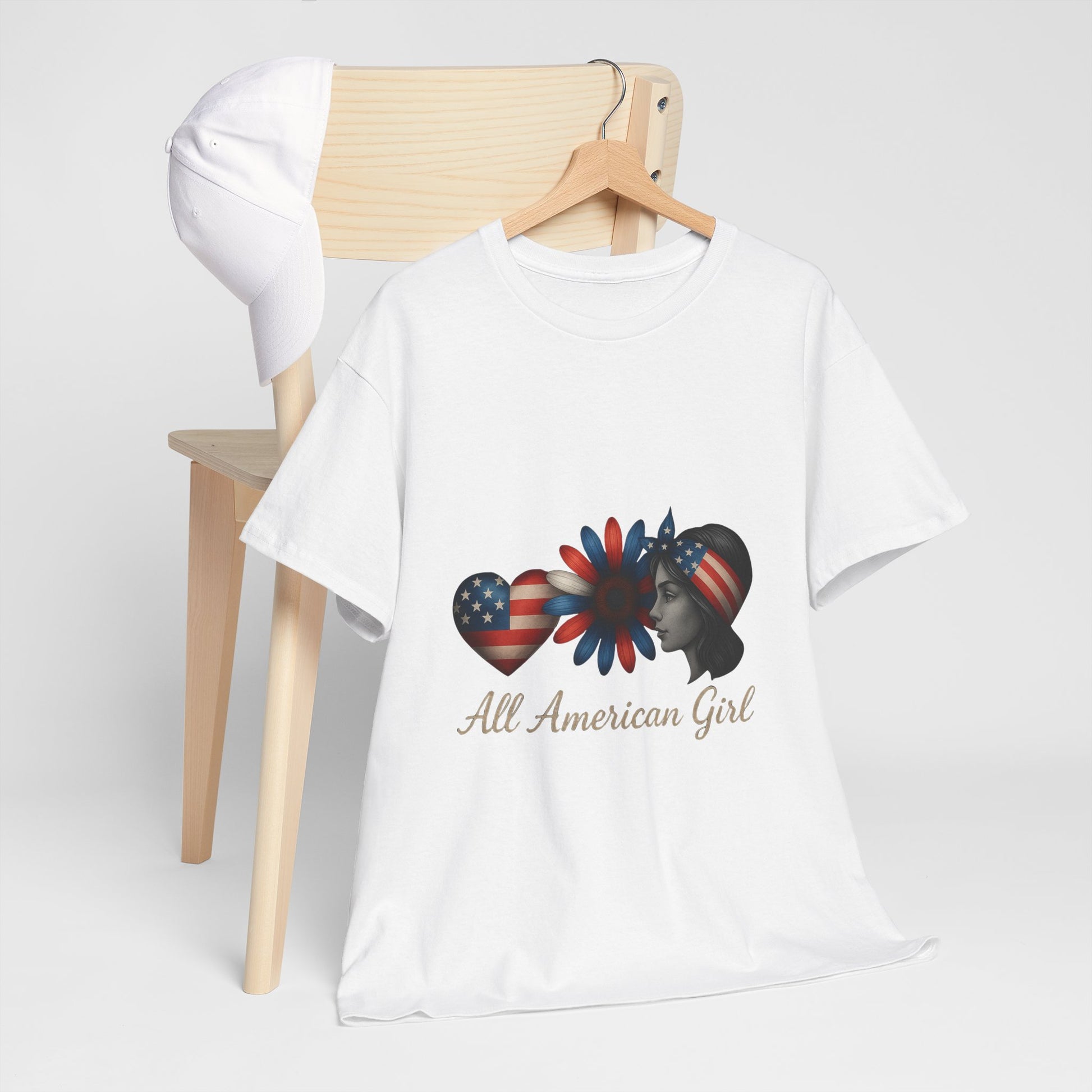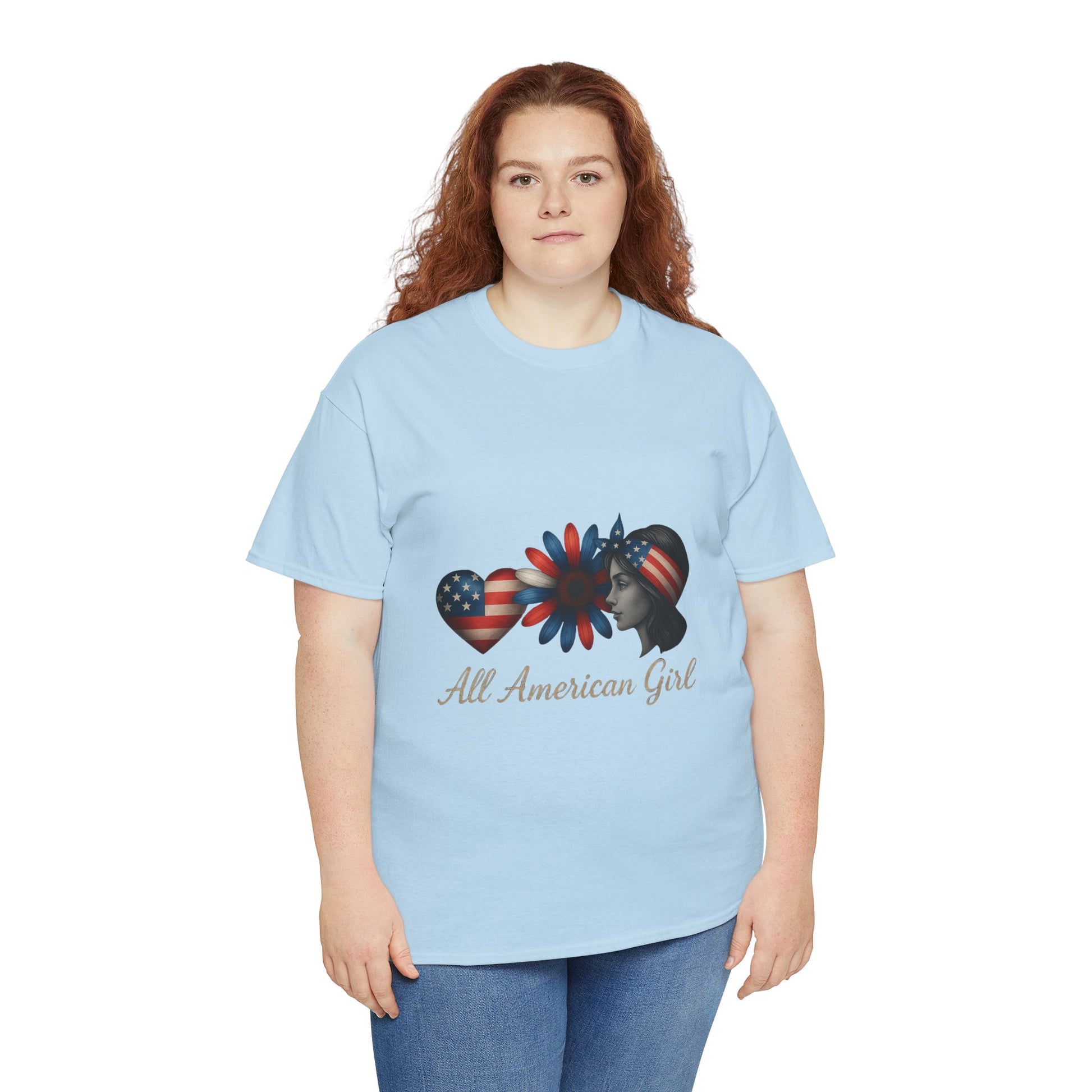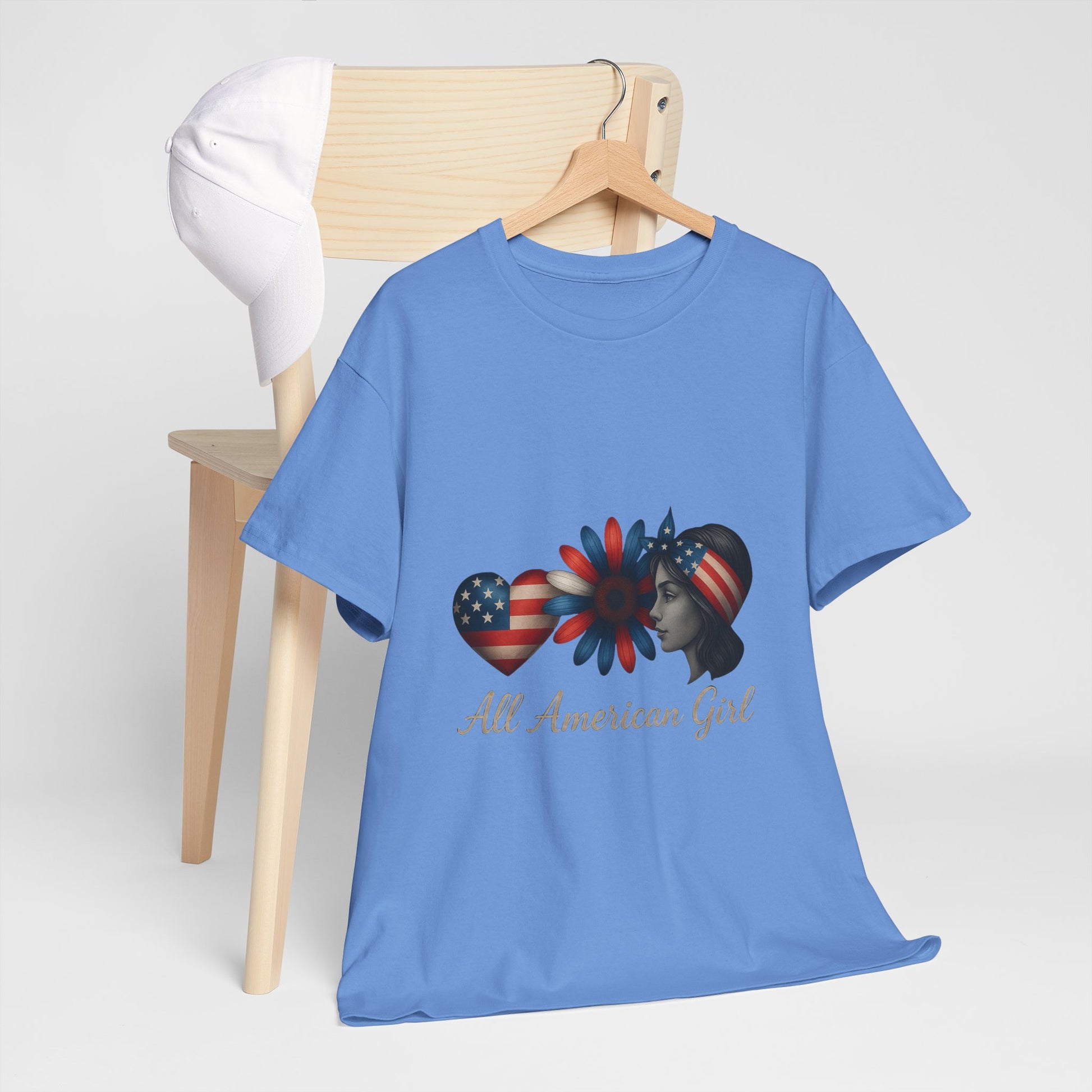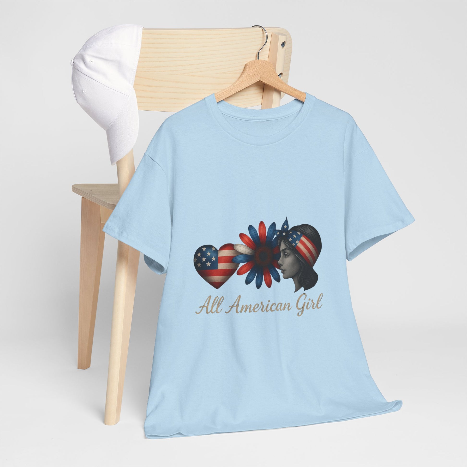 Show your support with this "All American Girl" tee. Featuring a vintage-inspired design with a woman's profile, patriotic elements, this shirt is perfect for Fouth of July. The soft color palette and elegant script make it a stylish and meaningful choice for yourself or as a gift. Spread awareness and inspire hope with this empowering tee.