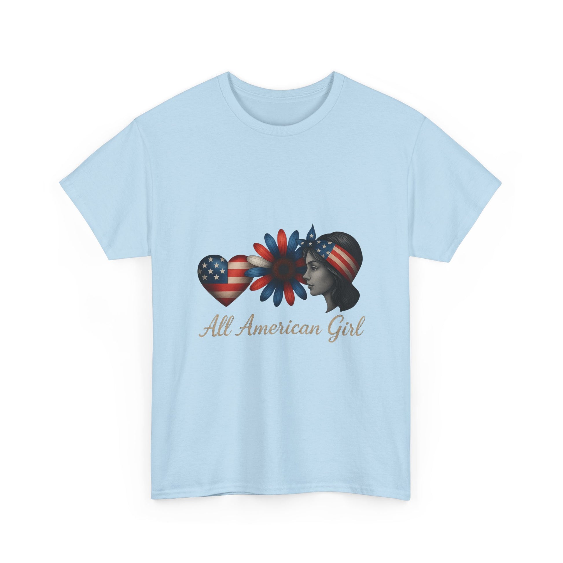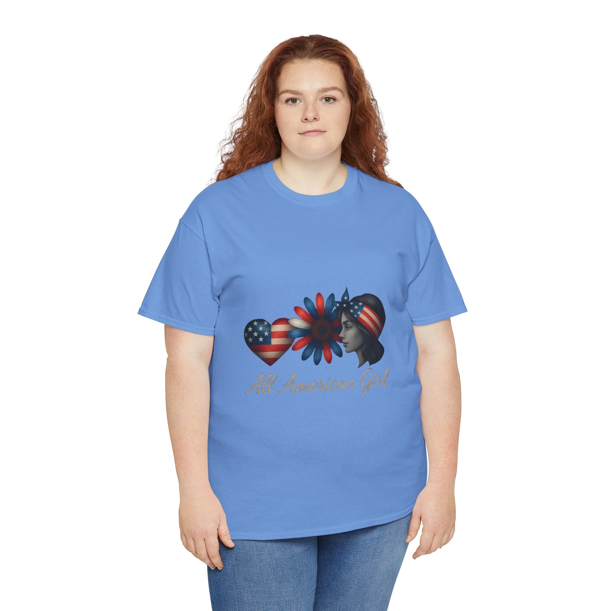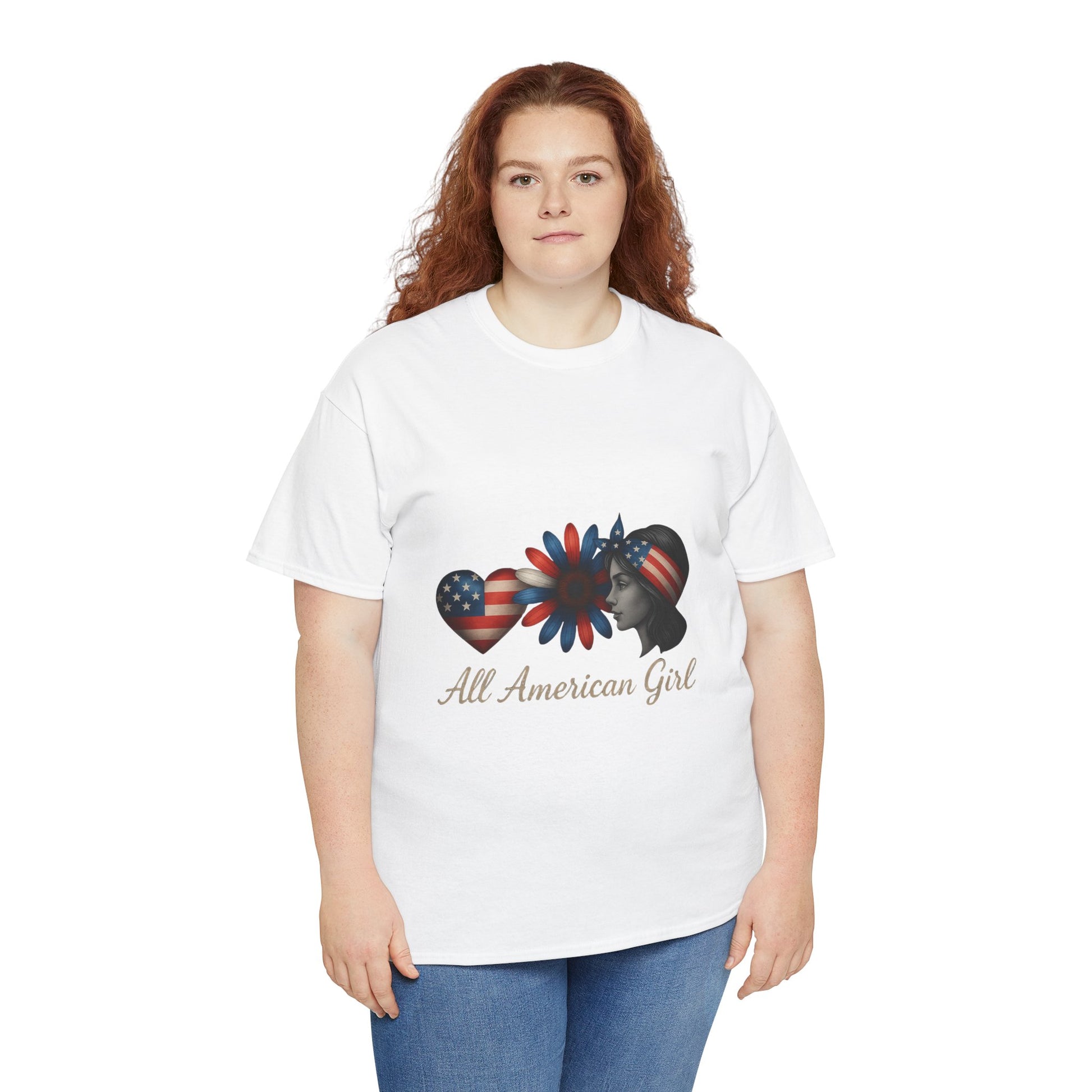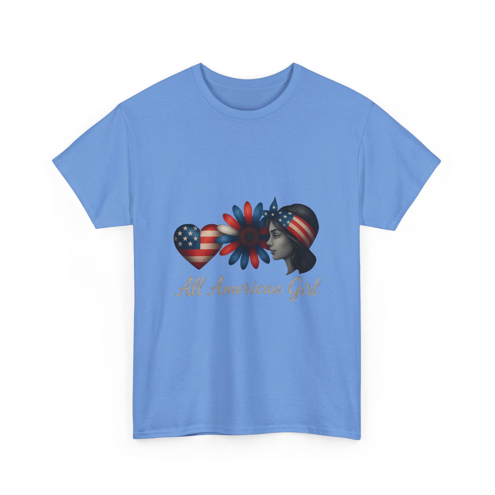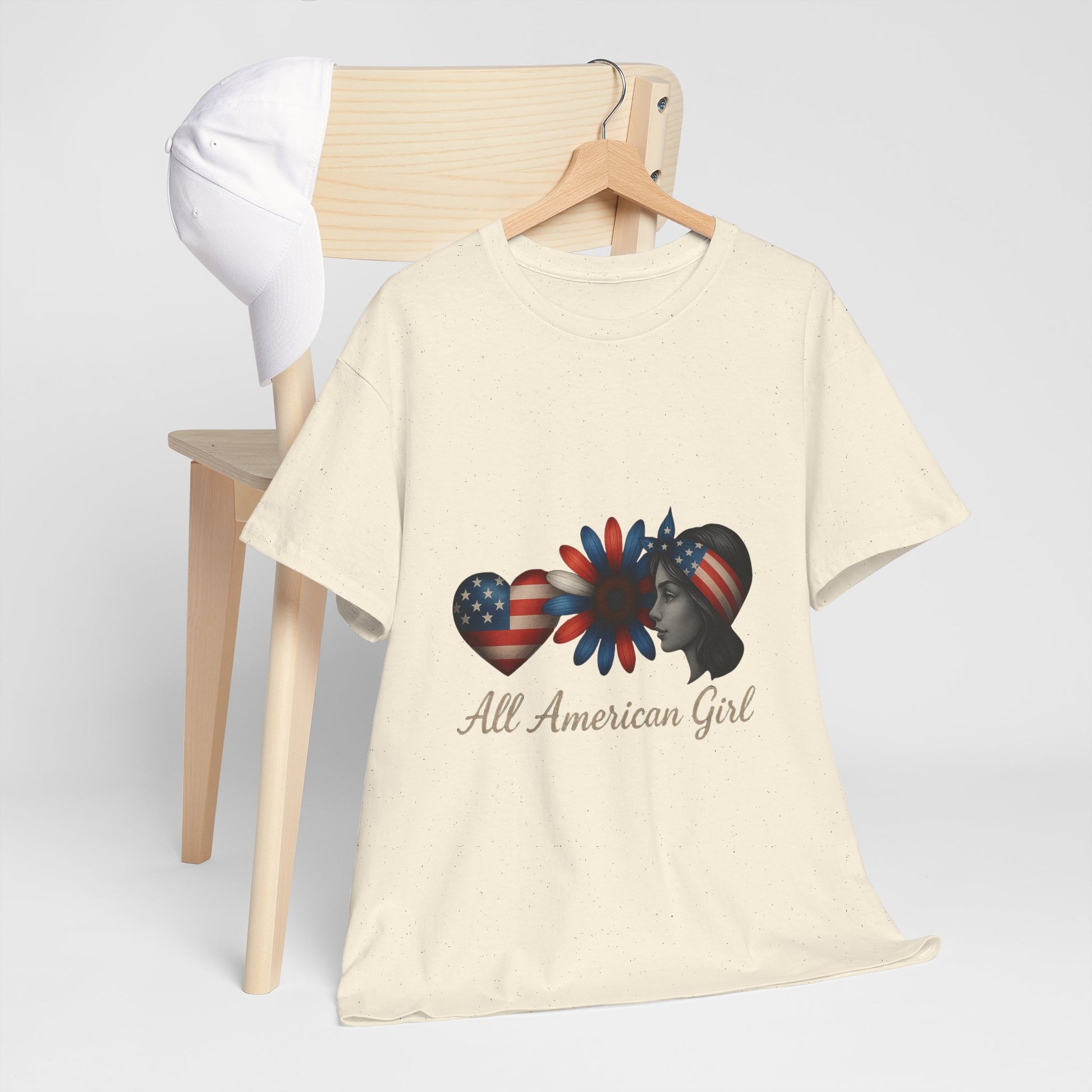 Show your support with this "All American Girl" tee. Featuring a vintage-inspired design with a woman's profile, patriotic elements, this shirt is perfect for Fouth of July. The soft color palette and elegant script make it a stylish and meaningful choice for yourself or as a gift. Spread awareness and inspire hope with this empowering tee.