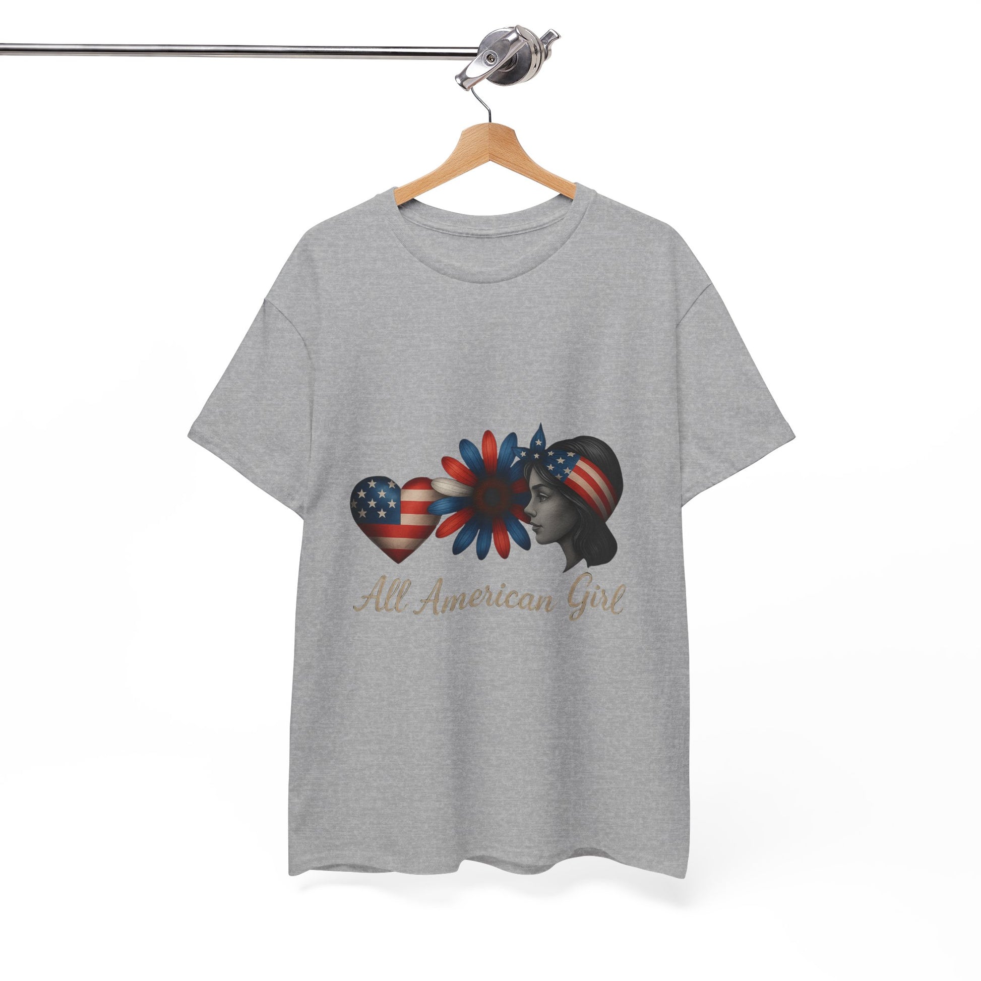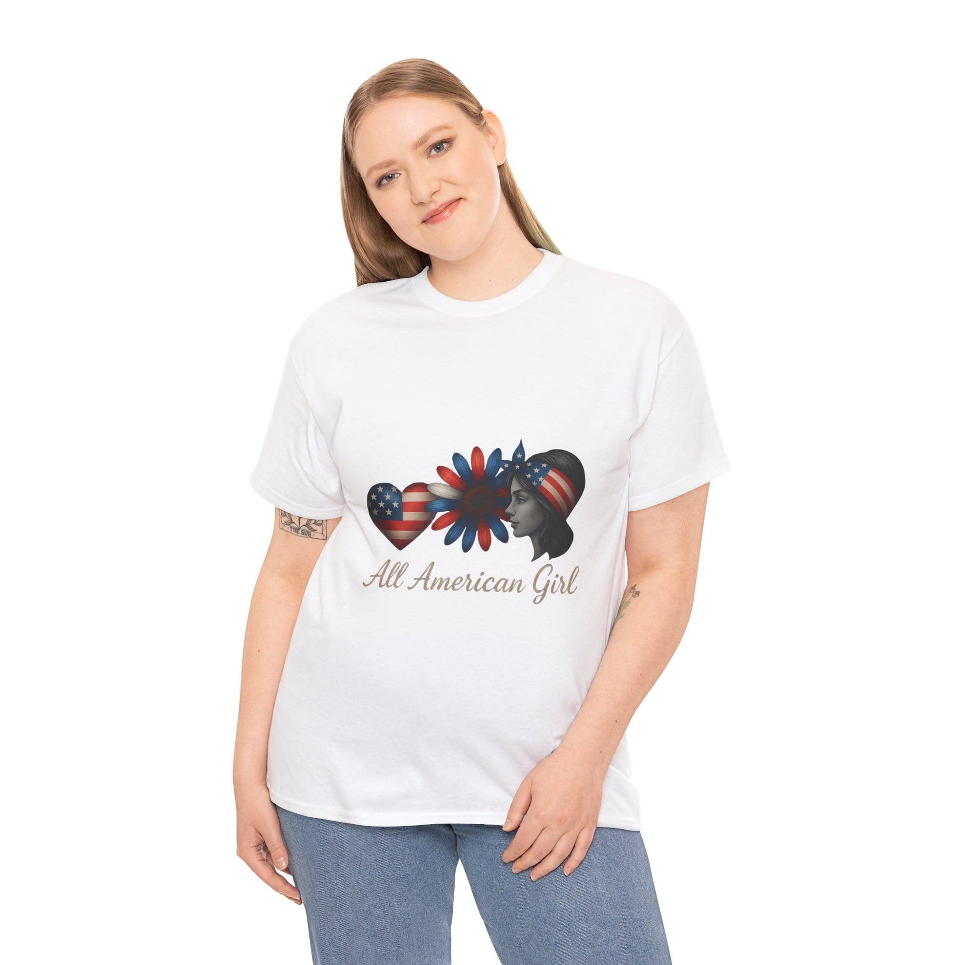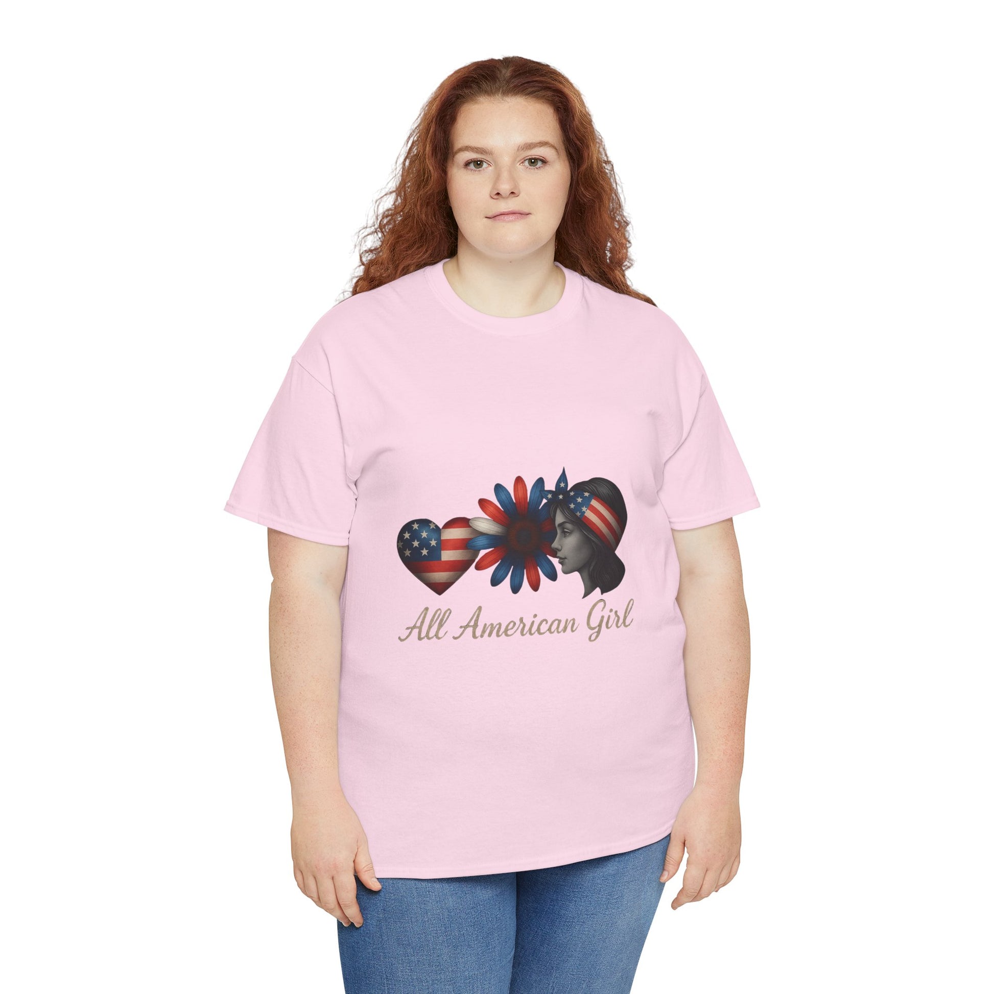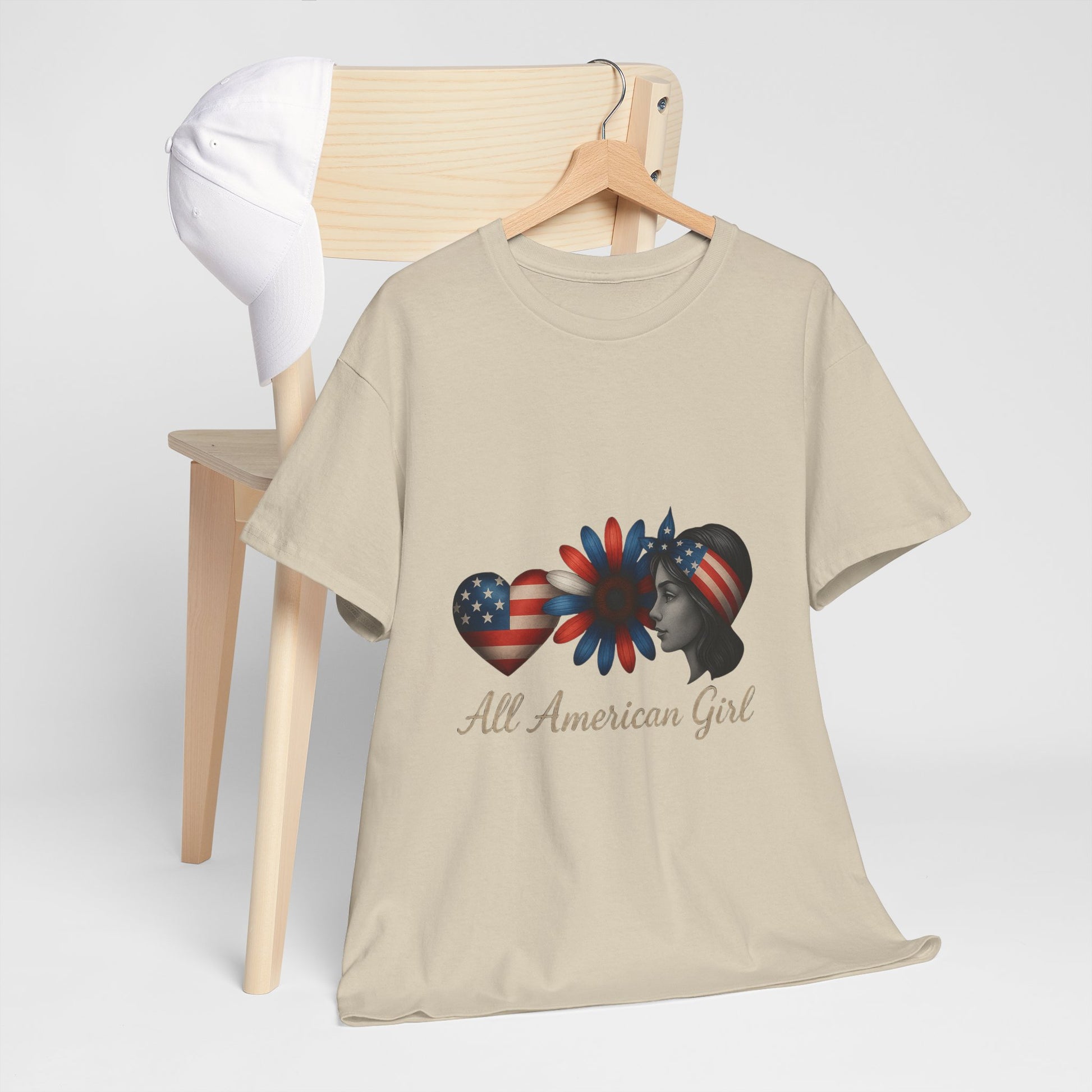 Show your support with this "All American Girl" tee. Featuring a vintage-inspired design with a woman's profile, patriotic elements, this shirt is perfect for Fouth of July. The soft color palette and elegant script make it a stylish and meaningful choice for yourself or as a gift. Spread awareness and inspire hope with this empowering tee.