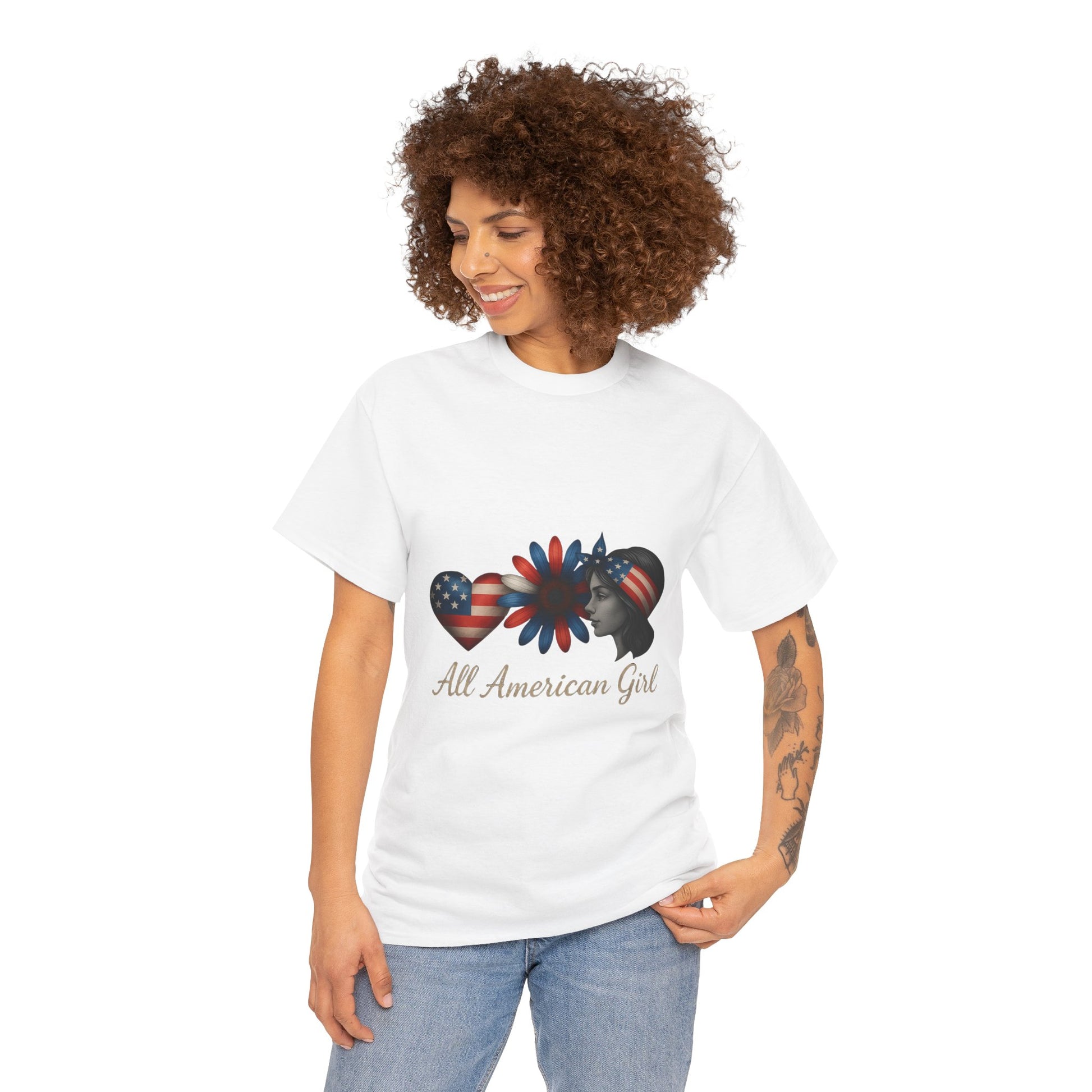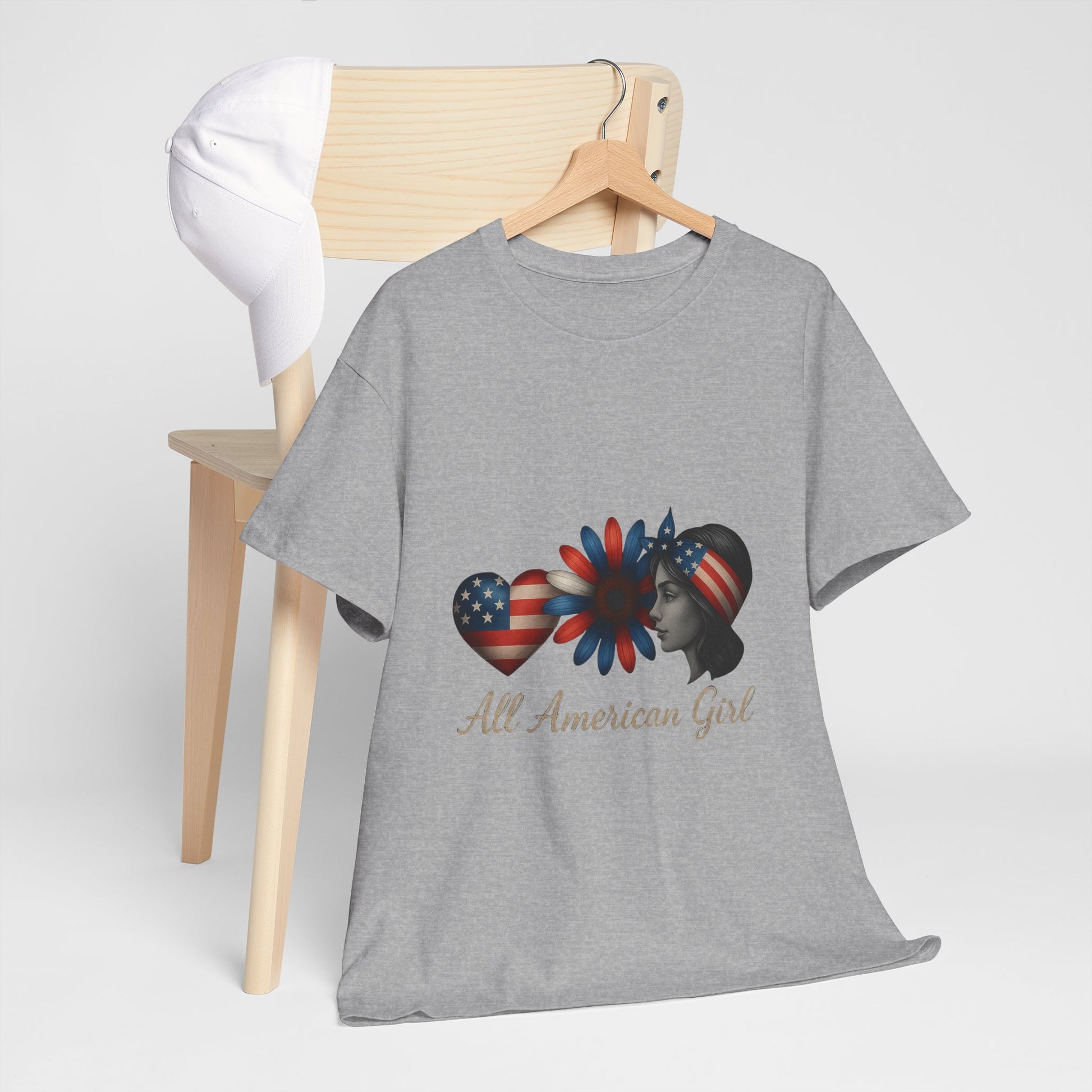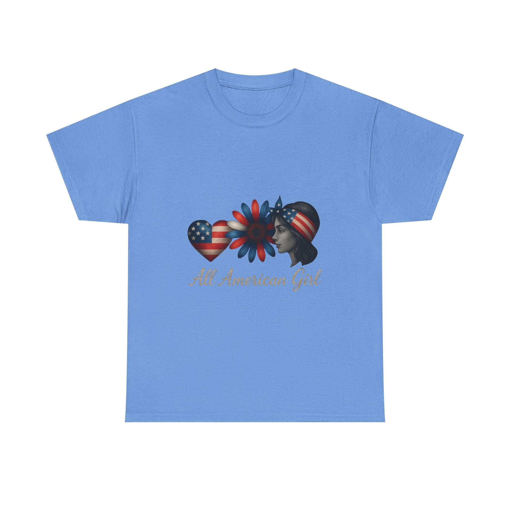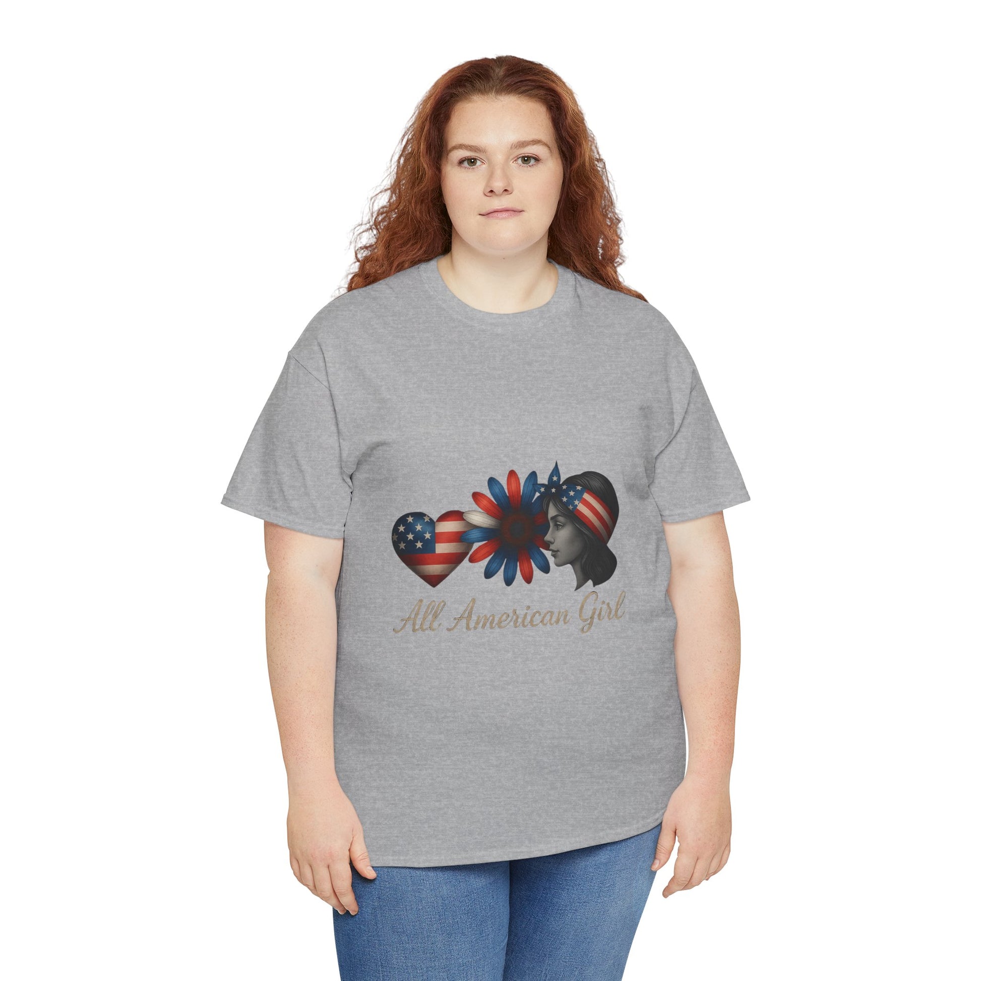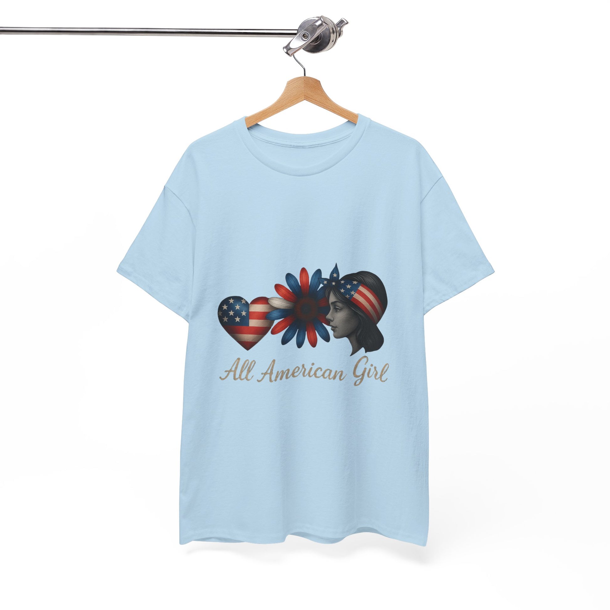 Show your support with this "All American Girl" tee. Featuring a vintage-inspired design with a woman's profile, patriotic elements, this shirt is perfect for Fouth of July. The soft color palette and elegant script make it a stylish and meaningful choice for yourself or as a gift. Spread awareness and inspire hope with this empowering tee.