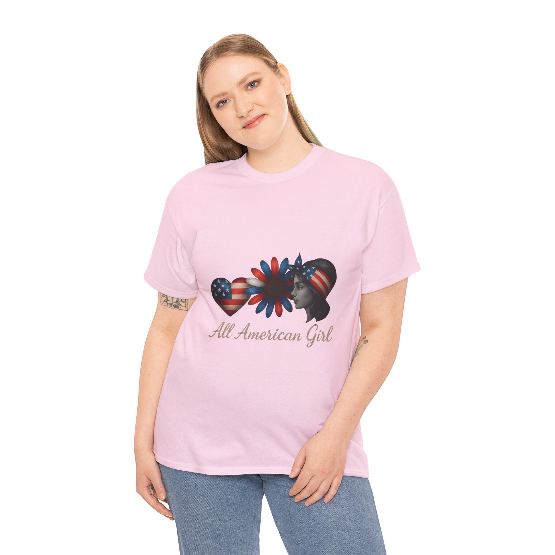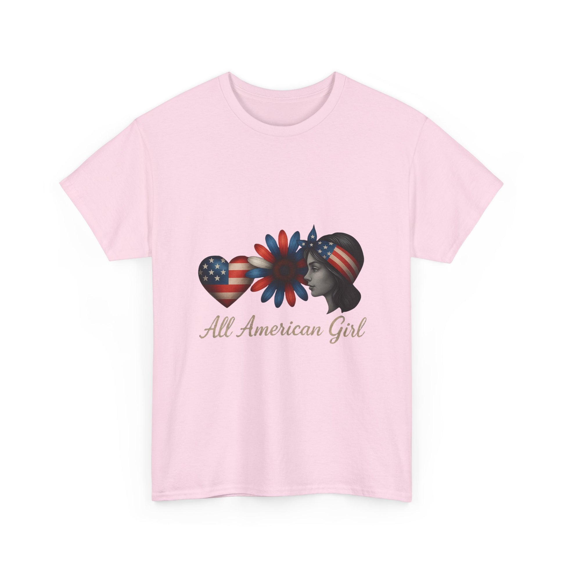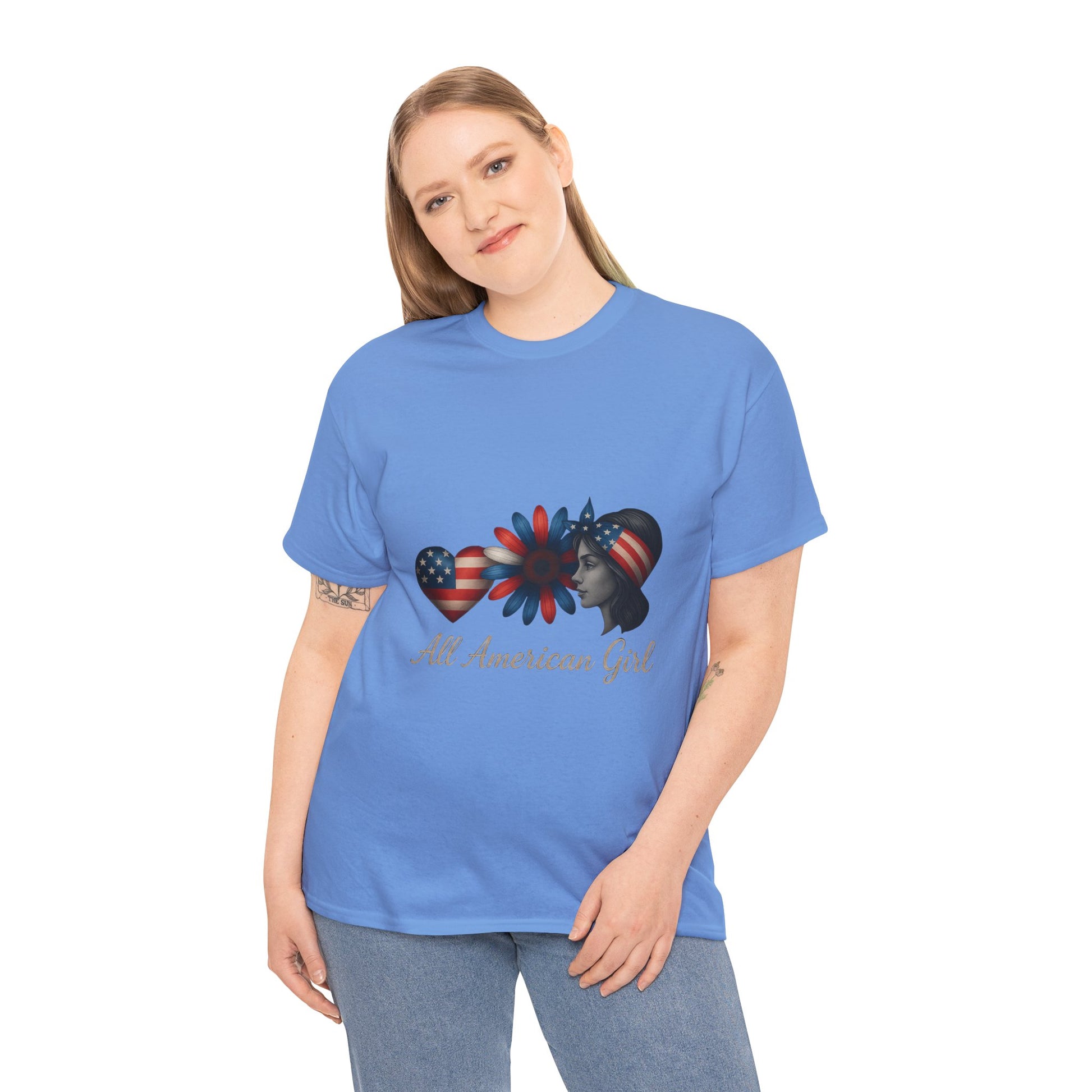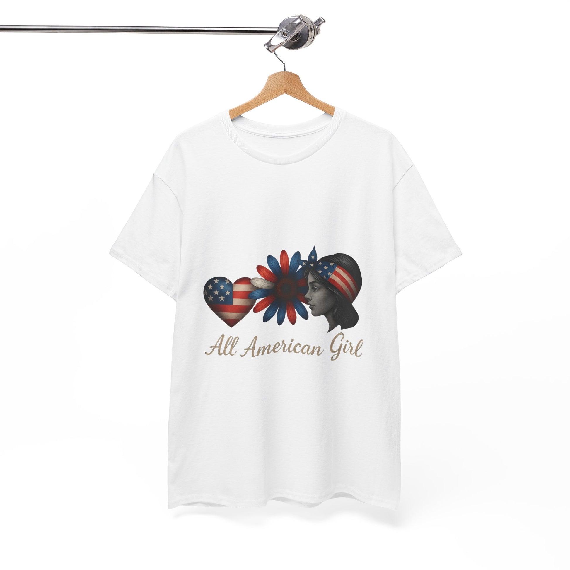 Show your support with this "All American Girl" tee. Featuring a vintage-inspired design with a woman's profile, patriotic elements, this shirt is perfect for Fouth of July. The soft color palette and elegant script make it a stylish and meaningful choice for yourself or as a gift. Spread awareness and inspire hope with this empowering tee.
