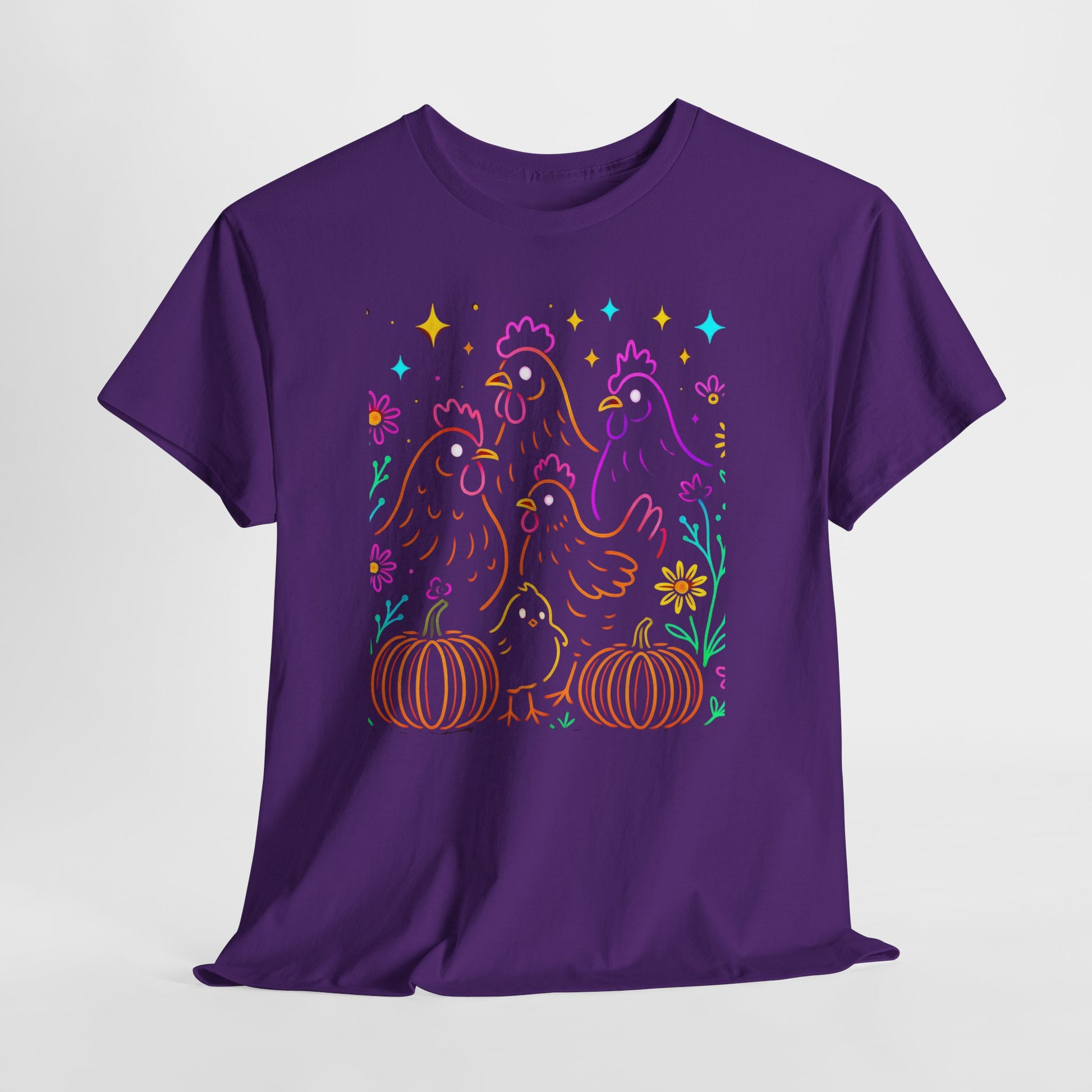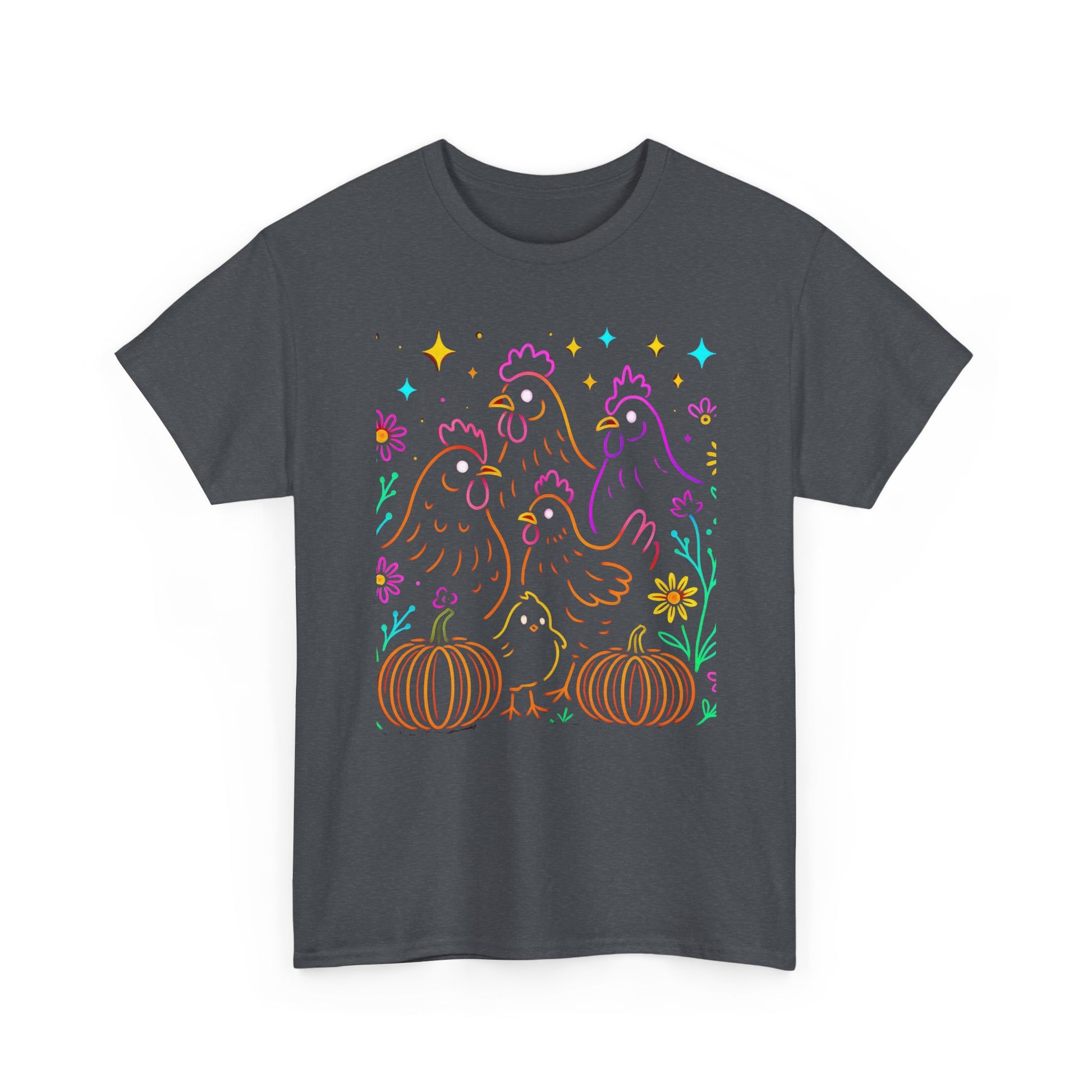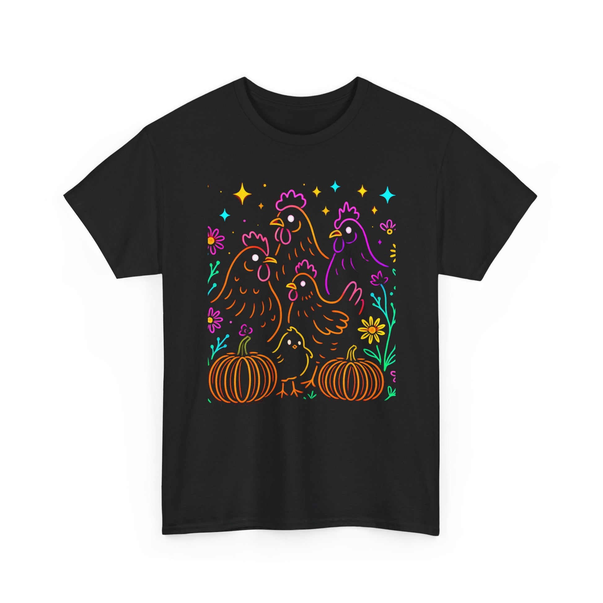 Bring some cheerful farmhouse vibes to your wardrobe with our Autumn Glow Chicken Tee. This playful design features vibrant neon-style chickens surrounded by pumpkins, flowers, and sparkling stars – the perfect mix of cozy fall and lively fun. Made with soft, breathable cotton, this unisex t-shirt is perfect for everyday wear, whether you’re gathering with friends, tending to your backyard flock, or celebrating harvest season. A must-have for chicken lovers, farm enthusiasts, and anyone who enjoys a touch of rustic charm with bold color.