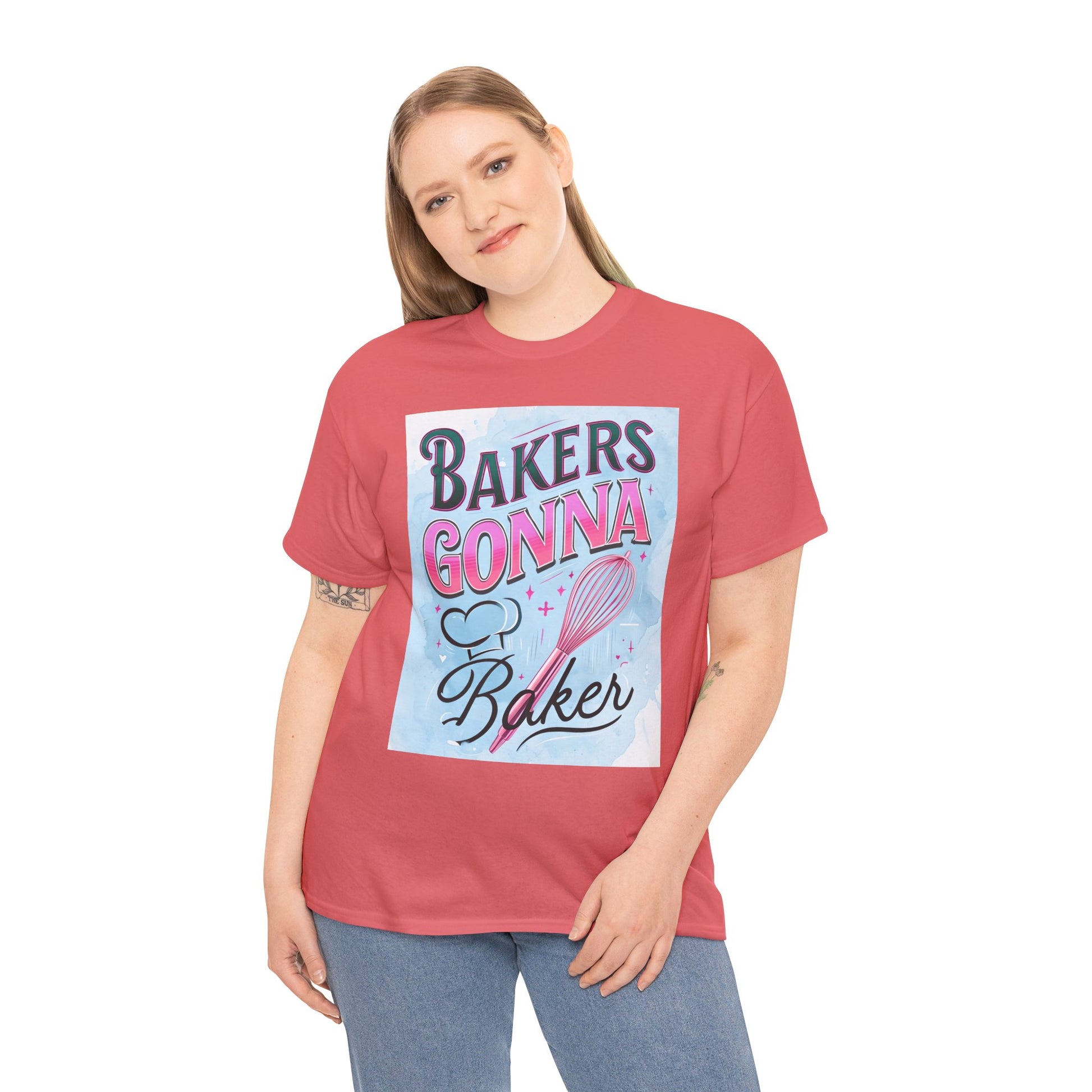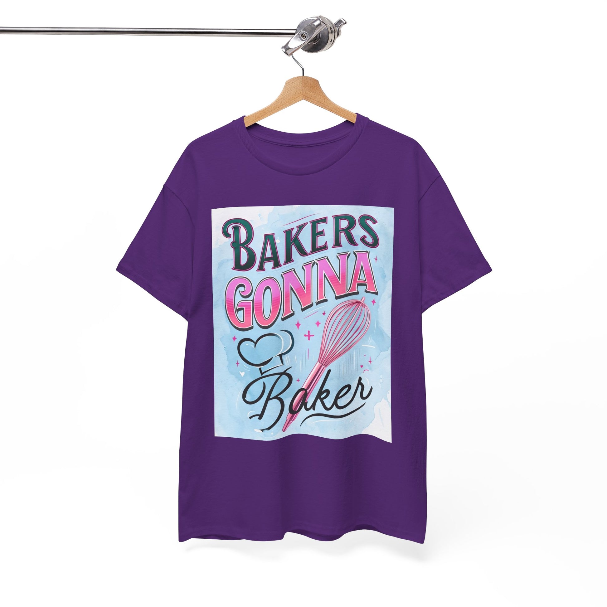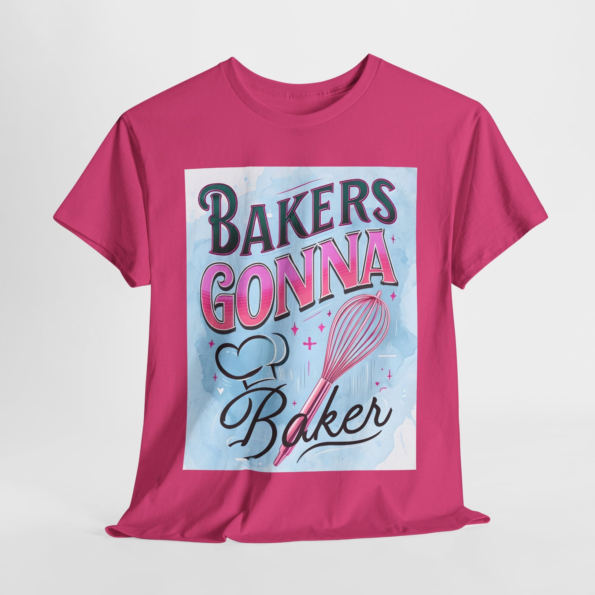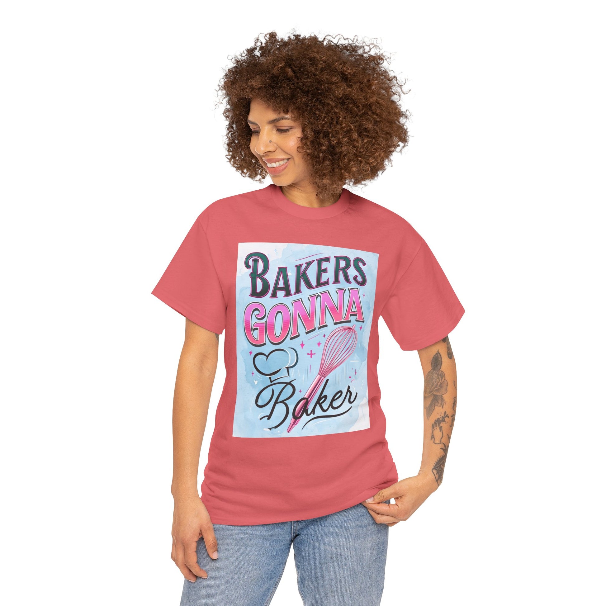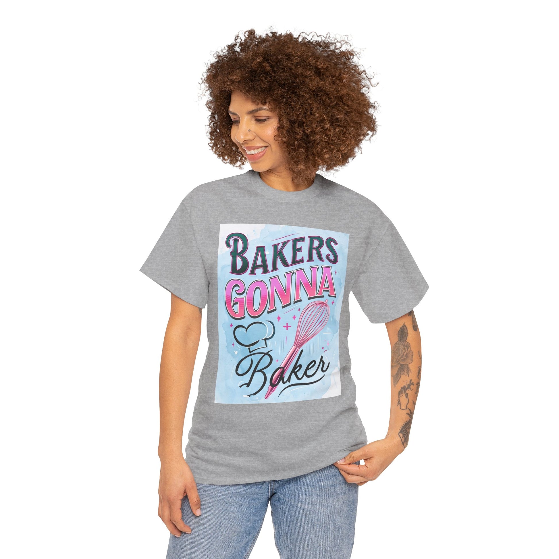 Spread love with our 'Bakers Gonna Baker' tee, a vibrant design. Featuring a whimsical illustration of a chef's hat heart, pink whisk, and playful elements set against a light blue watercolor background. This empowering unisex shirt, with its stylish design, is a perfect gift to show support.