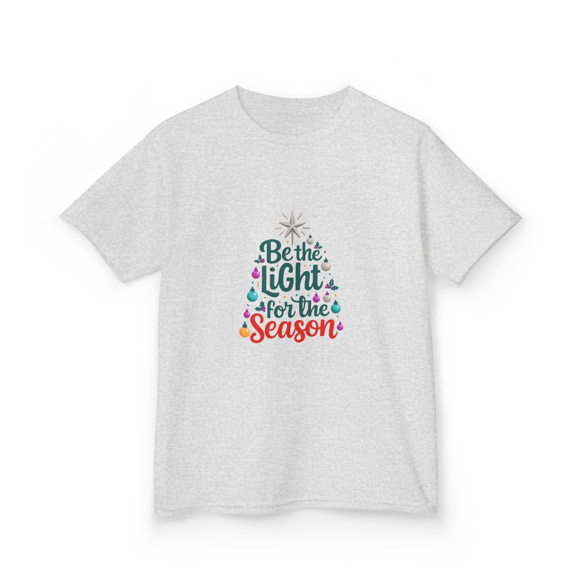 Spread holiday cheer with this adorable Christmas tree design! Featuring a playful script that forms a festive tree, this tee showcases a silver star, colorful ornaments, and holly accents. The words "Be" and "Season" are in vibrant red, "LIGHT" and "for the" are in a deep teal-green. This soft, comfy tee is perfect for kids and makes a great holiday gift! Crafted from high-quality materials for lasting wear.
