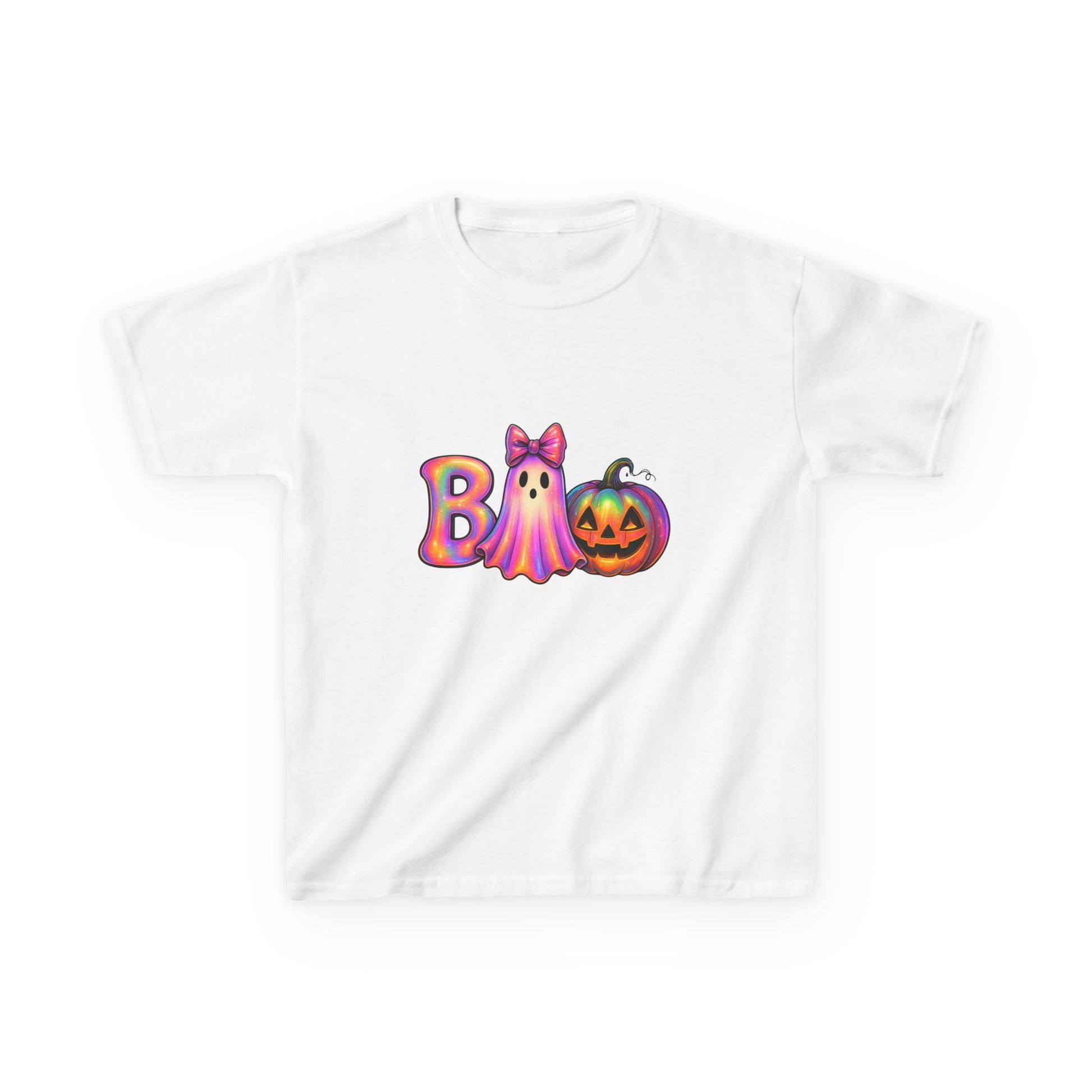 Get ready for Halloween with this adorable "BOO" tee! Featuring a colorful jack-o'-lantern "O" and bubble letter design, this shirt is perfect for trick-or-treating or any spooky celebration. The vibrant, cartoon-style illustration includes a shimmering ghost and a fun color gradient, making it visually appealing. Made with soft, comfortable fabric, it's a must-have for little dinosaur lovers! A perfect gift for kids who love Halloween.
