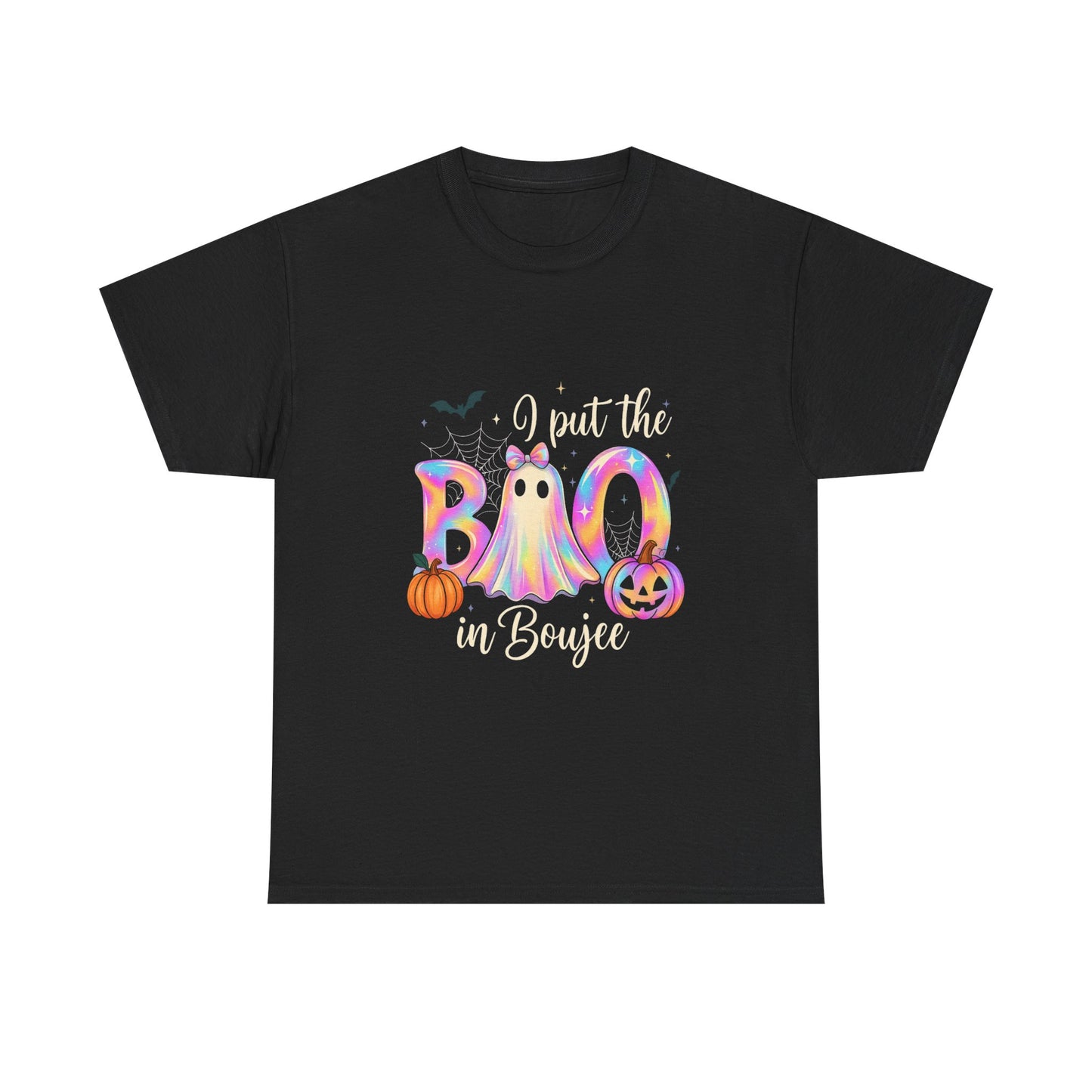 Spread some spooky cheer with this unique Halloween tee! Featuring a playful 'BOO' design with a rainbow iridescent gradient, a ghost with a bow, and jack-o'-lanterns, this shirt is perfect for fall. The phrase "I put the Boo in Boujee" adds a fun twist.