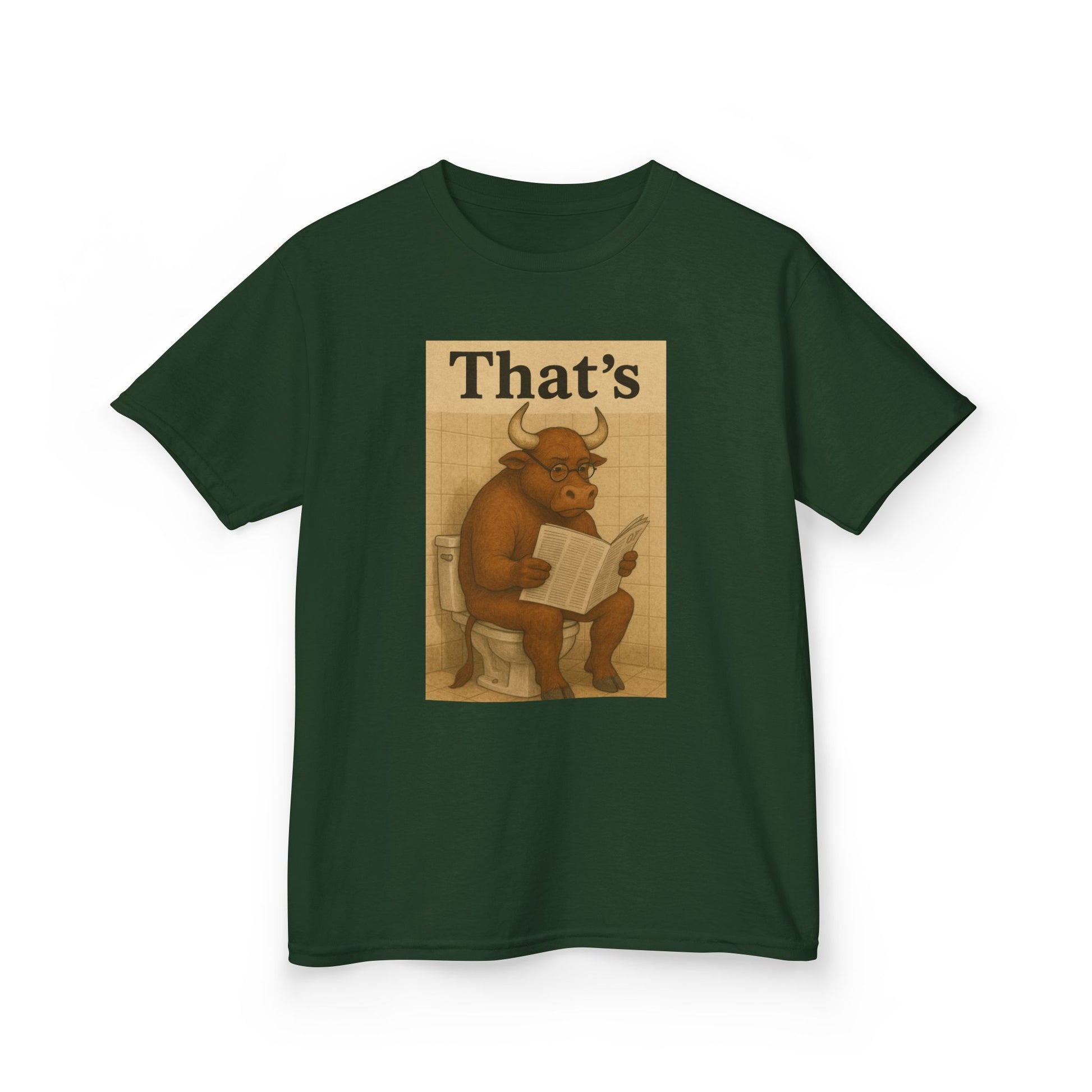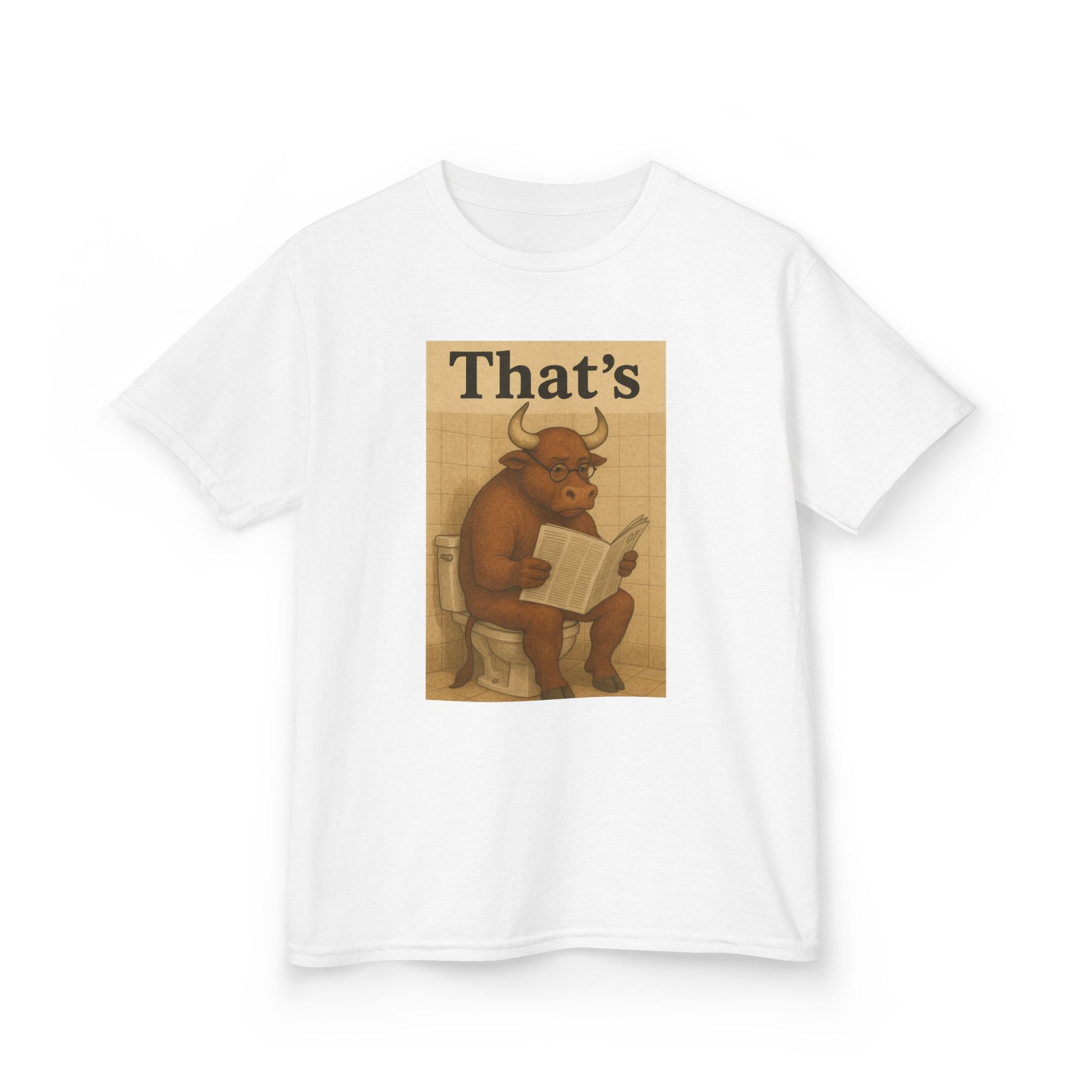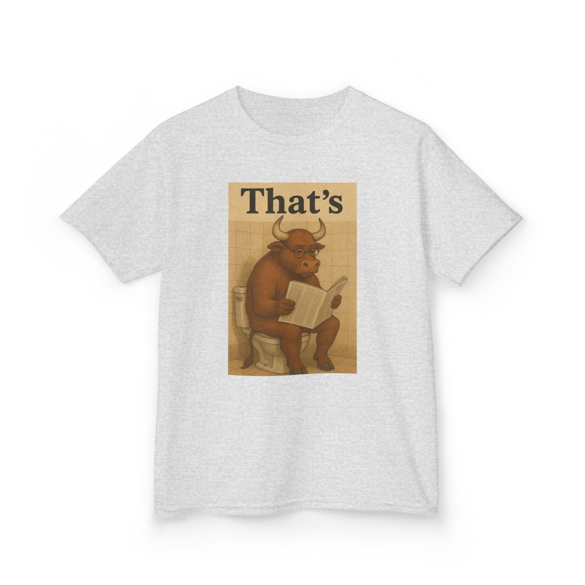 This hilarious tee features a bull, the symbol of a rising market, taking a bathroom break! The illustration shows the bull in a relatable, everyday setting, complete with glasses and a newspaper. Perfect for kids who love a good pun and a bit of financial humor. It's a cute and comfy graphic tee, ideal for Christmas, parties, or everyday fun.