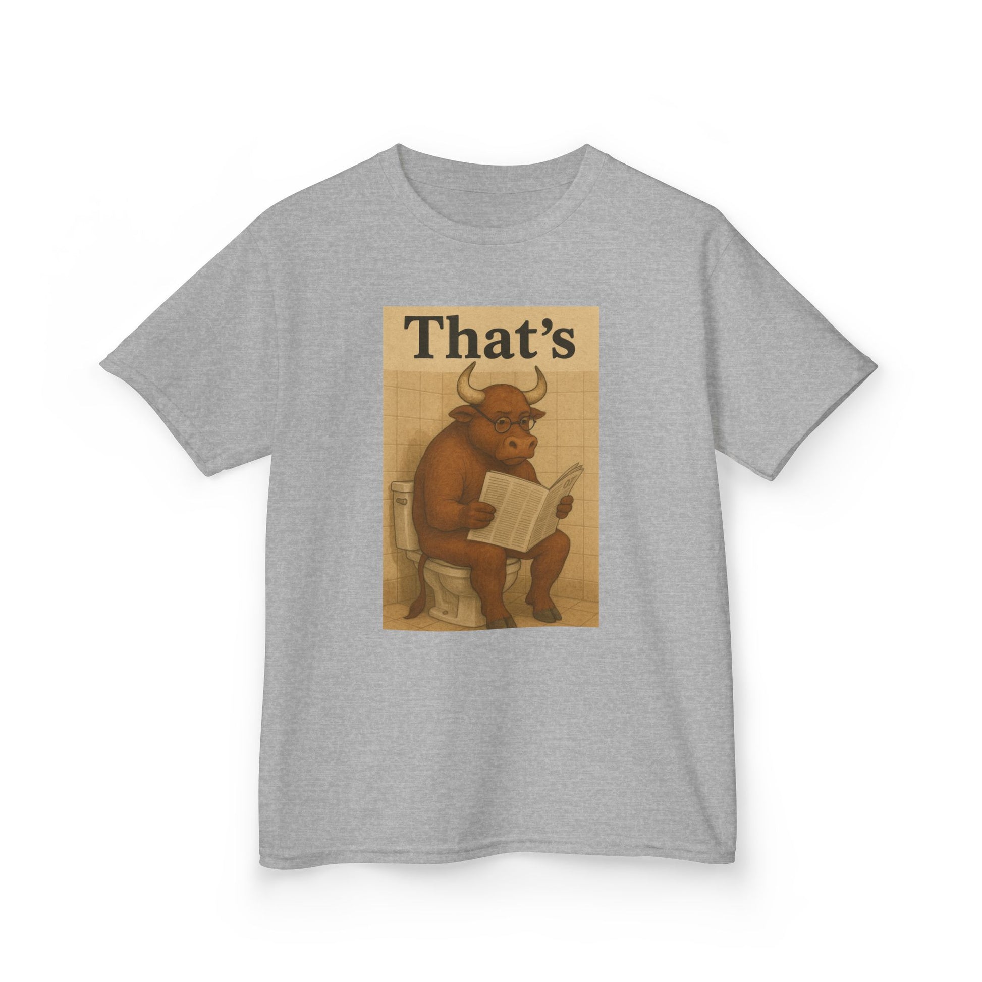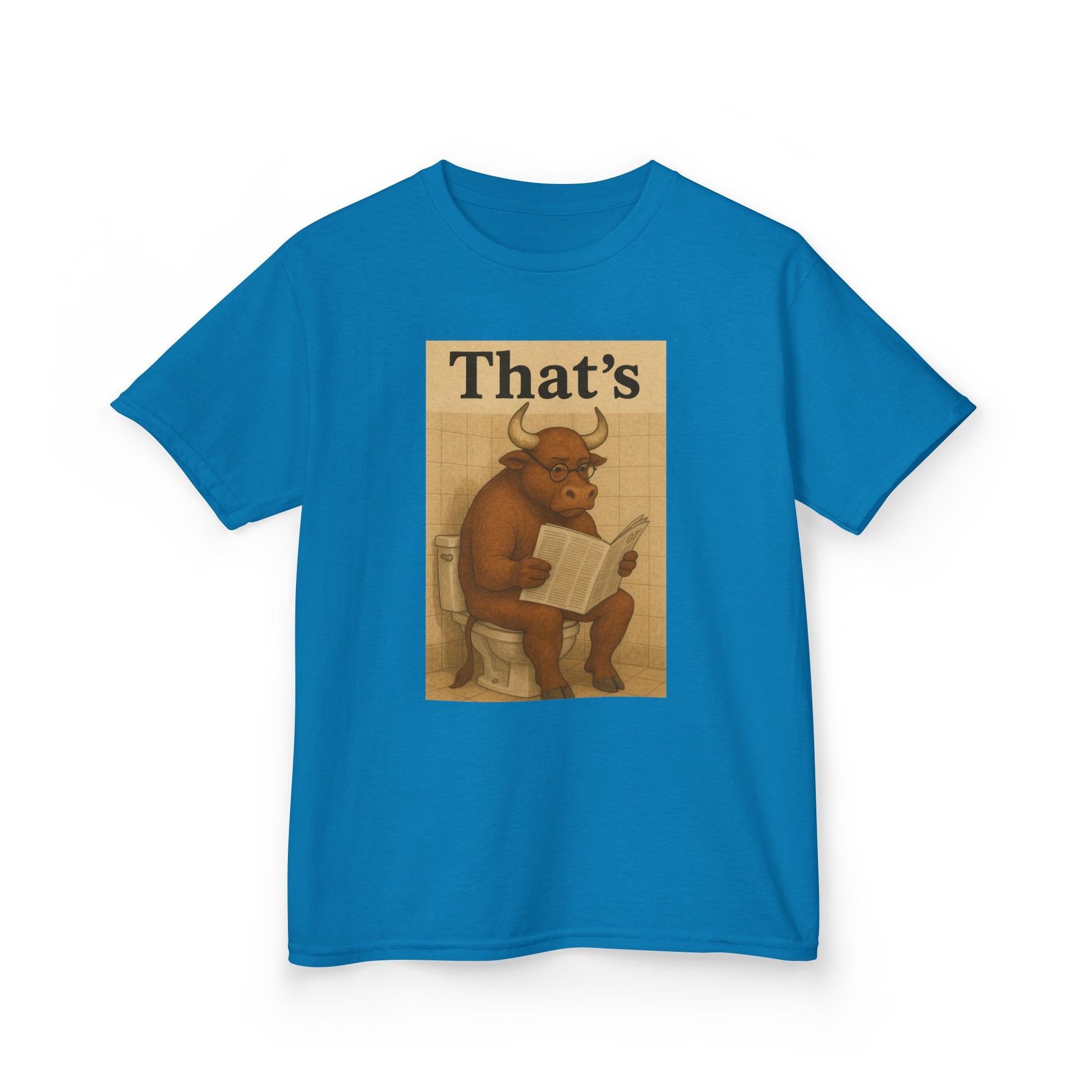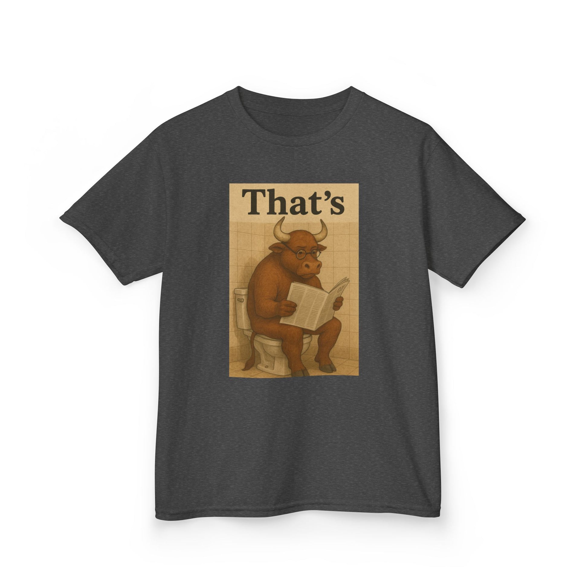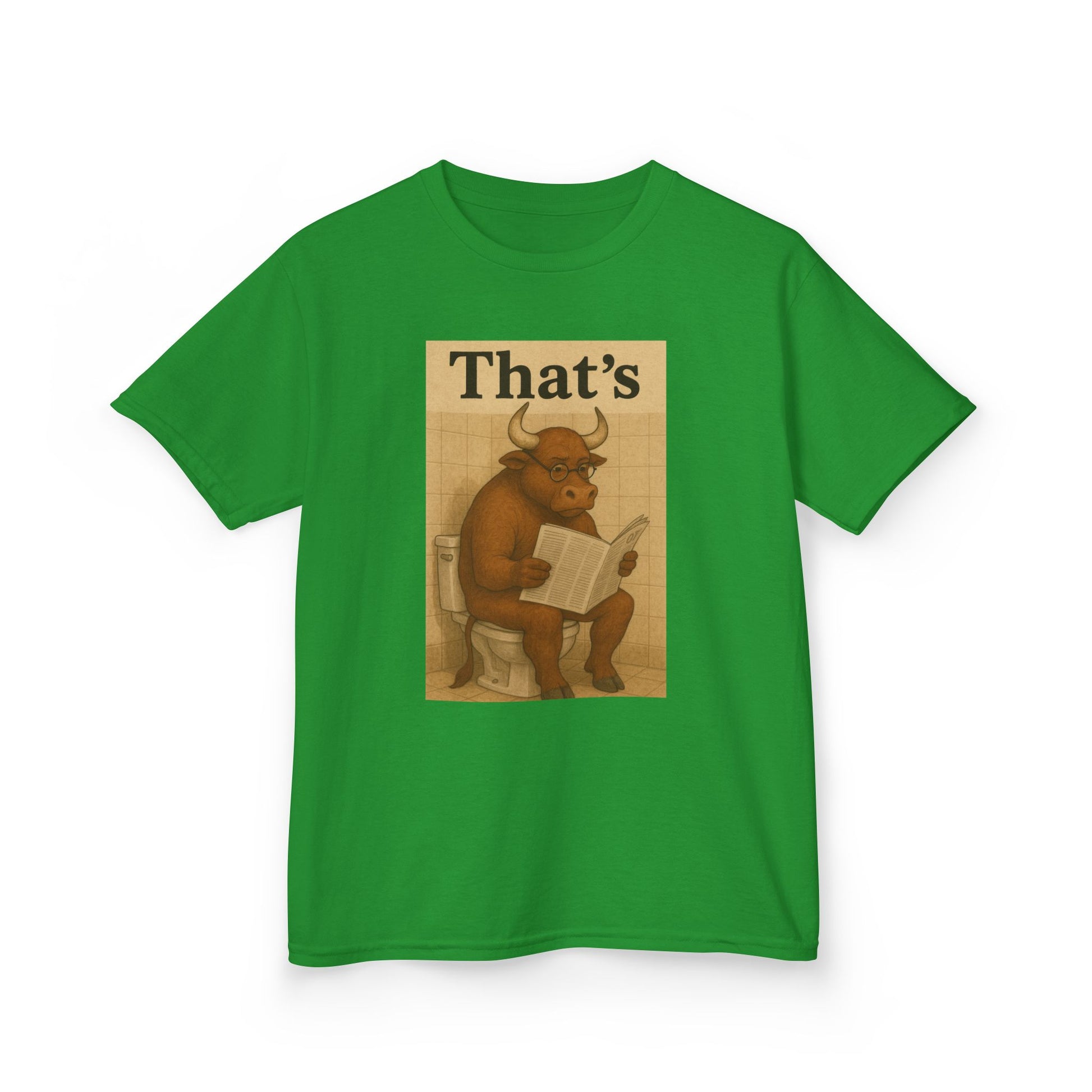 This hilarious tee features a bull, the symbol of a rising market, taking a bathroom break! The illustration shows the bull in a relatable, everyday setting, complete with glasses and a newspaper. Perfect for kids who love a good pun and a bit of financial humor. It's a cute and comfy graphic tee, ideal for Christmas, parties, or everyday fun.