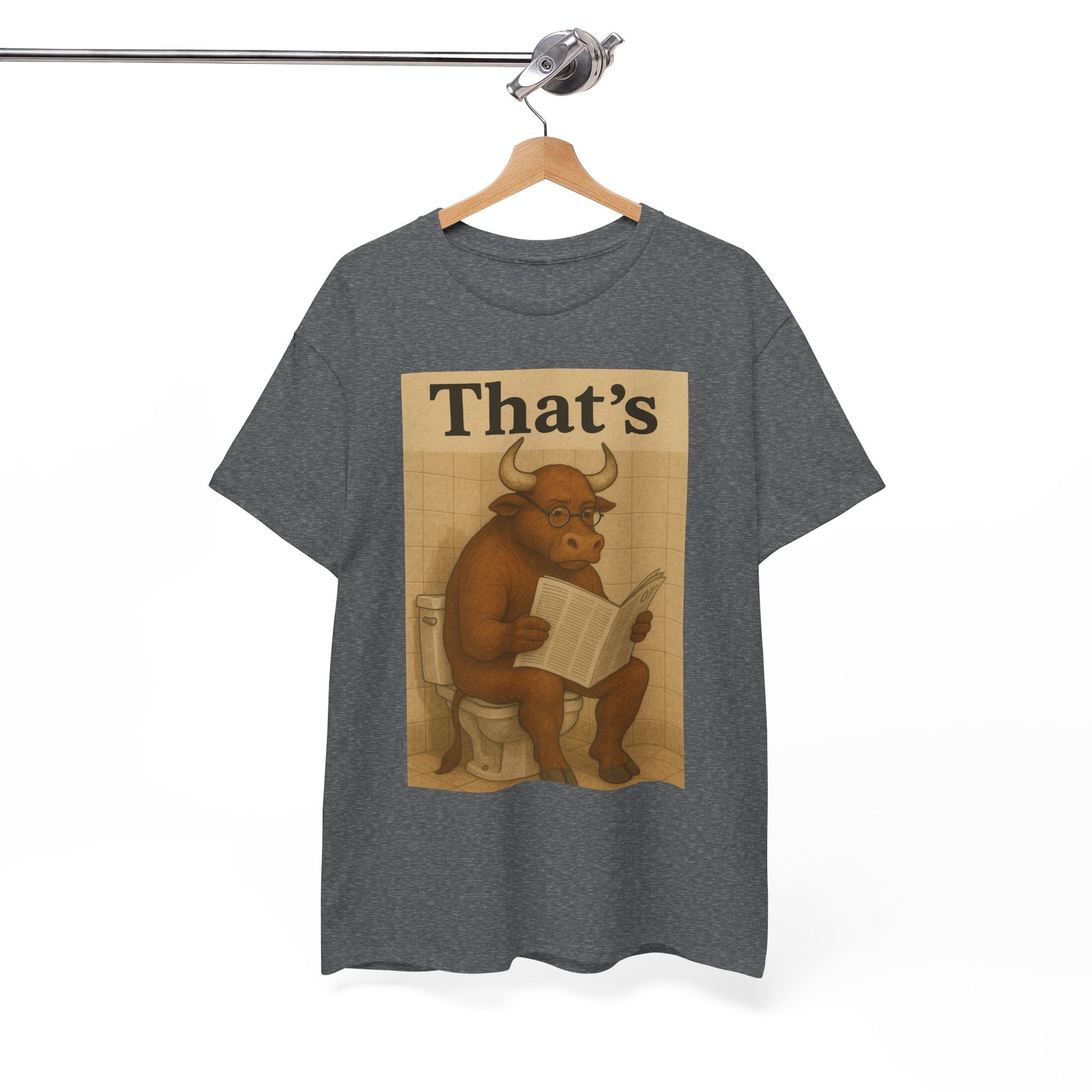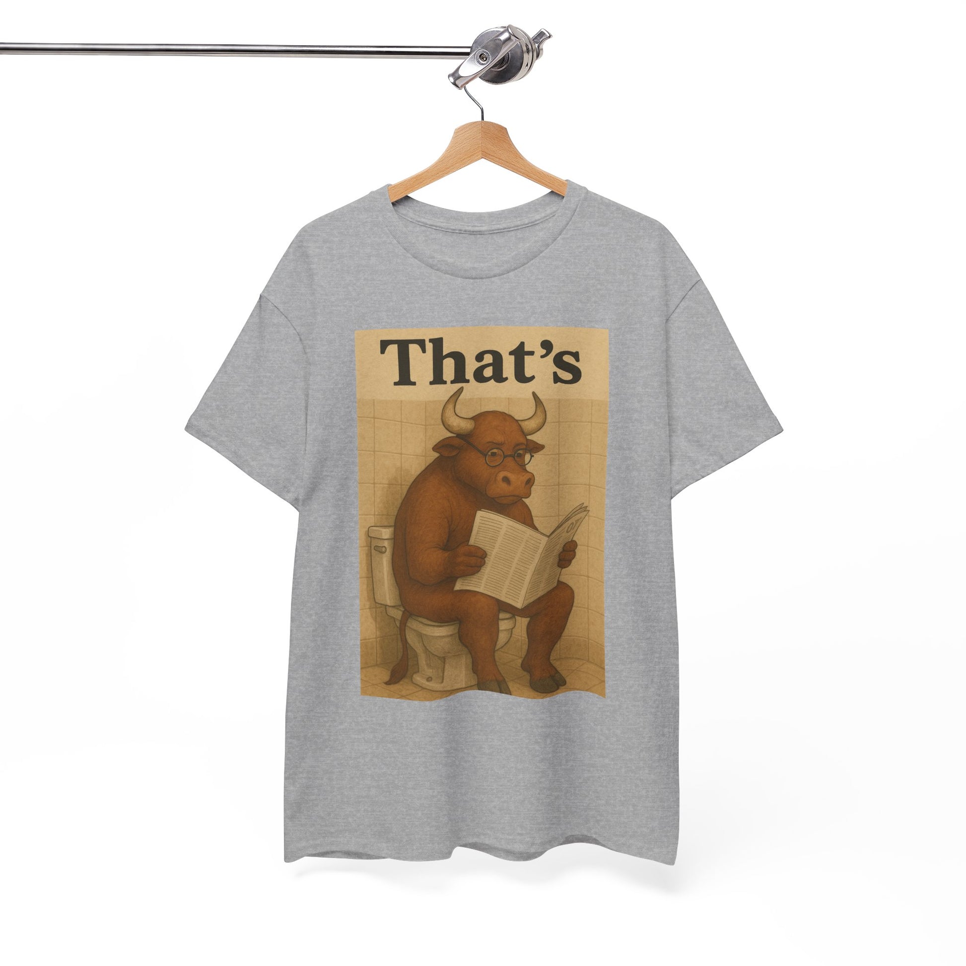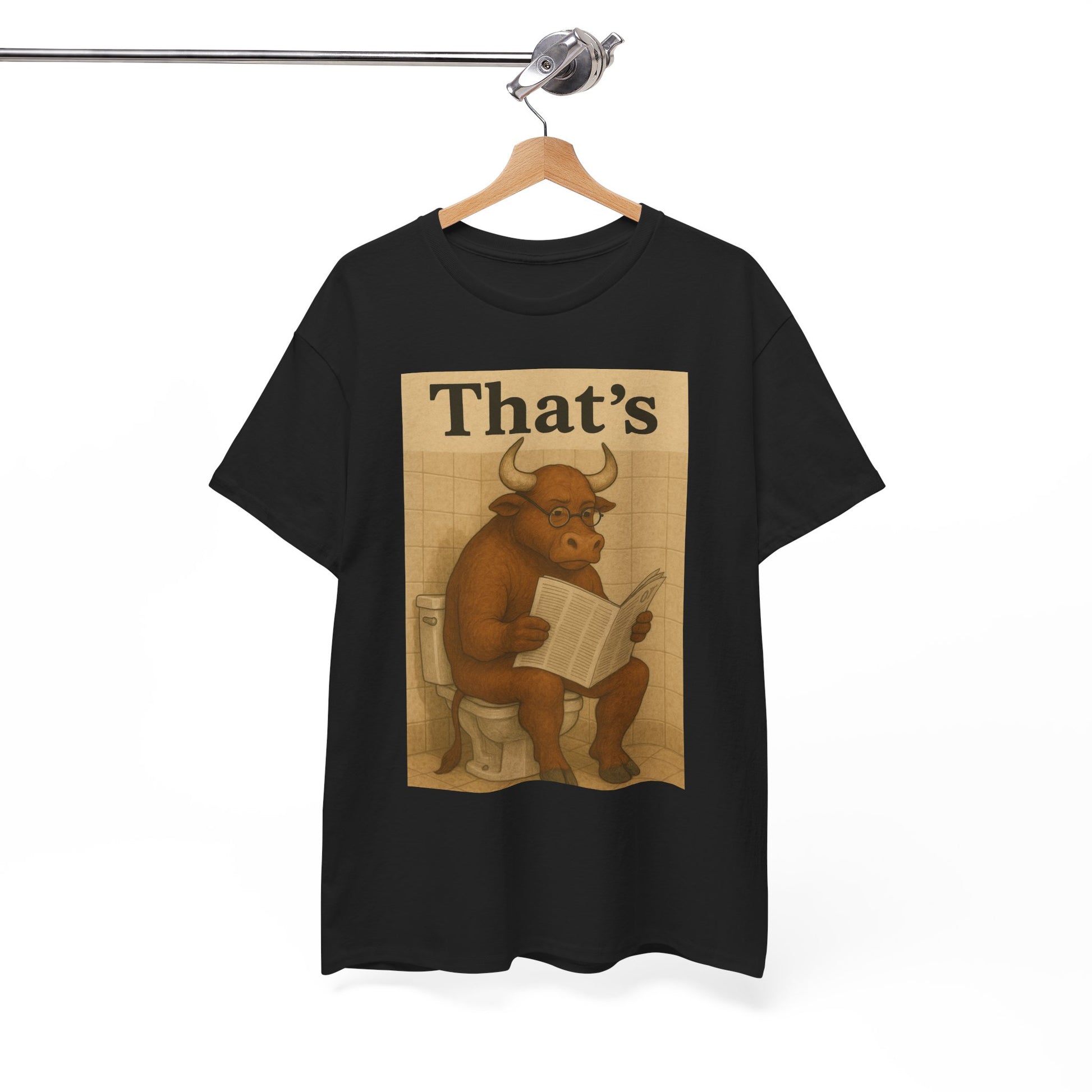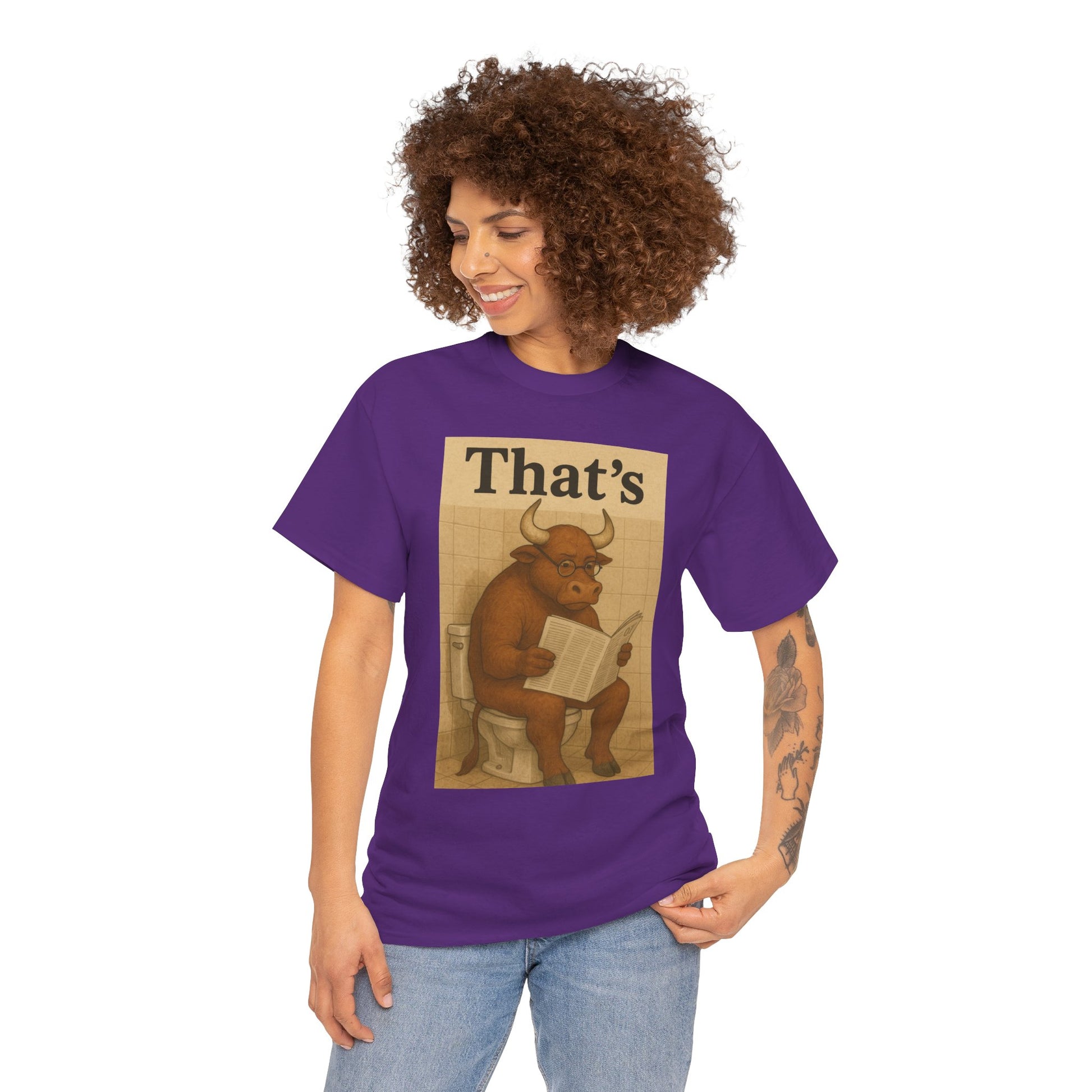 This T-Shirt featuring a bull on the toilet reading a newspaper is a conversation starter. Perfect for those who enjoy quirky and humorous designs, this shirt can be worn casually or as a statement piece. Ideal for individuals with a playful sense of humor, this shirt is great for casual wear, parties, or as a fun gift for friends and family.
