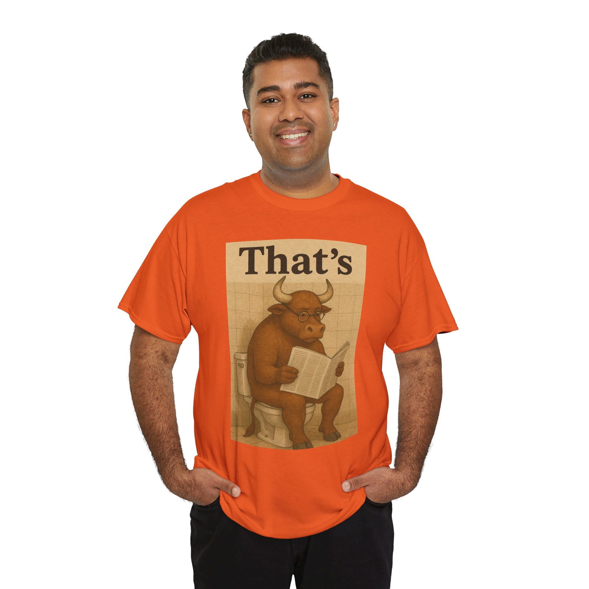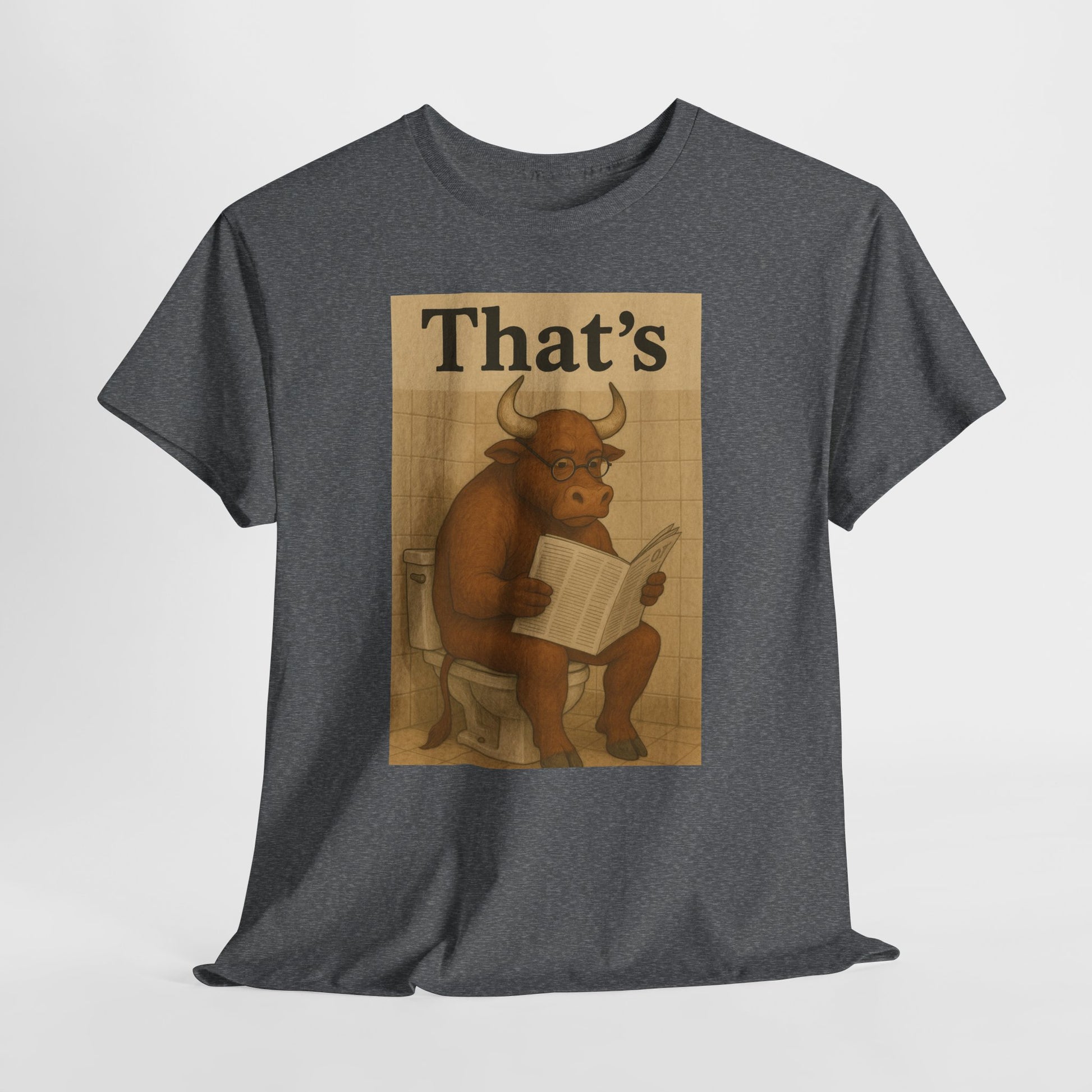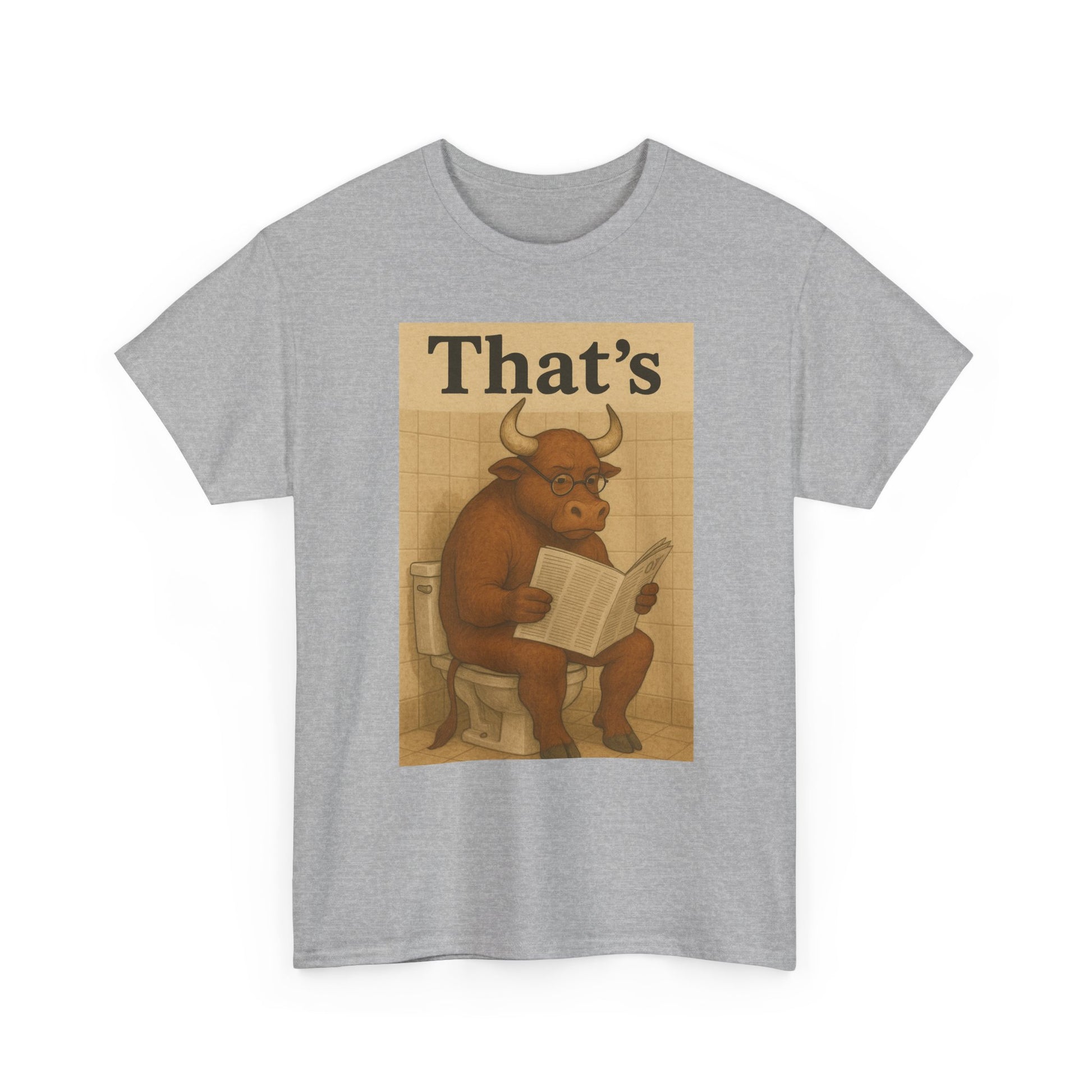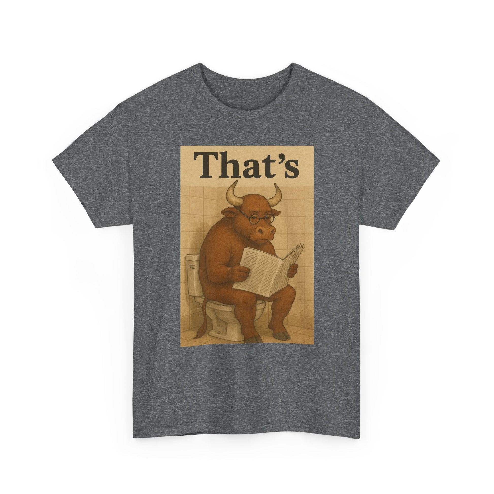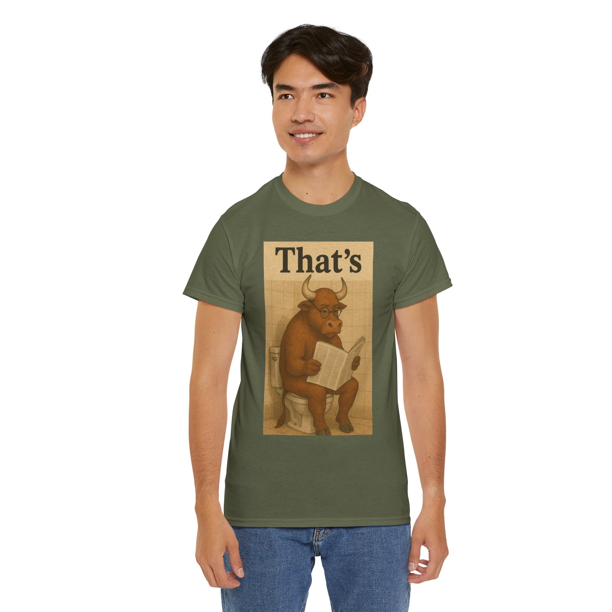 This T-Shirt featuring a bull on the toilet reading a newspaper is a conversation starter. Perfect for those who enjoy quirky and humorous designs, this shirt can be worn casually or as a statement piece. Ideal for individuals with a playful sense of humor, this shirt is great for casual wear, parties, or as a fun gift for friends and family.