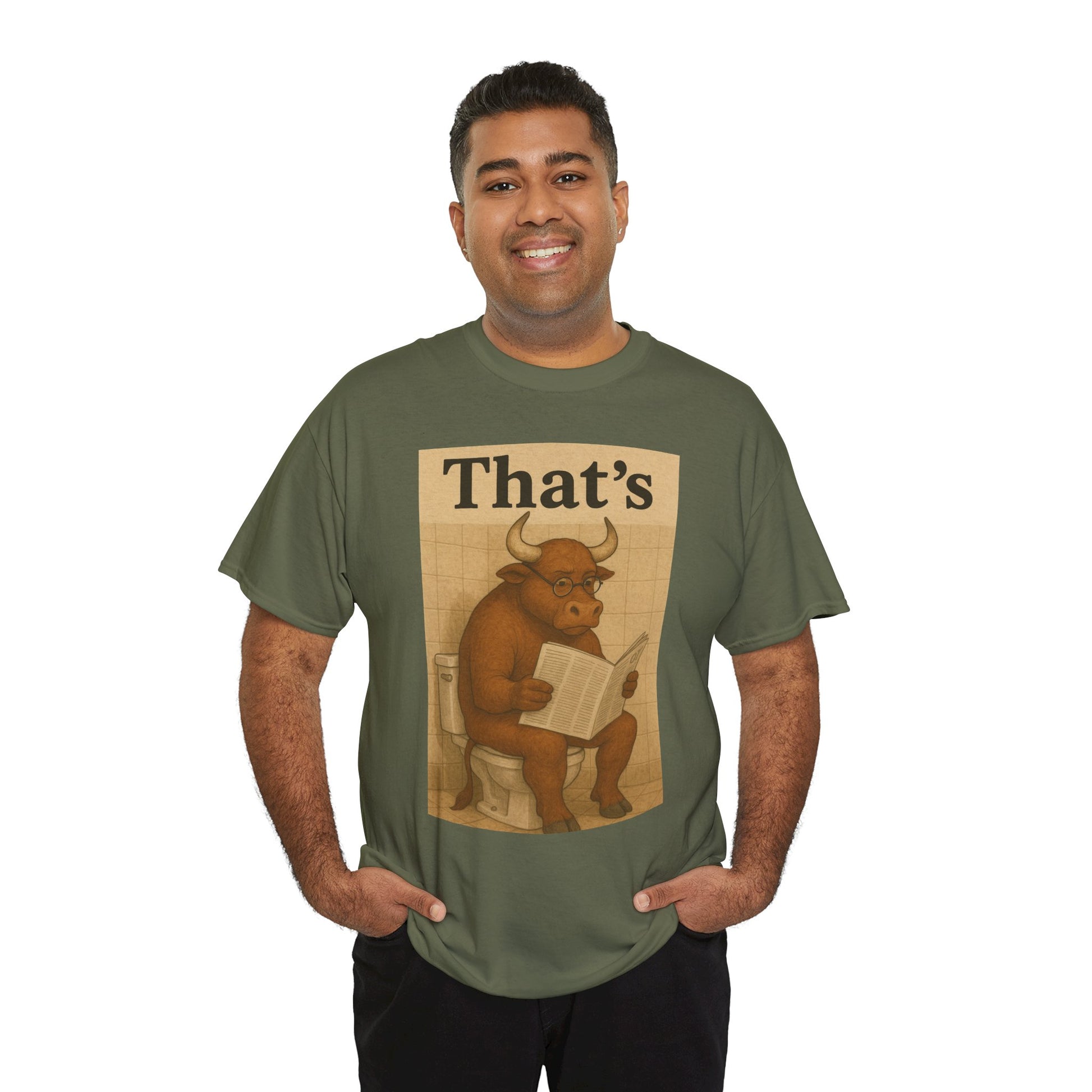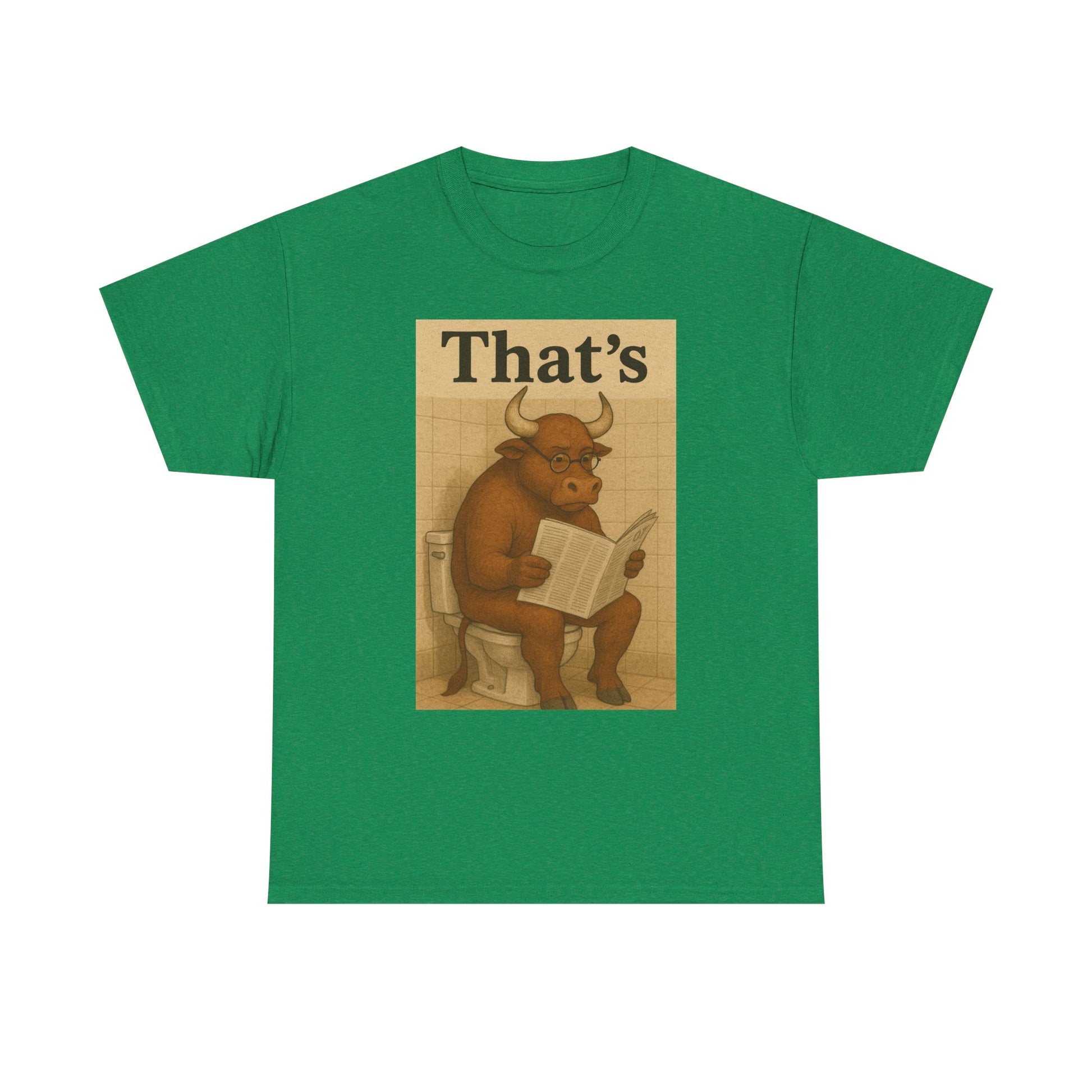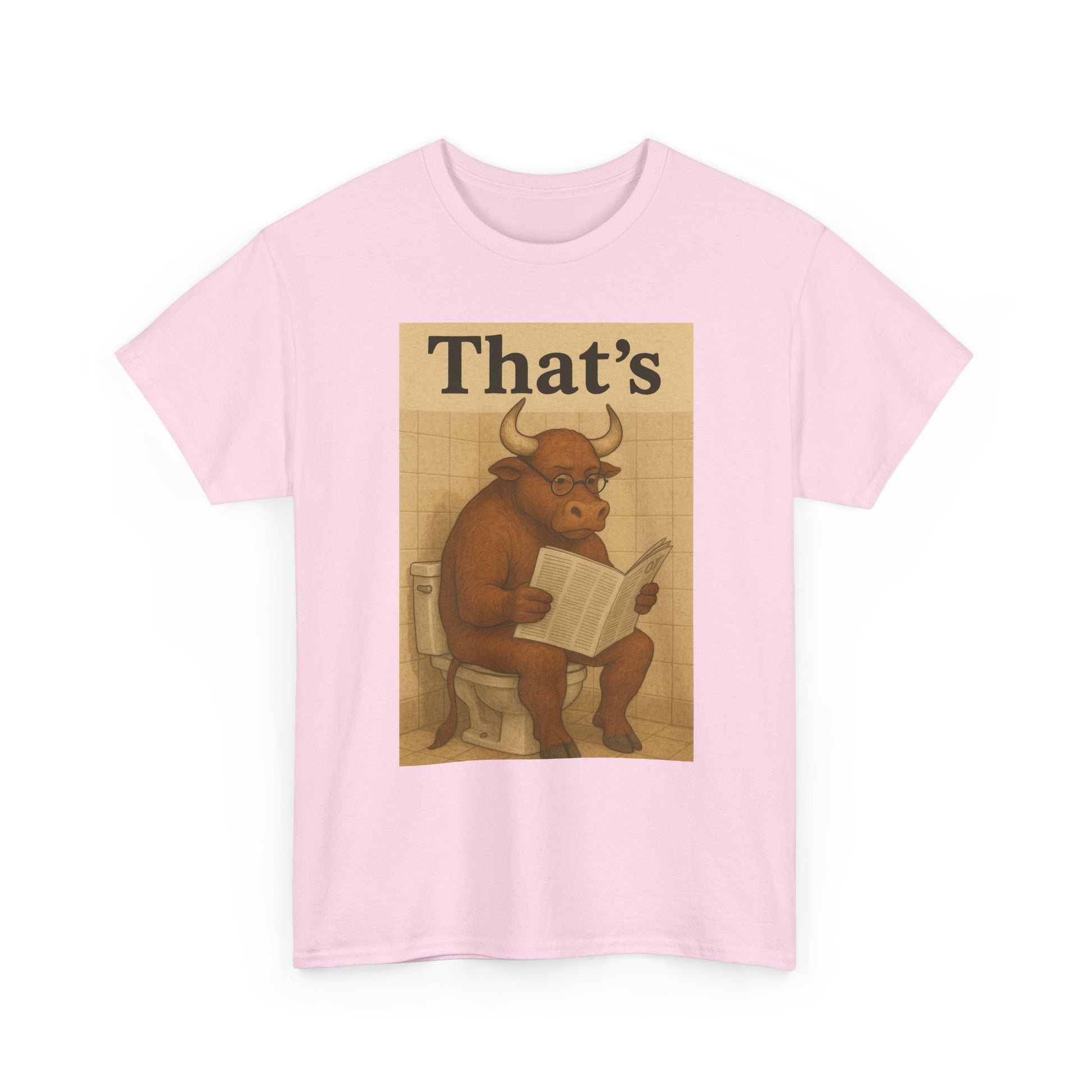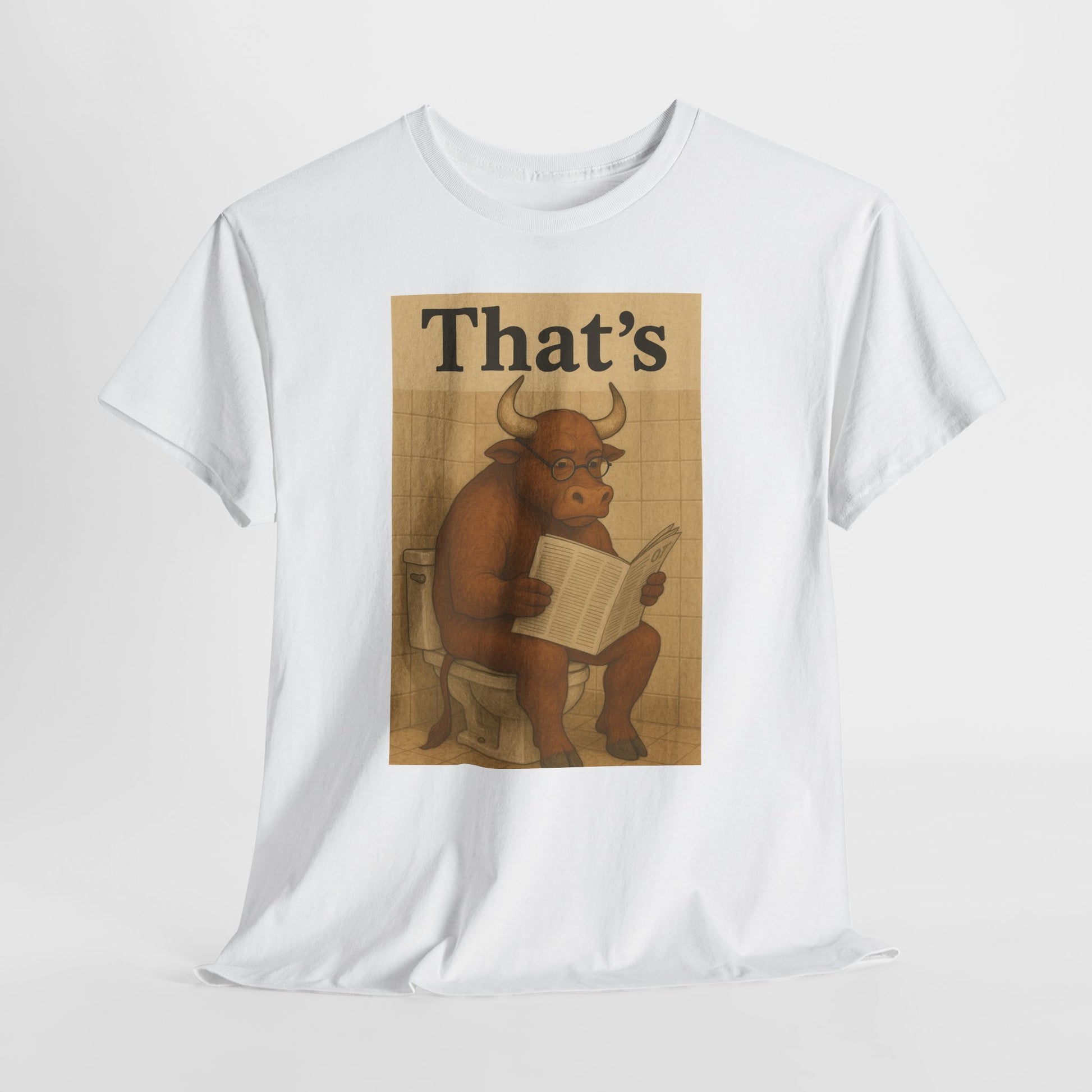 This T-Shirt featuring a bull on the toilet reading a newspaper is a conversation starter. Perfect for those who enjoy quirky and humorous designs, this shirt can be worn casually or as a statement piece. Ideal for individuals with a playful sense of humor, this shirt is great for casual wear, parties, or as a fun gift for friends and family.