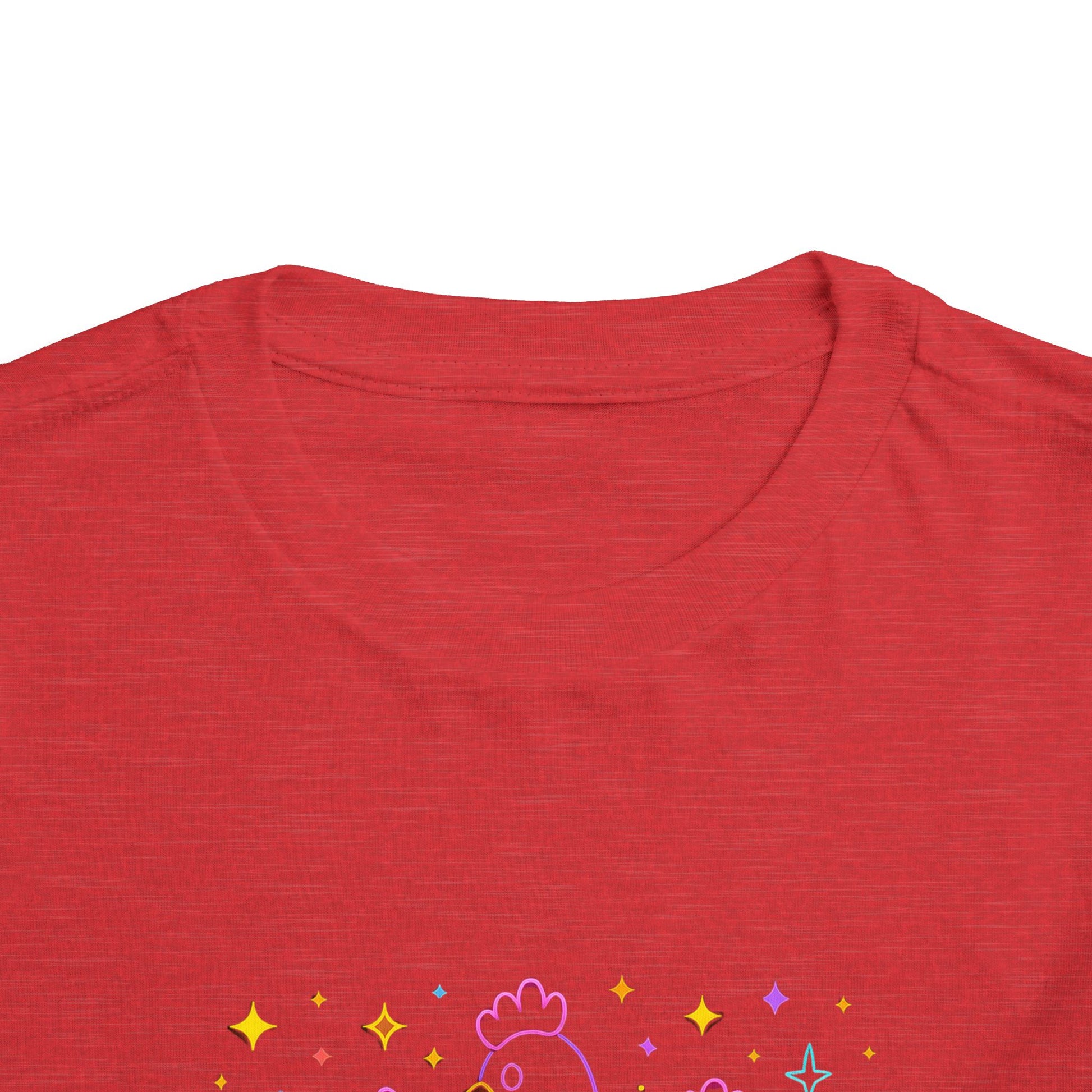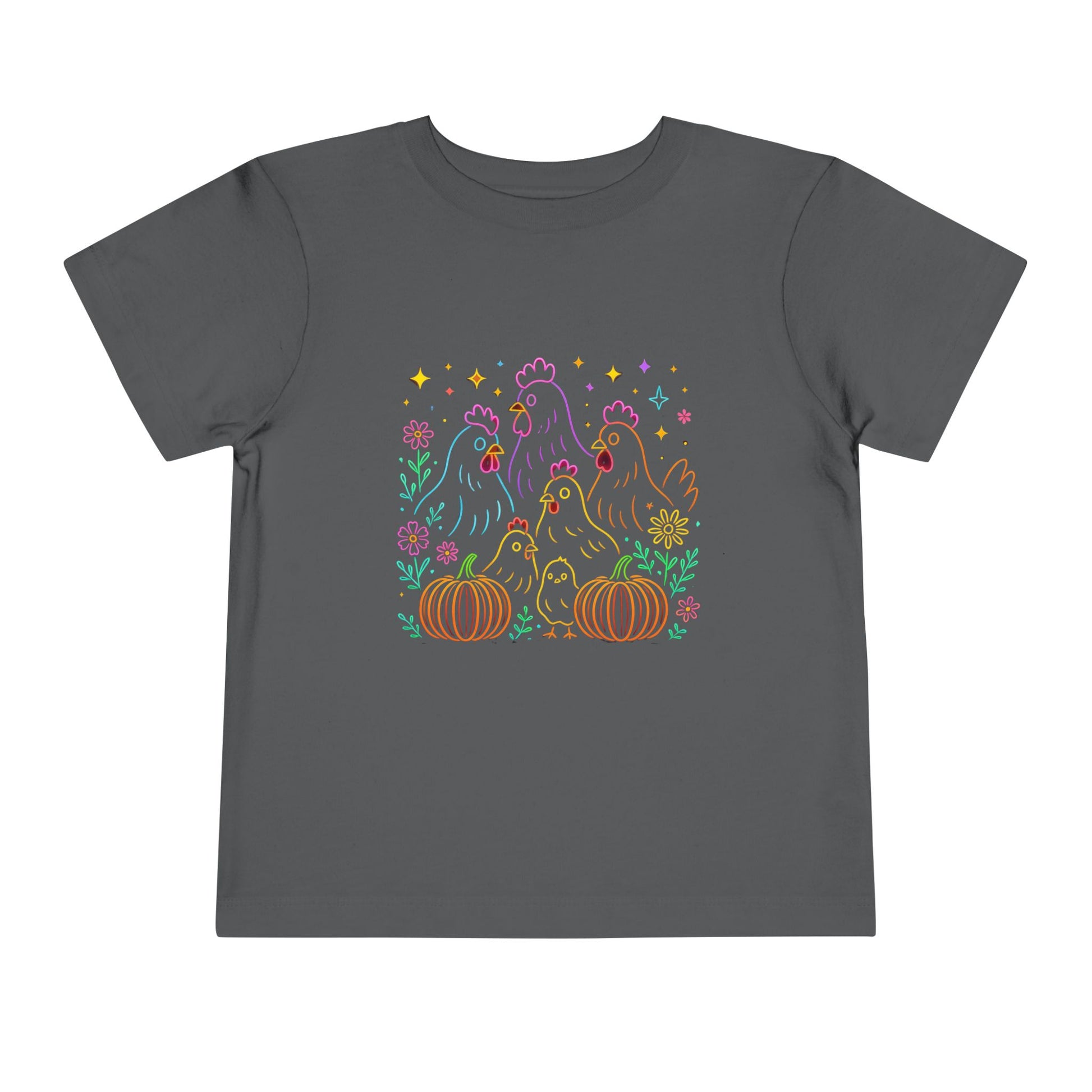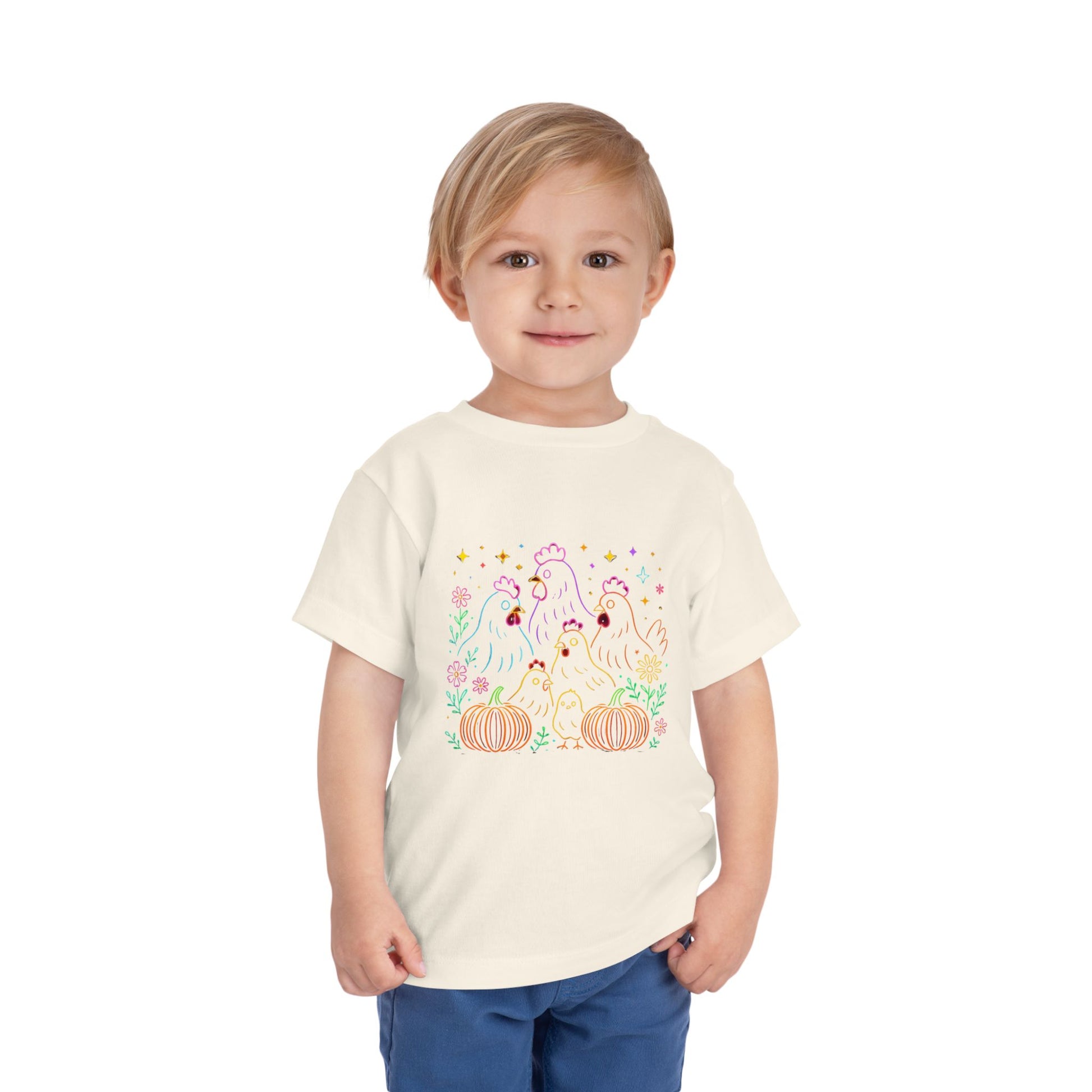 This adorable toddler Christmas tee features a whimsical illustration of colorful chickens, a chick, and pumpkins, perfect for the holidays! The playful design, reminiscent of a children's book illustration, is sure to bring joy. Made with soft, comfortable fabric, it's a great gift for little ones.