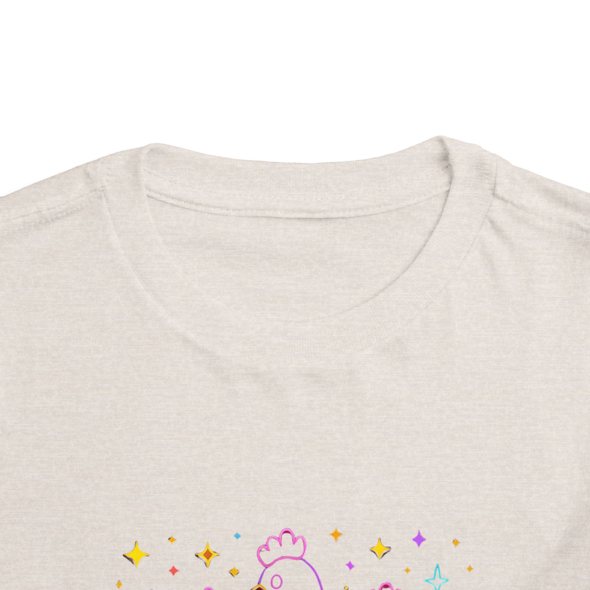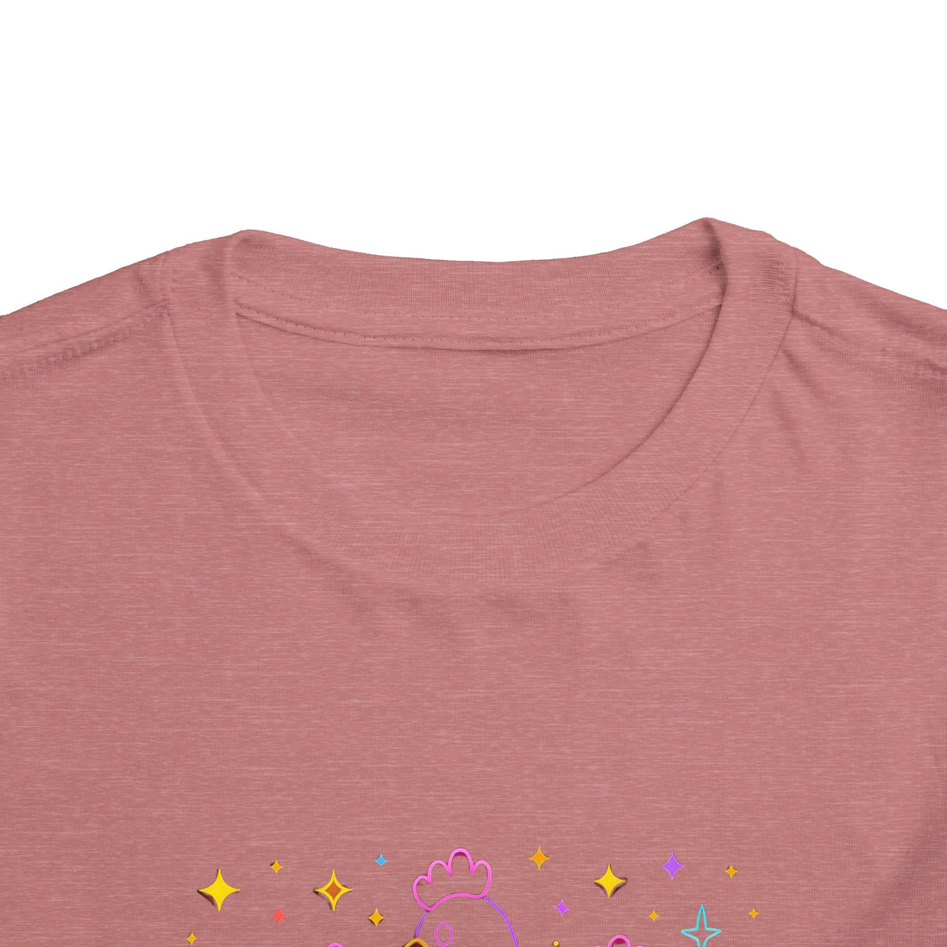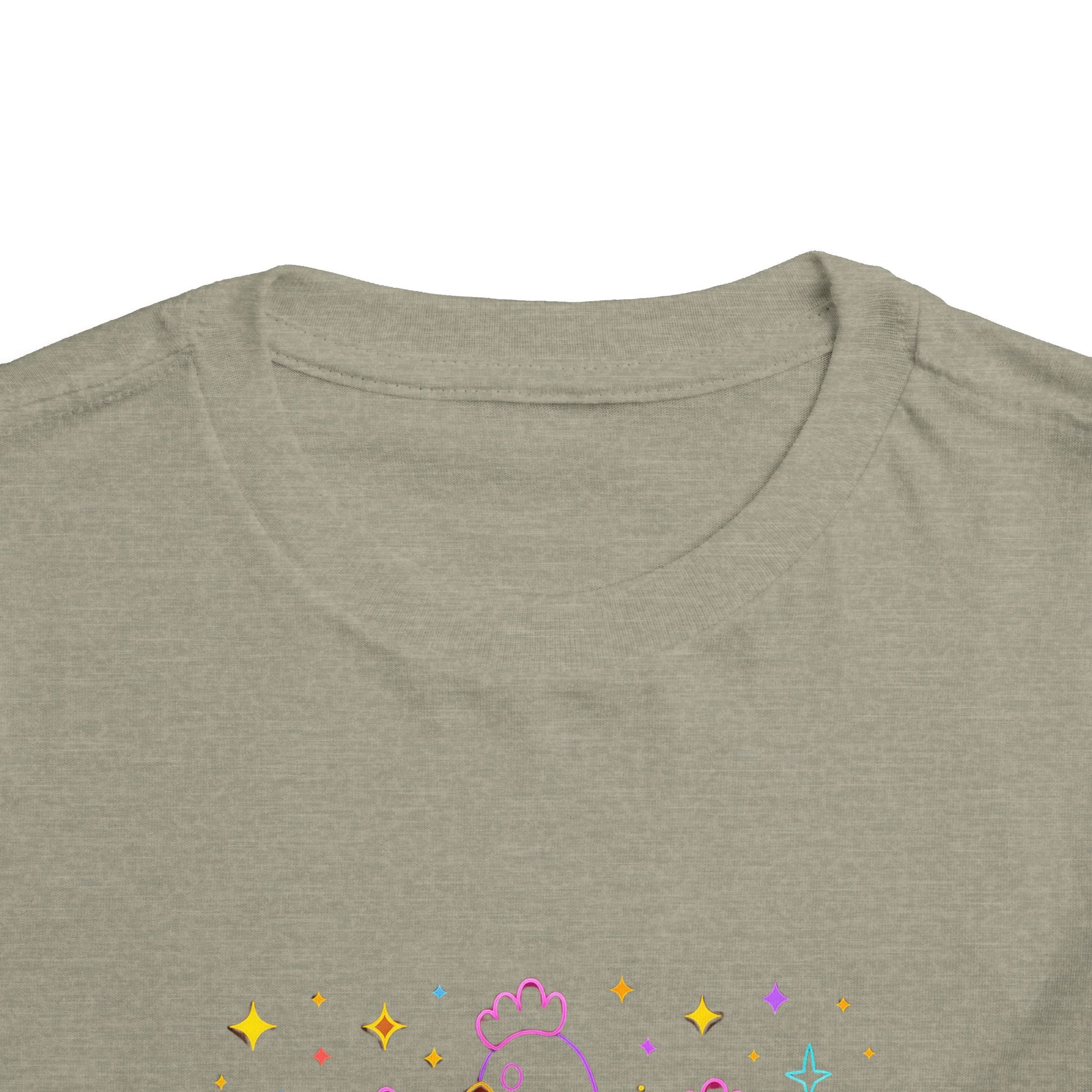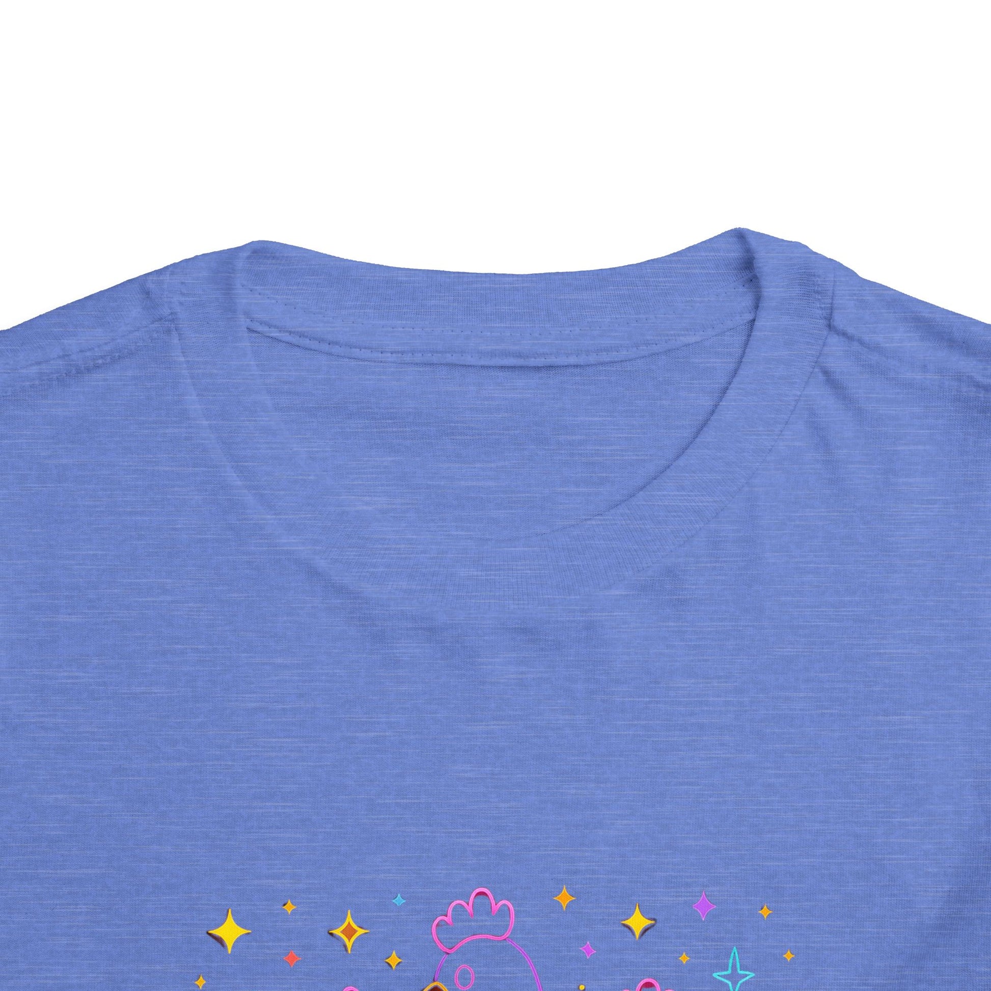 This adorable toddler Christmas tee features a whimsical illustration of colorful chickens, a chick, and pumpkins, perfect for the holidays! The playful design, reminiscent of a children's book illustration, is sure to bring joy. Made with soft, comfortable fabric, it's a great gift for little ones.