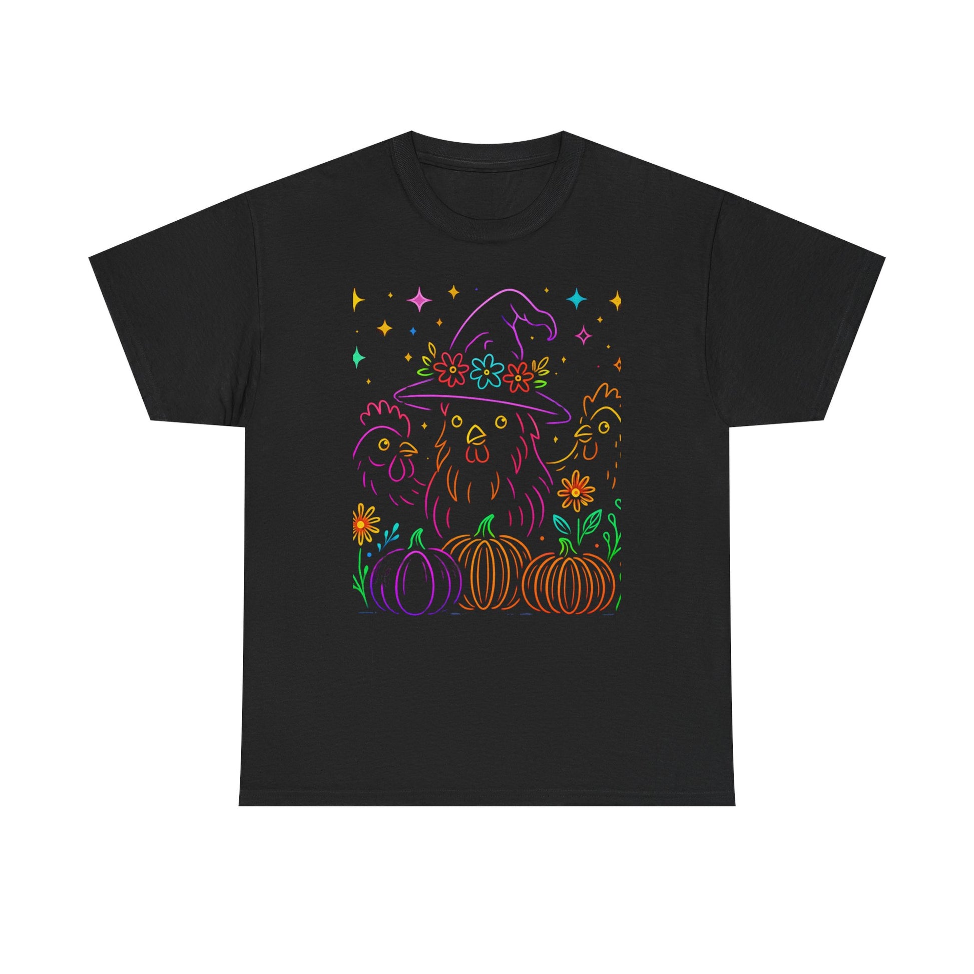 This whimsical Halloween-themed tee, featuring three charming cartoon chickens, one in a witch's hat, surrounded by pumpkins and stars, all in vibrant colors with a gradient effect.