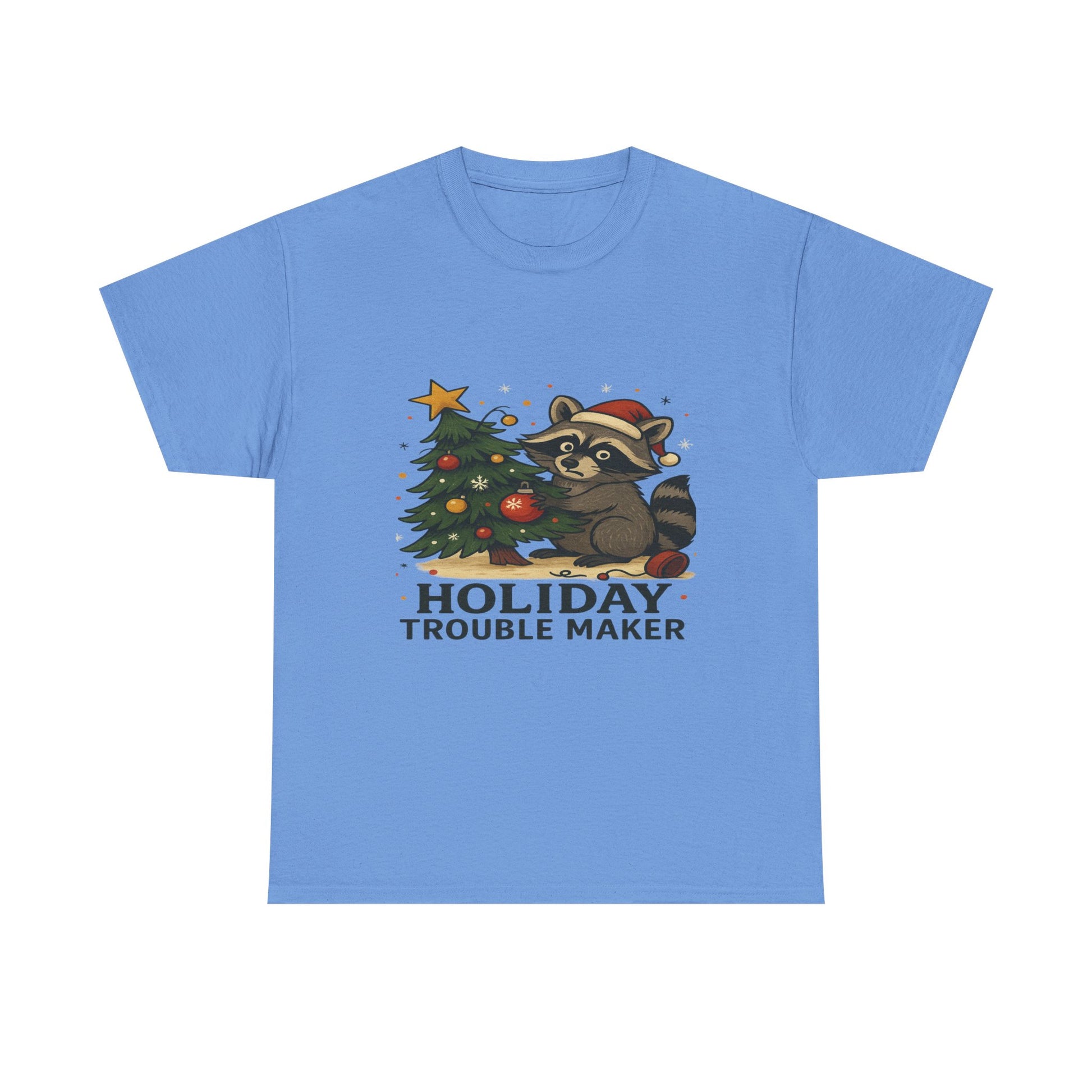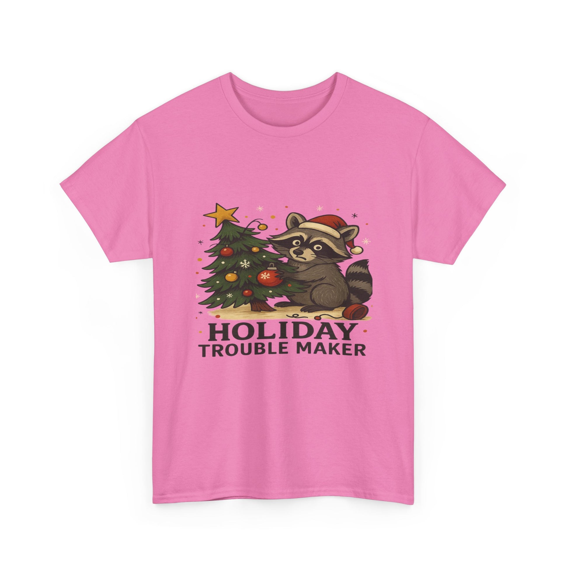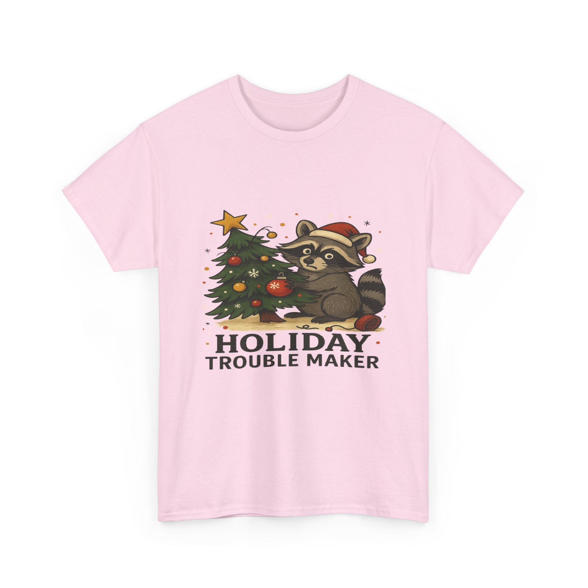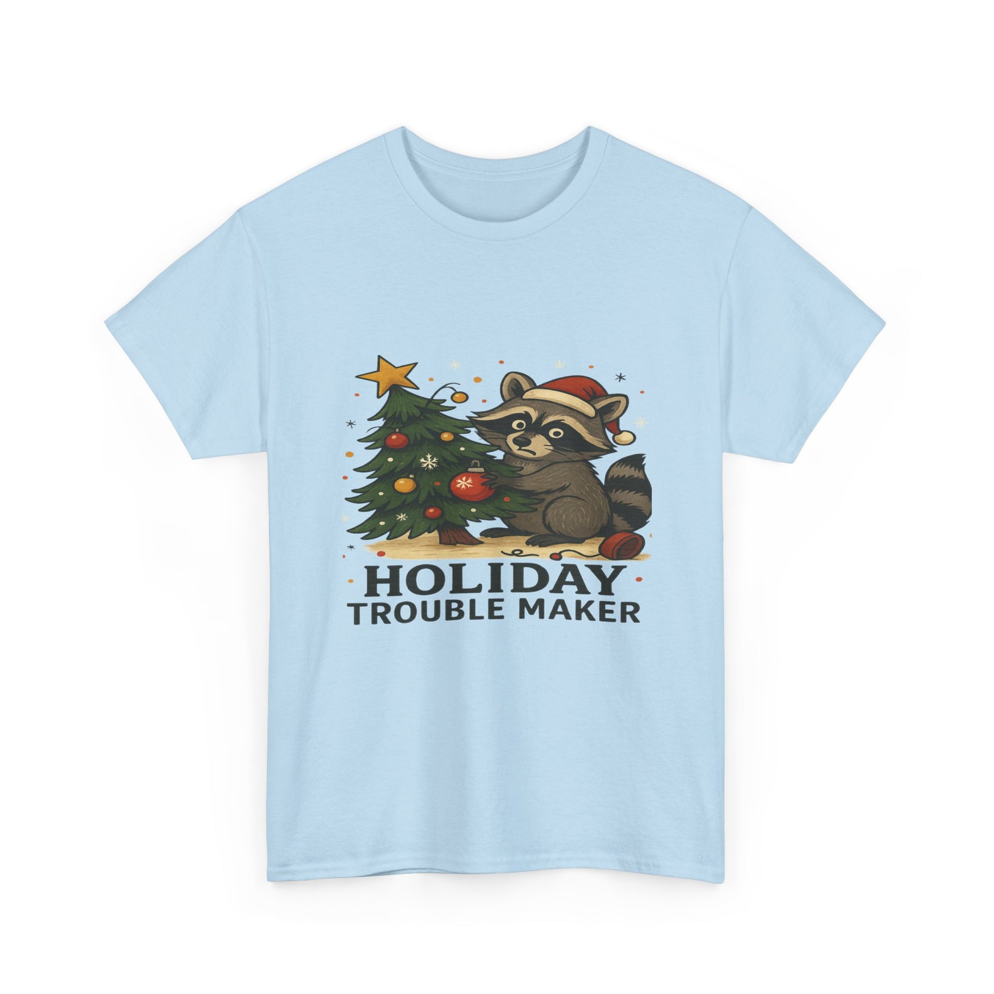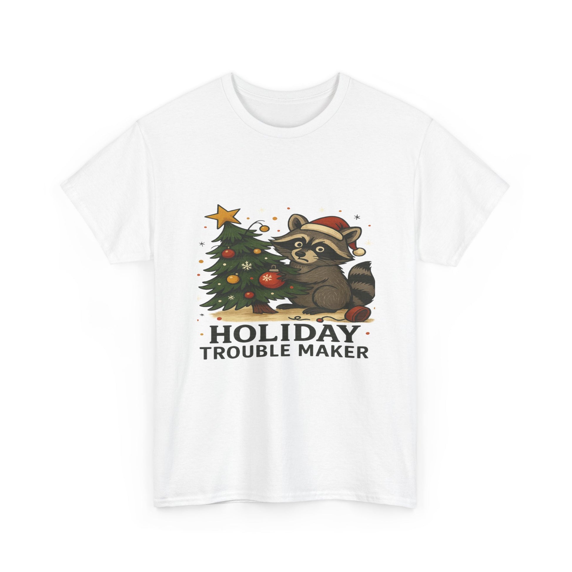 A playful T-Shirt featuring a mischievous raccoon in a Santa hat, decorating a Christmas tree. This design brings a festive touch to the holiday season, perfect for those looking to add some whimsy to their winter wardrobe. Target audience includes adults celebrating Christmas and those who enjoy fun and lighthearted holiday attire.