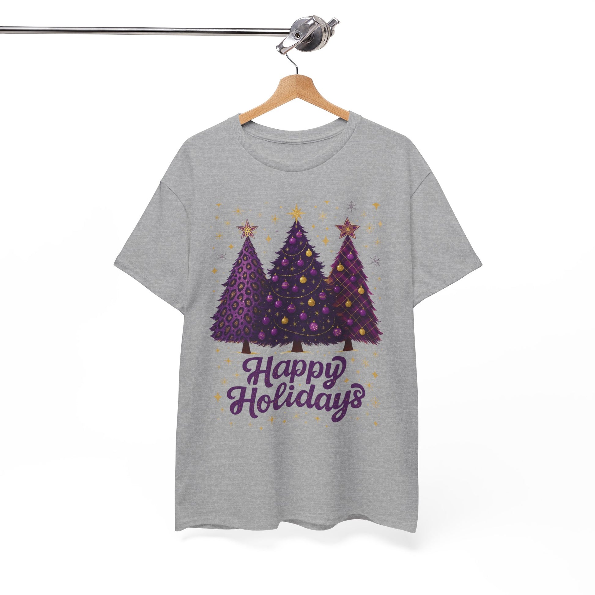 This "Happy Holidays" tee features three stylish Christmas trees in deep purple and gold, each adorned with unique designs. It exudes a festive and joyful vibe, perfect for celebrating the holiday season. The classic fit and comfortable fabric make it suitable for adults looking to add a touch of holiday spirit to their wardrobe.