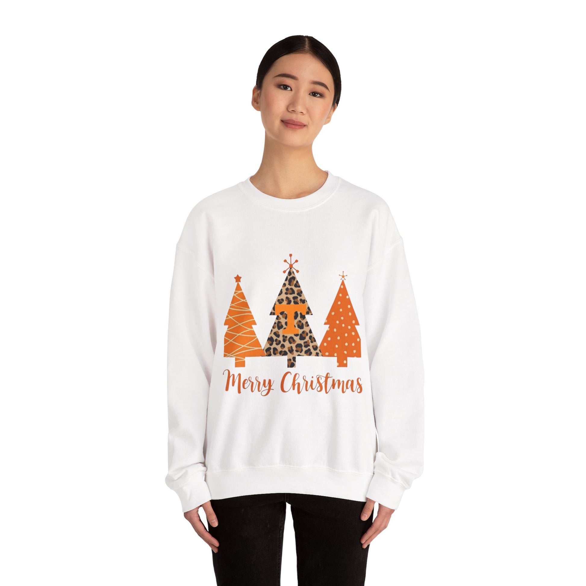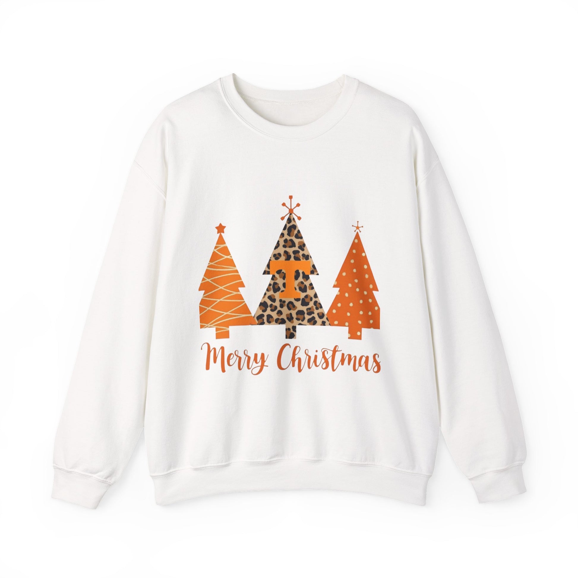 Get ready to celebrate the holidays with a twist! This unique sweatshirt features a festive design that blends the joy of Christmas . Three stylized Christmas trees, each with a distinct pattern and topped with festive ornaments, stand above the words "Merry Christmas" in a playful cursive font. The overall impression is modern and slightly rustic, making it the perfect statement piece for the season.