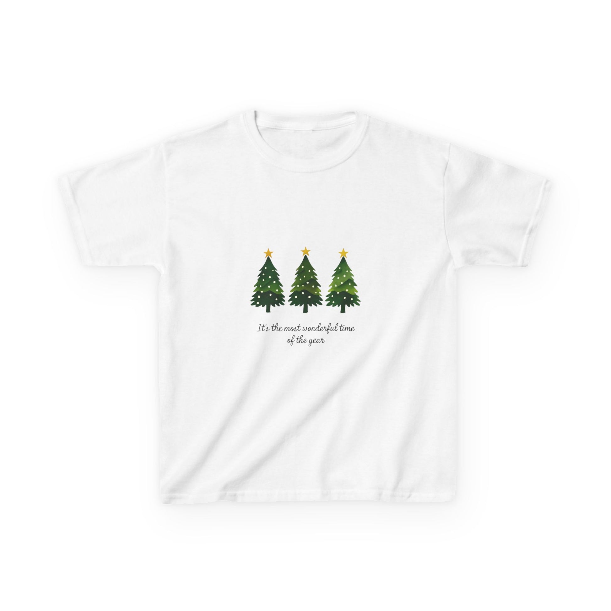 Spread holiday cheer with this adorable dinosaur Christmas tee! Featuring three stylized Christmas trees and the phrase "It's the most wonderful time of the year" in a cute, handwritten font. The design is perfect for festive kids' parties or everyday wear. This fun and stylish tee is a must-have for any little dinosaur lover during the holidays. Made with soft, comfortable fabric for all-day play.