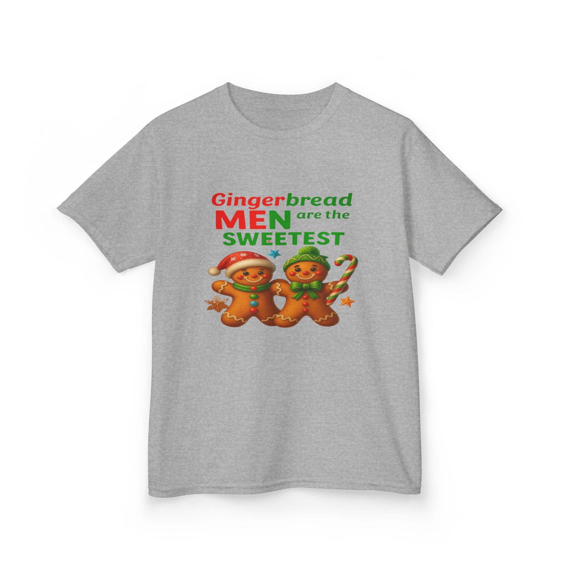 Get your little one ready for the holidays with this adorable gingerbread men tee! Featuring two cheerful gingerbread men, one in a Santa hat and the other in a knit cap, this shirt is bursting with festive charm. The playful design showcases the words "Gingerbread MEN are the SWEETEST" in bold, colorful fonts, surrounded by stars and snowflakes. Made from soft, comfortable fabric, this tee is perfect for Christmas parties, holiday photos, or everyday wear. It's a sweet and fun gift for any child!