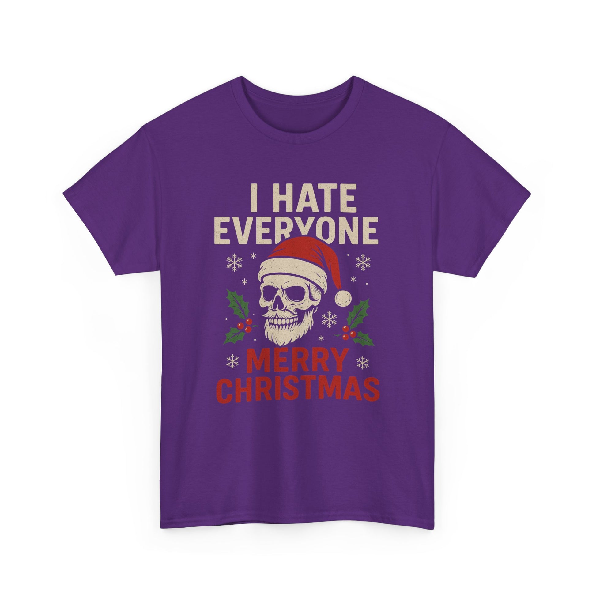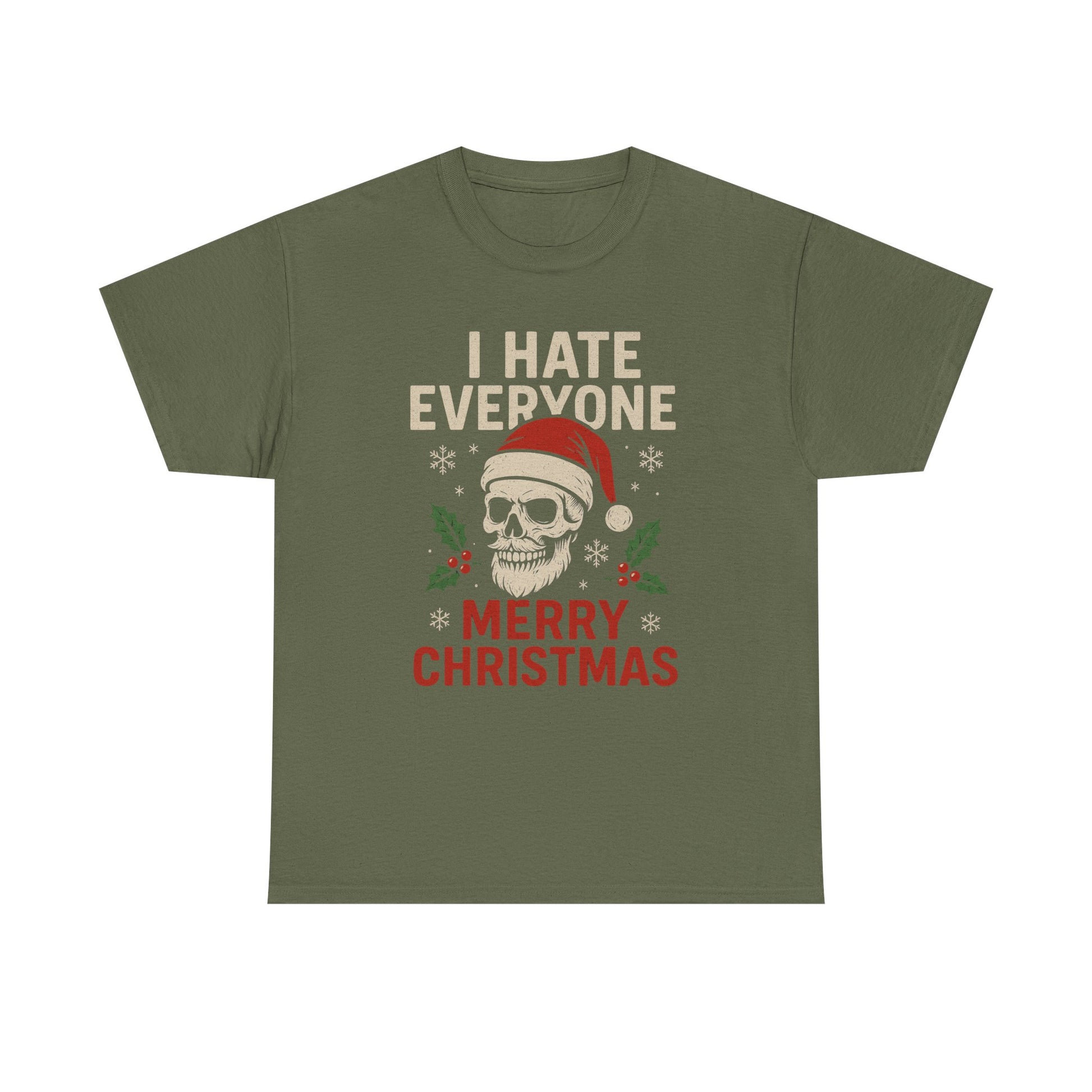 Embrace the holiday season with a touch of dark humor! This unique t-shirt features a detailed skull wearing a Santa hat, holly accents, and a snowflake background. The bold "I HATE EVERYONE" and "MERRY CHRISTMAS" text create a fun, edgy contrast, perfect for anyone who appreciates a cynical holiday vibe.