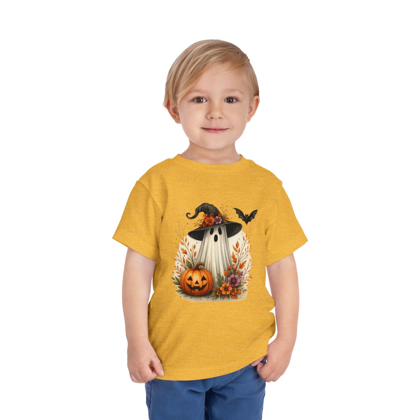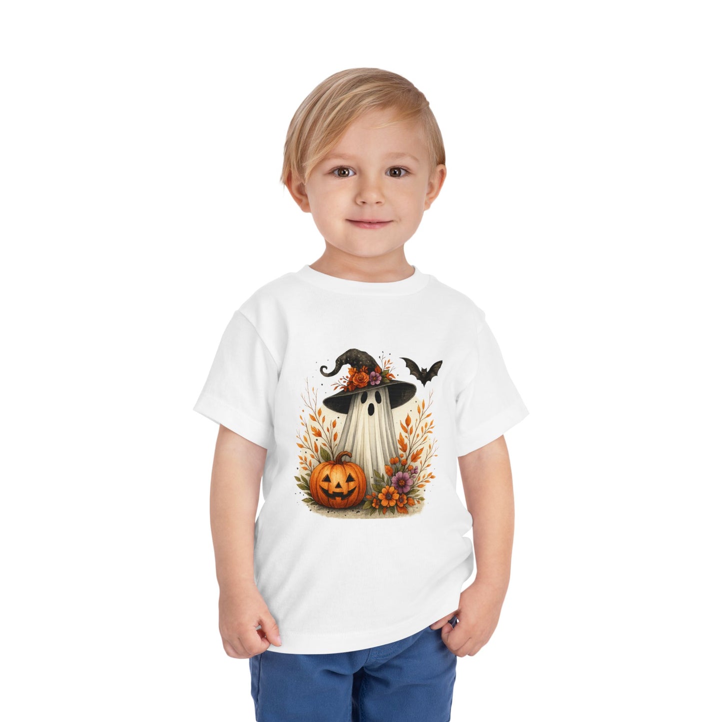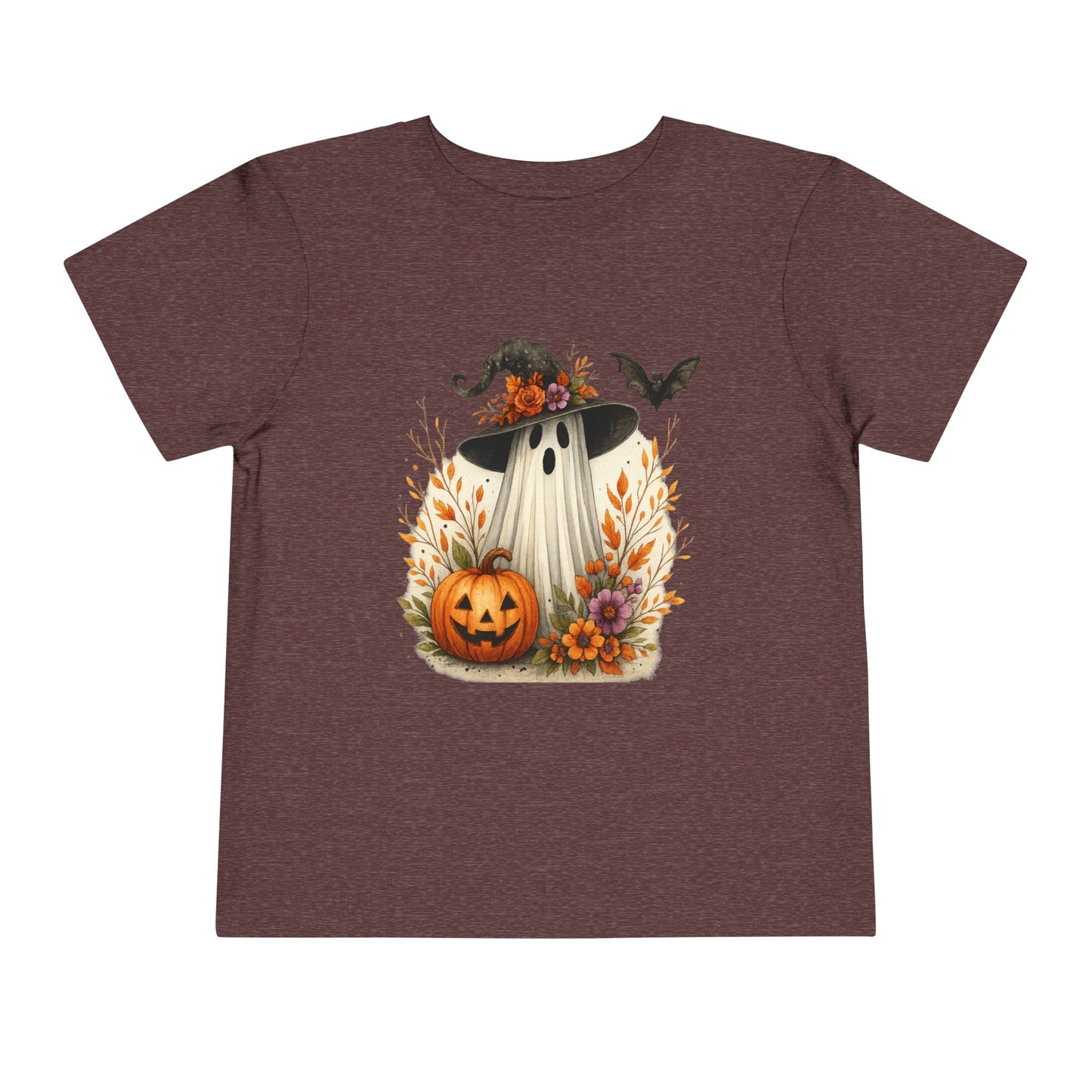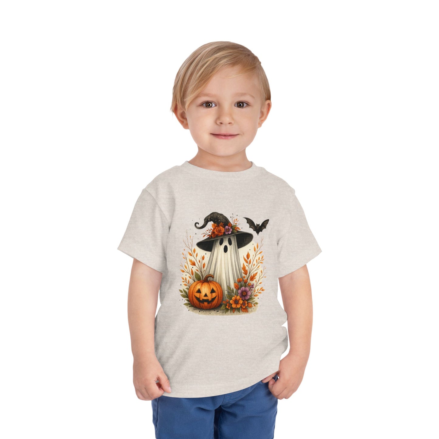 This adorable Halloween-themed tee features a friendly ghost wearing a witch's hat, surrounded by autumn elements. The watercolor style and soft colors create a warm and inviting feel, perfect for toddlers to wear during Halloween festivities.