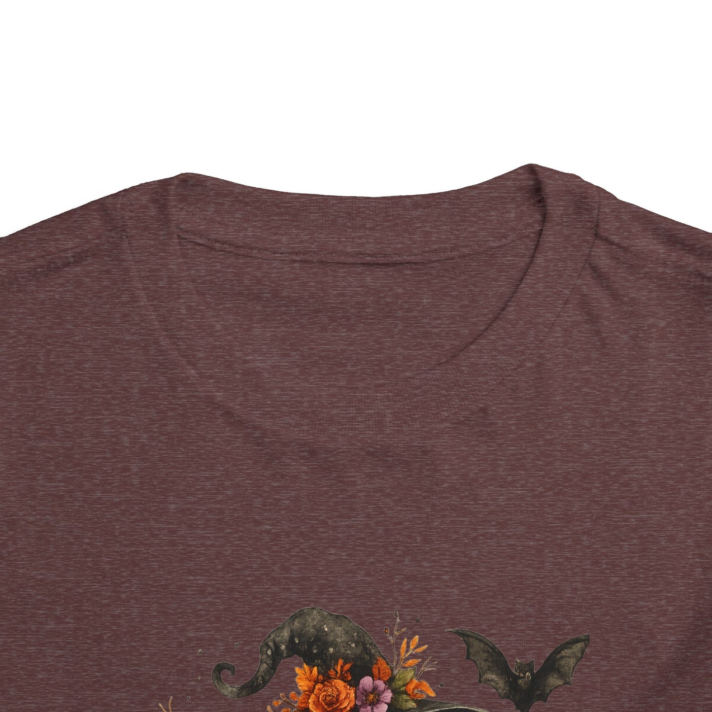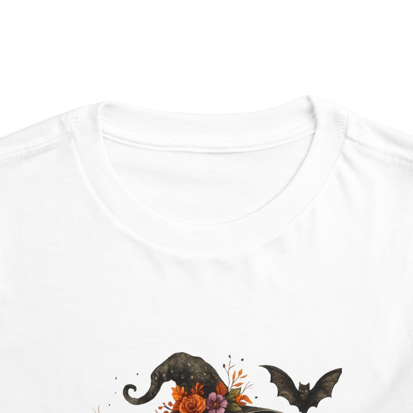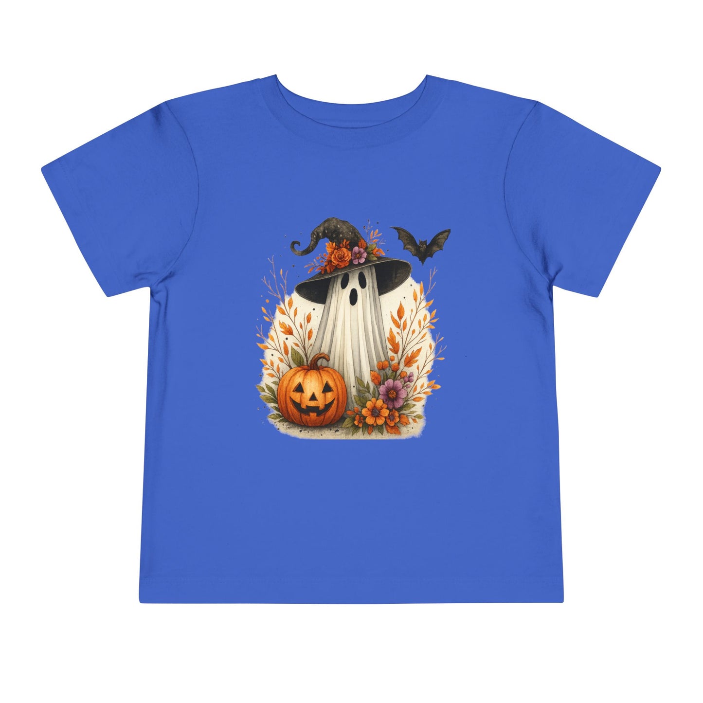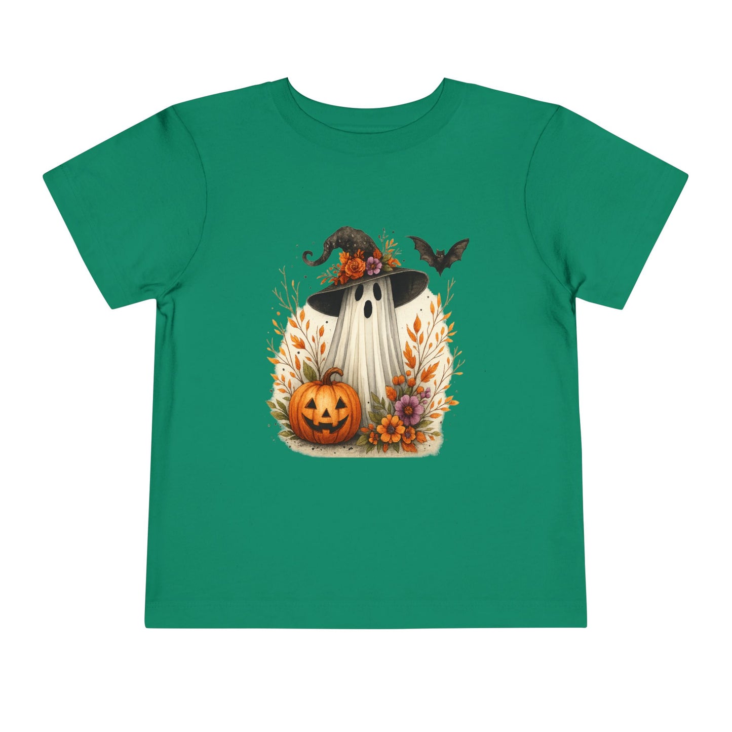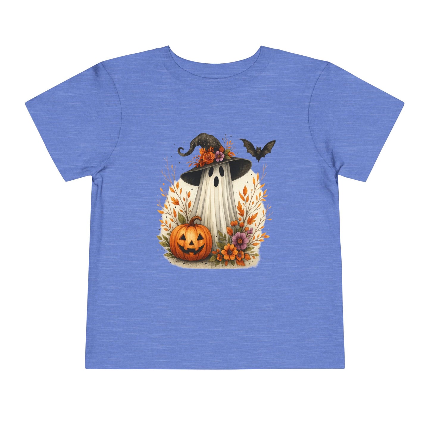 This adorable Halloween-themed tee features a friendly ghost wearing a witch's hat, surrounded by autumn elements. The watercolor style and soft colors create a warm and inviting feel, perfect for toddlers to wear during Halloween festivities.