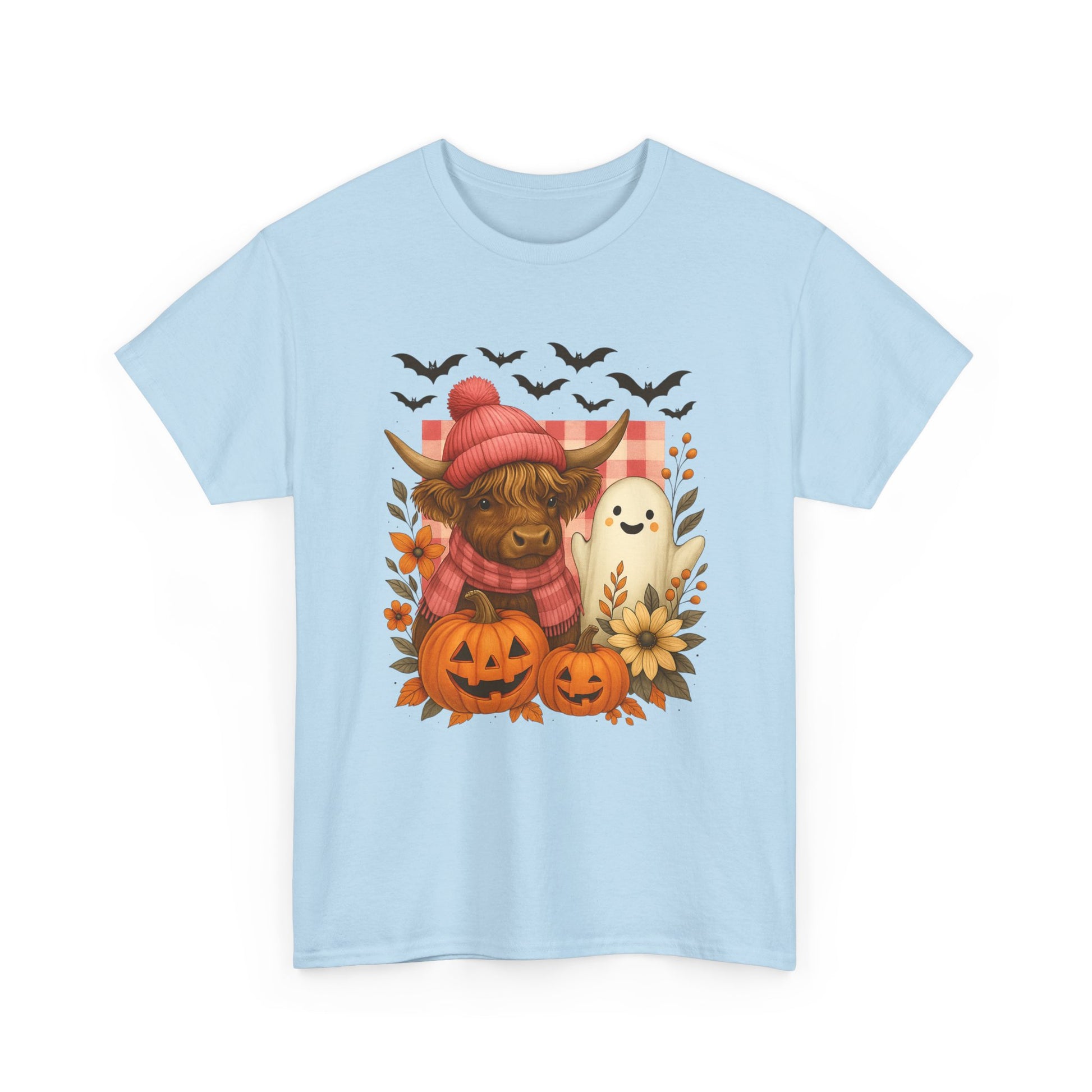 Spread hope with our charming Halloween-themed cancer awareness tee! Featuring a friendly Highland cow in a festive hat alongside a ghost and glowing pumpkins, this design is sure to bring smiles. The warm color palette and playful illustrations make this unisex tee perfect for showing support and raising awareness during the Halloween season. Show your support with this unique and uplifting design!