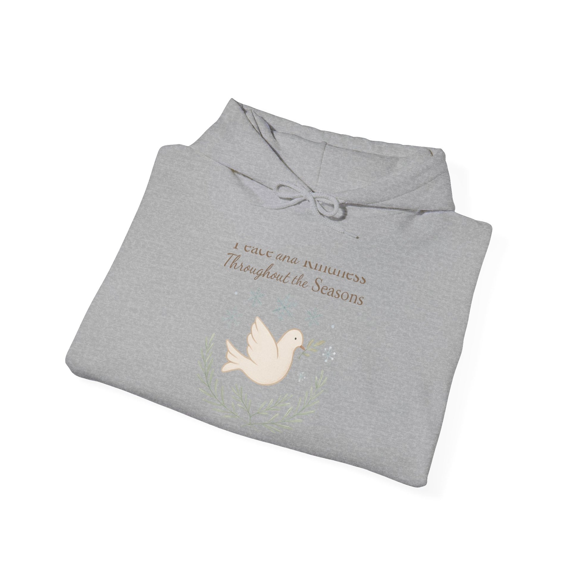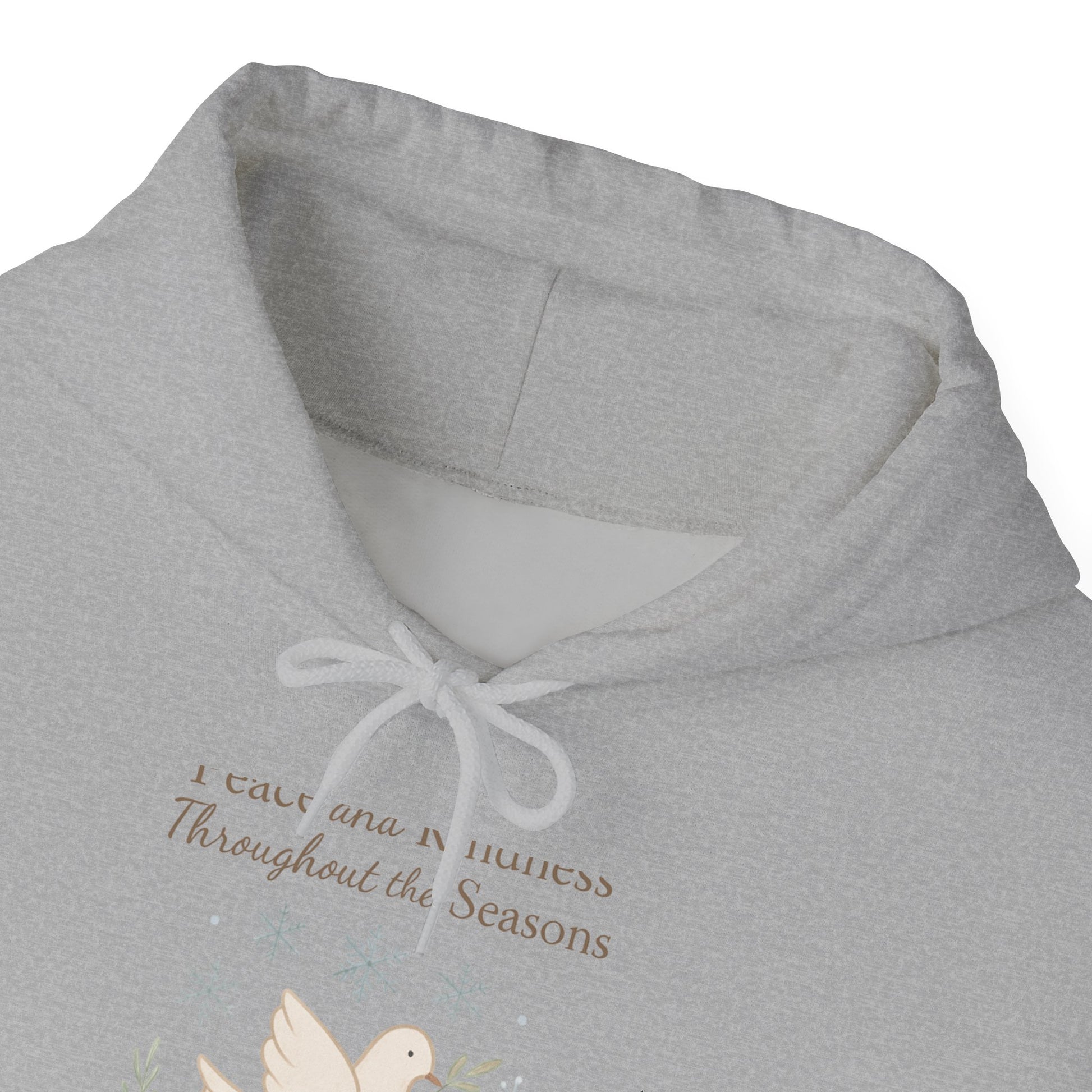 A soft, cozy hooded sweatshirt that carries a quiet, seasonal charm. The minimalist front design — a gentle dove framed by laurel leaves and subtle winter motifs — reads like a gentle note of calm. Lightweight but warm, the hood and roomy kangaroo pouch make it a go-to layer for slow walks, wrapping up at home with a mug, or low-key holiday gatherings. The muted palette and simple illustration blend into everyday wear while still feeling thoughtful and intentional.