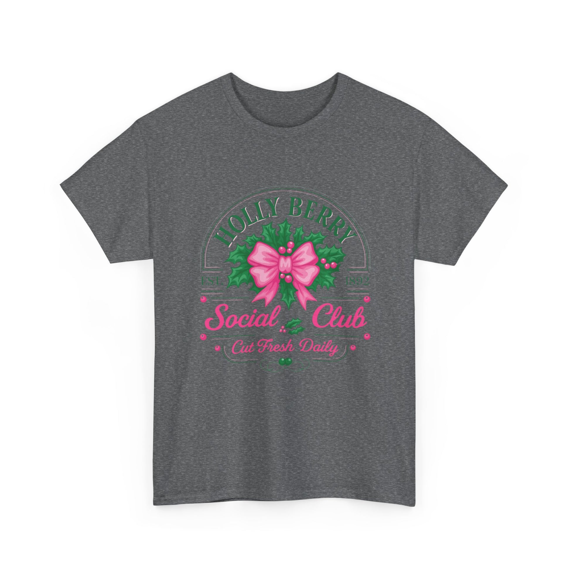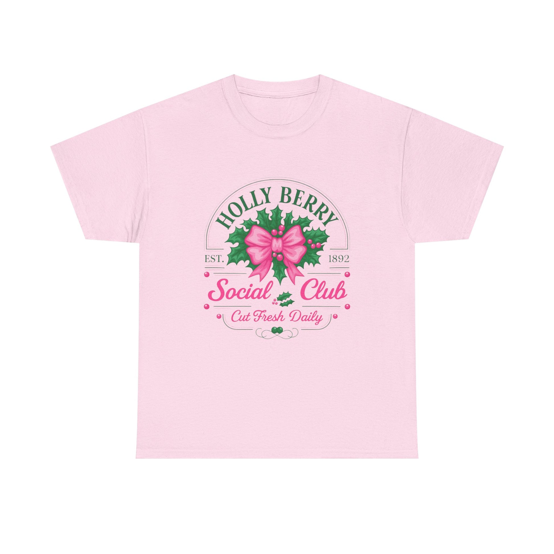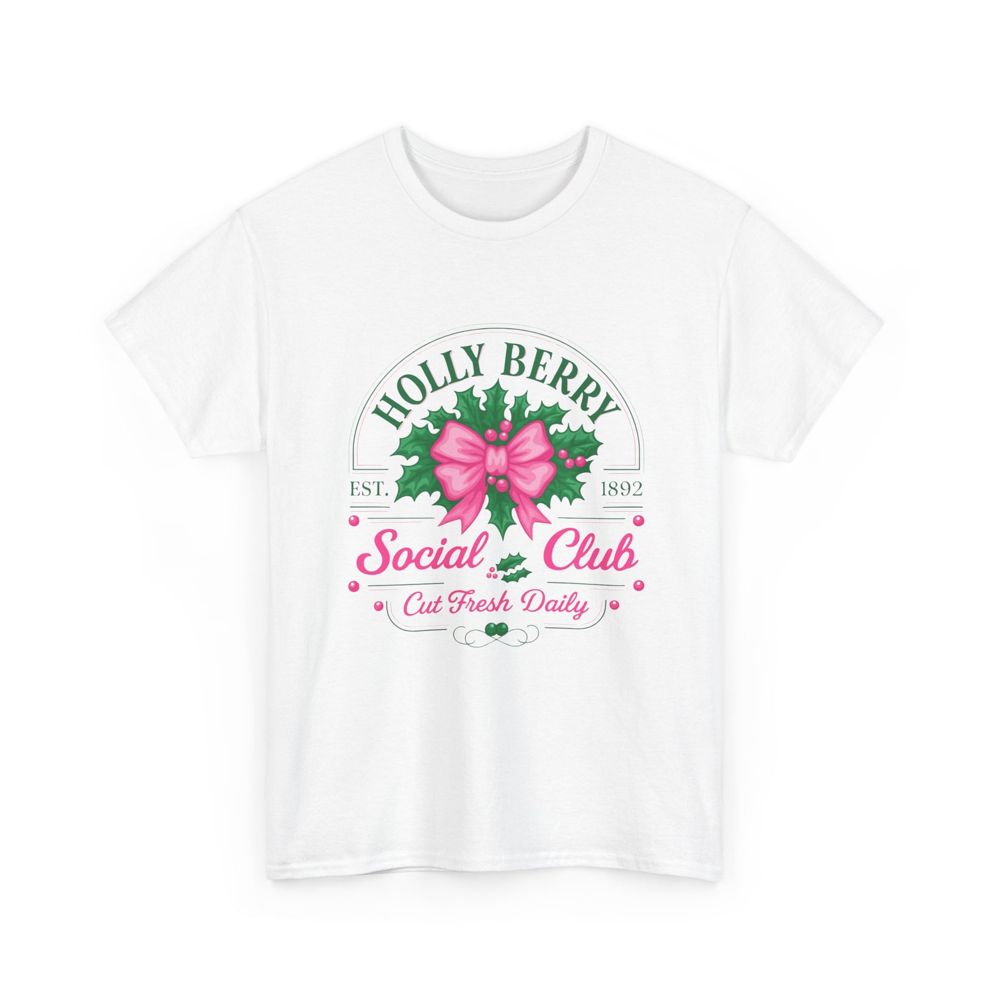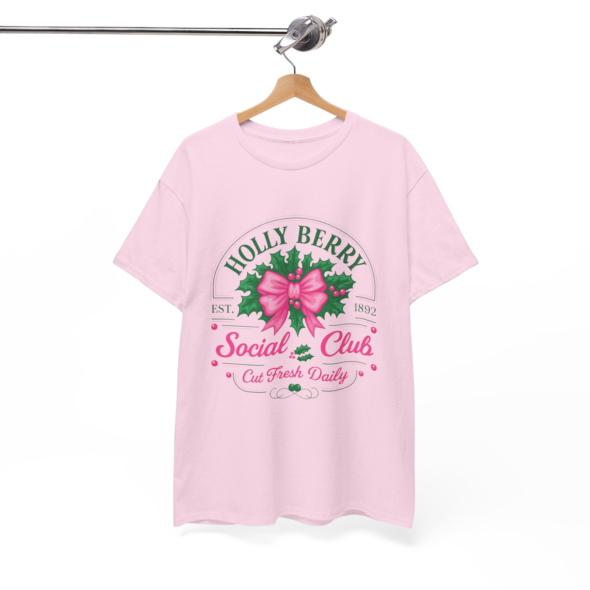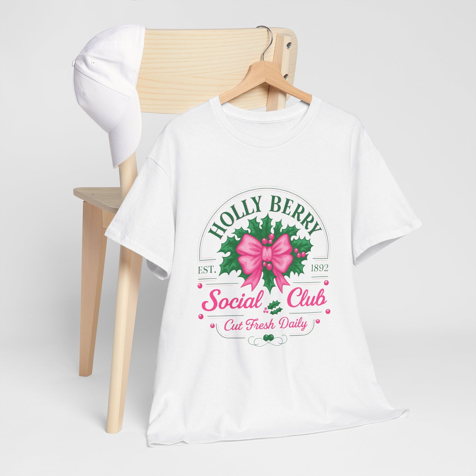Celebrate with our 'Holly Berry Social Club' tee! This vintage-inspired design features a festive holly arrangement with pink accents.