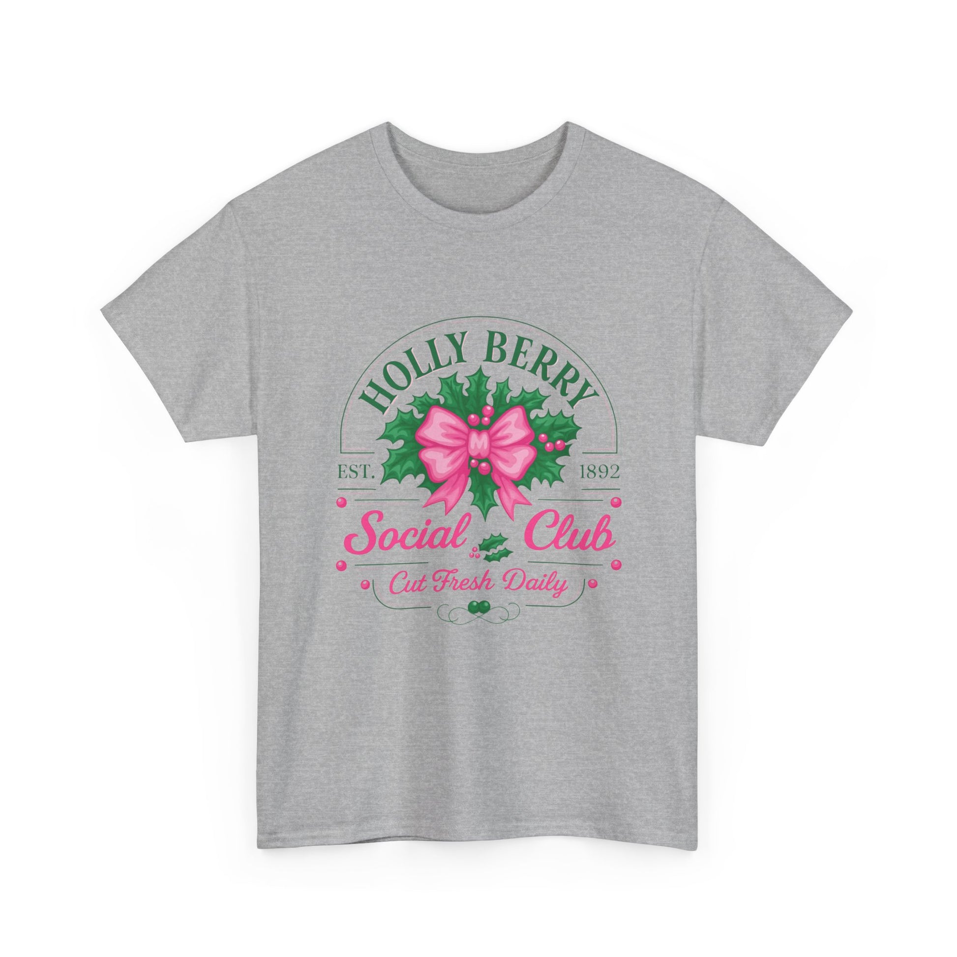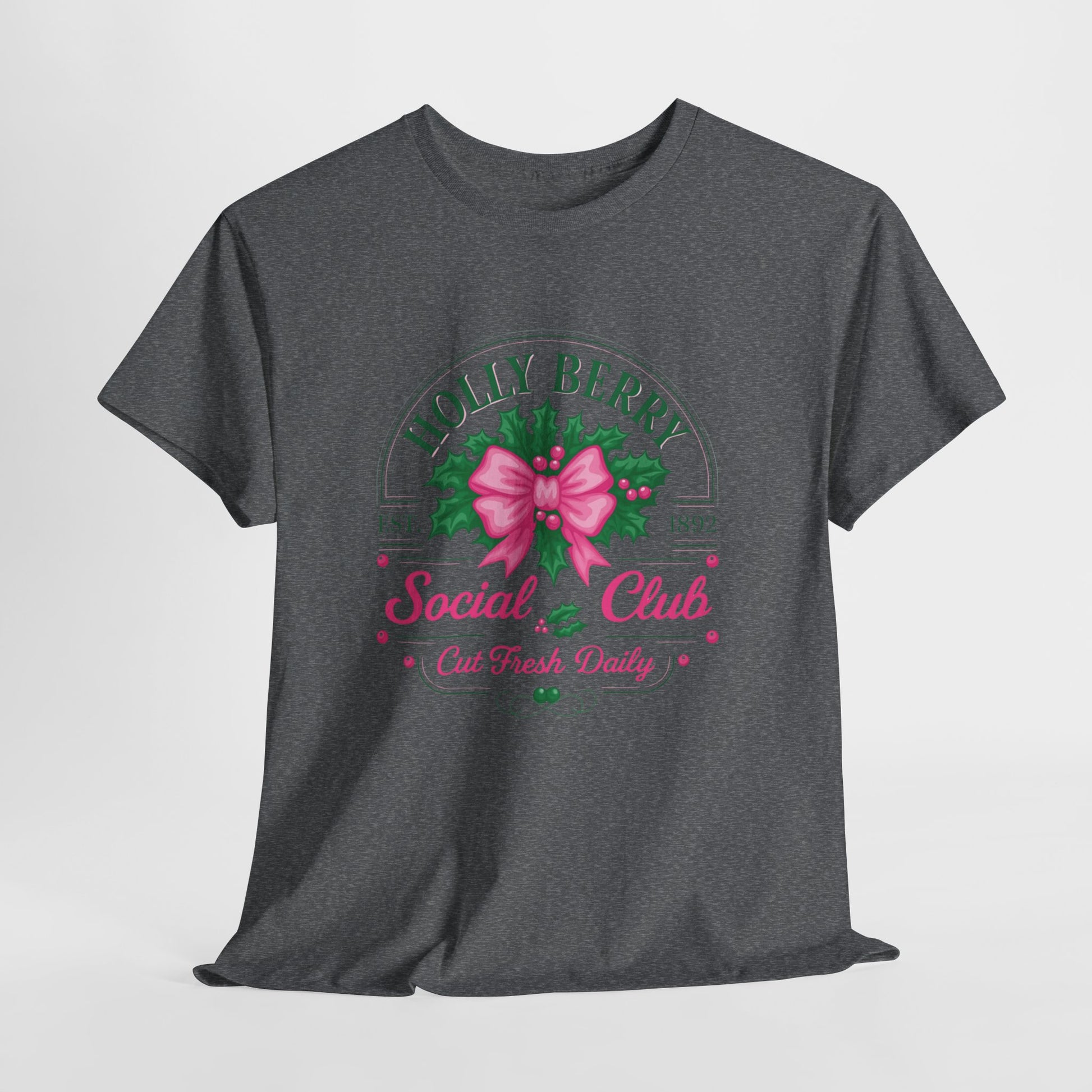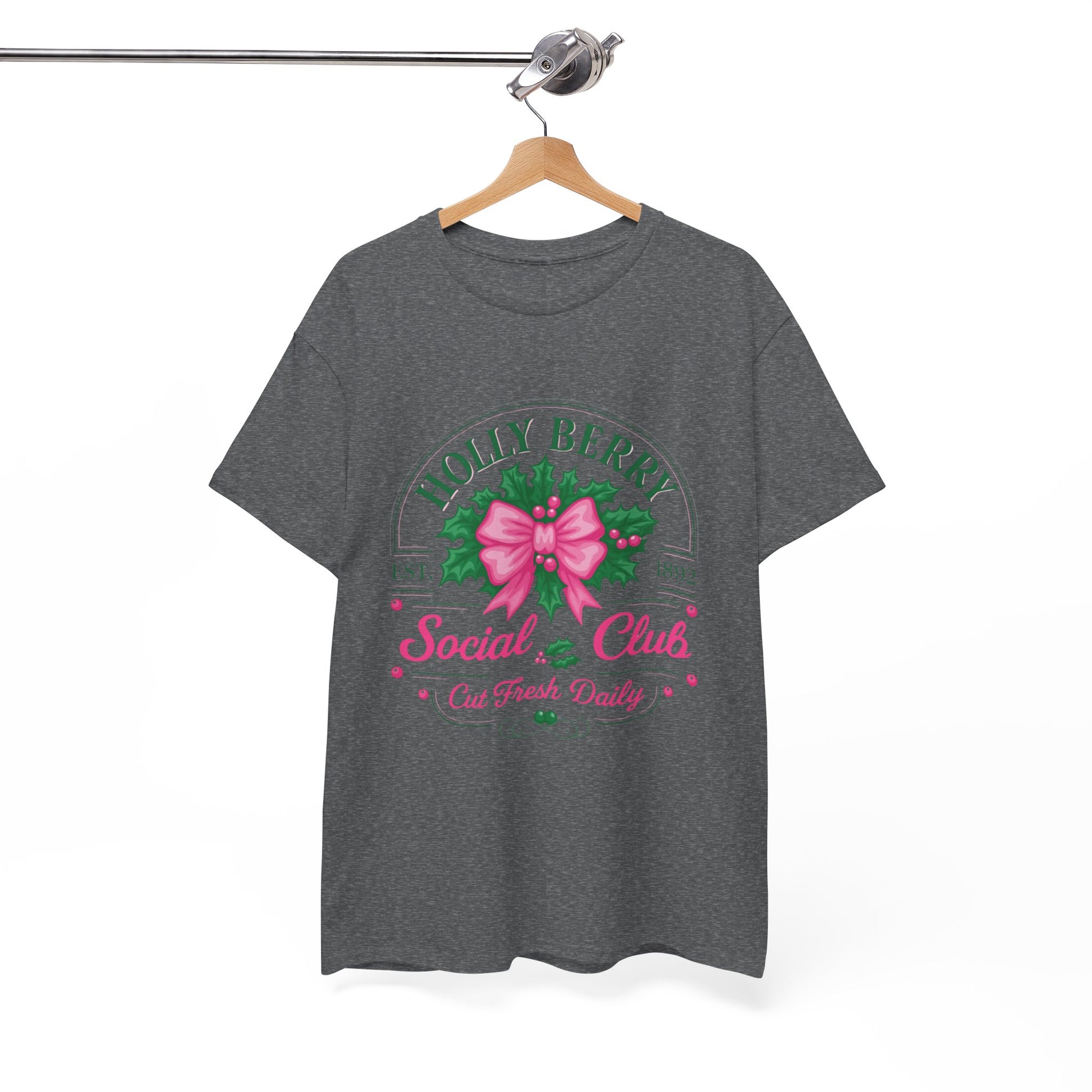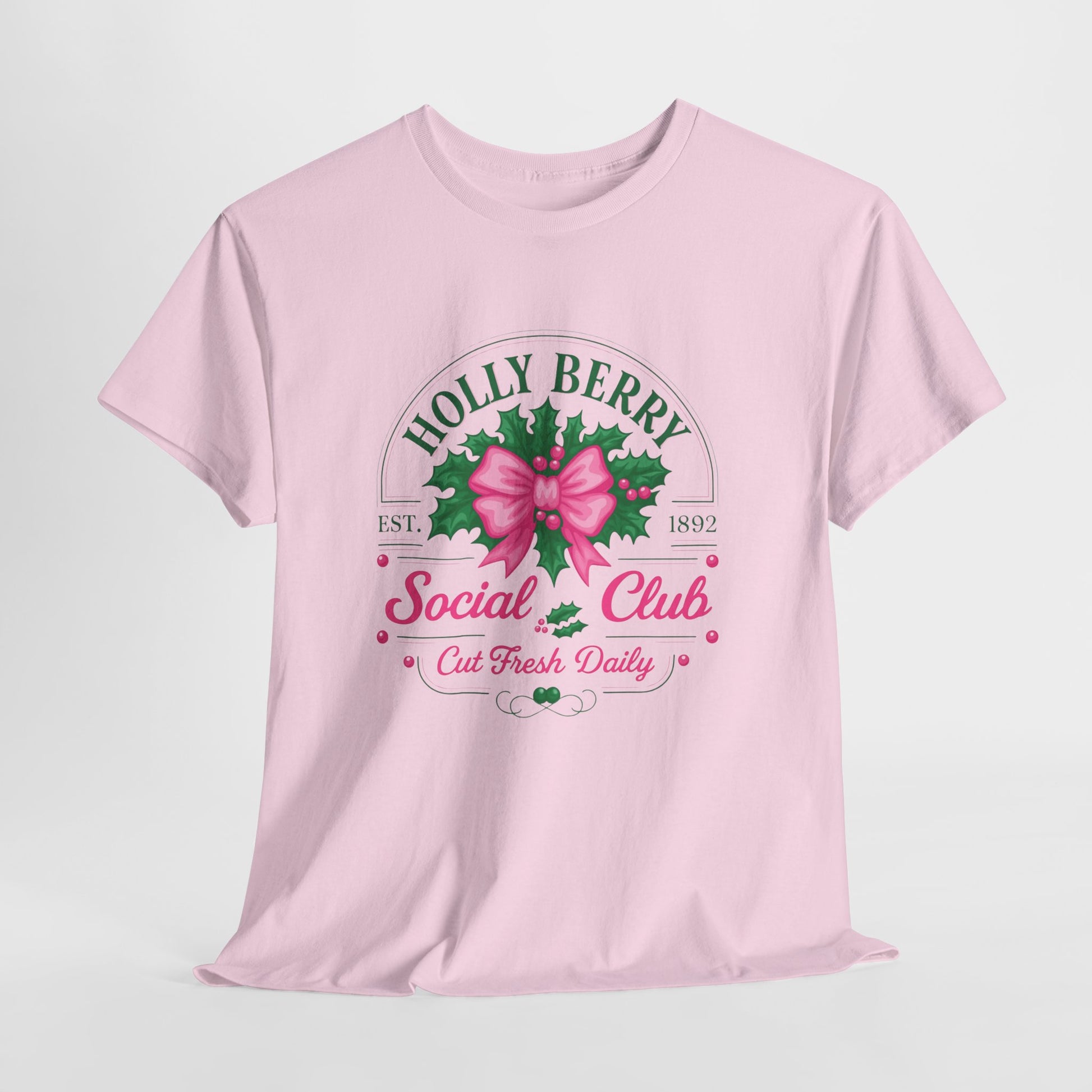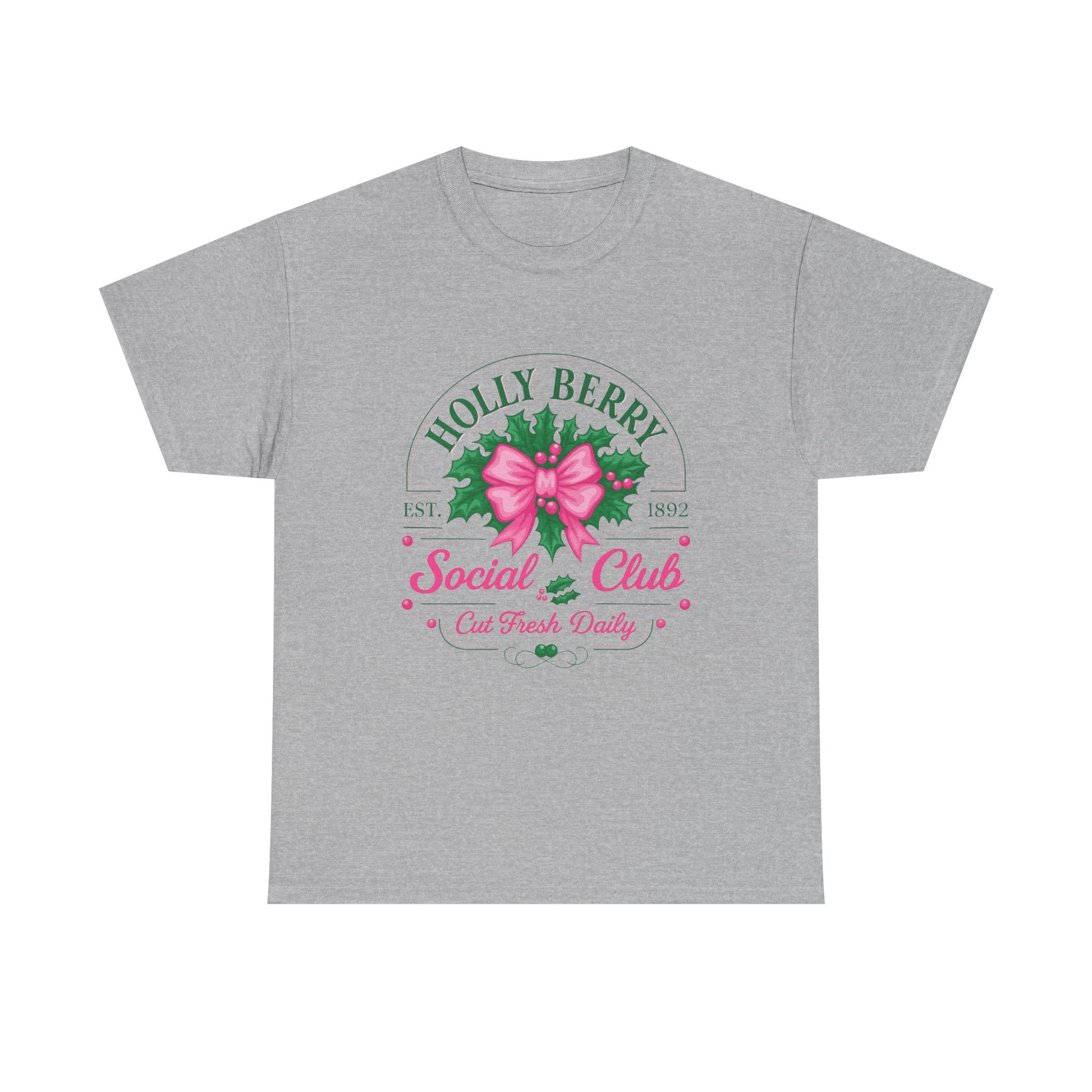 Celebrate with our 'Holly Berry Social Club' tee! This vintage-inspired design features a festive holly arrangement with pink accents.