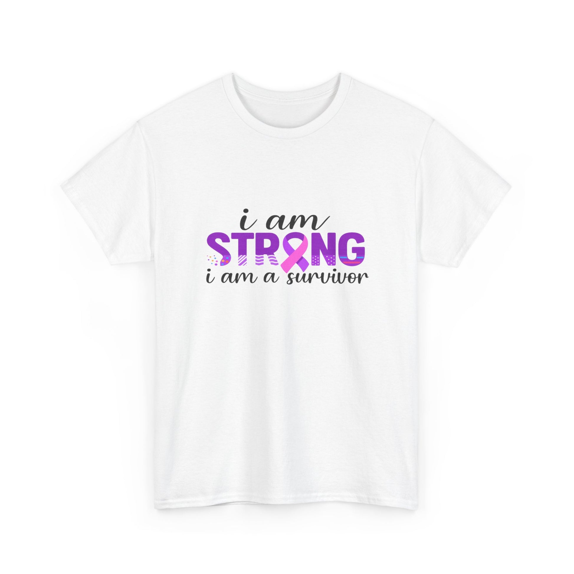 Show your strength and support with this empowering tee! Featuring "I AM STRONG I AM A SURVIVOR" in a stylish design with a dual-tone purple ribbon, this shirt is perfect for cancer awareness campaigns or as a gift of encouragement. Crafted from soft, comfortable material, this unisex tee conveys a message of hope and resilience. Wear it proudly and inspire others on their journey!