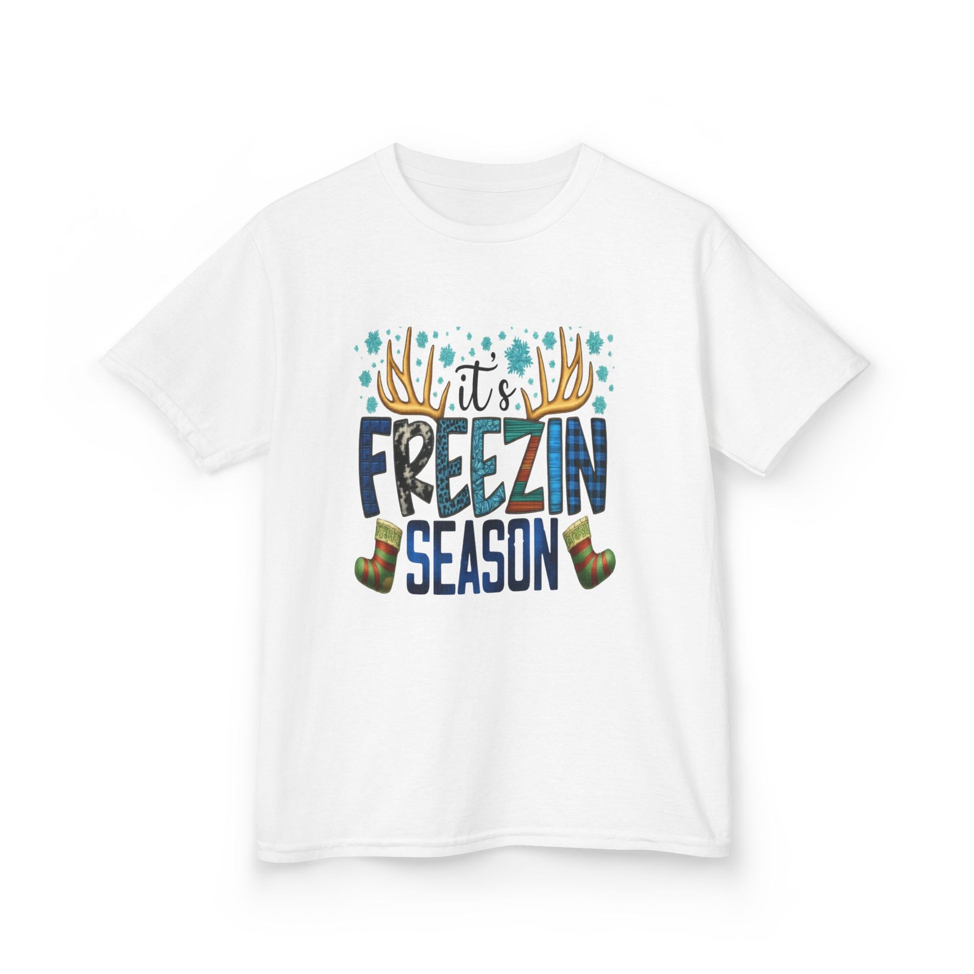Get ready for winter with this adorable "It's FREEZIN' Season" tee! Featuring a playful, hand-drawn design with festive elements like snowflakes, antlers, and Christmas stockings, this shirt is perfect for holiday fun. The vibrant, textured lettering and cool color palette create a cozy and eye-catching look. This comfortable tee is ideal for kids who love dinosaurs and celebrating the winter season, making it a perfect gift!