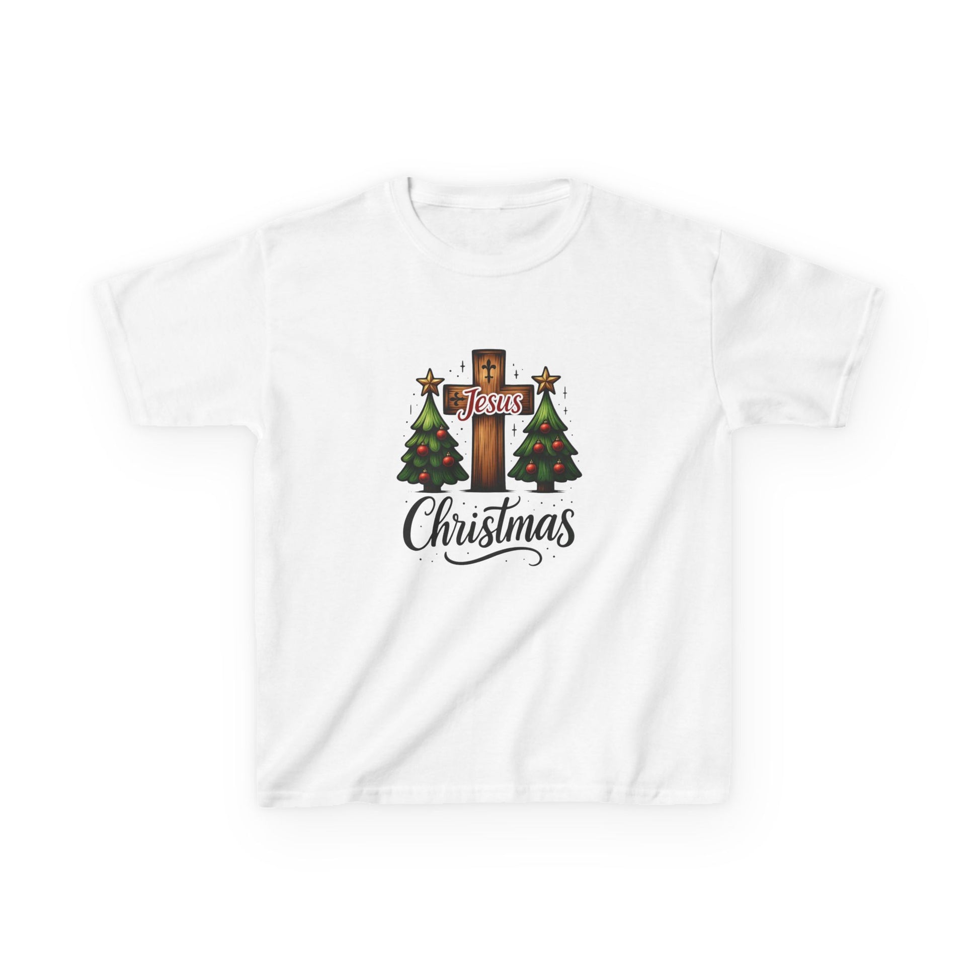 Celebrate Christmas with faith and fun! This adorable tee features a wooden cross with "Jesus" written on it, flanked by decorated Christmas trees. The word "Christmas" is written in a flowing script, and small dots give a festive feel. This shirt is perfect for kids and makes a wonderful holiday gift.